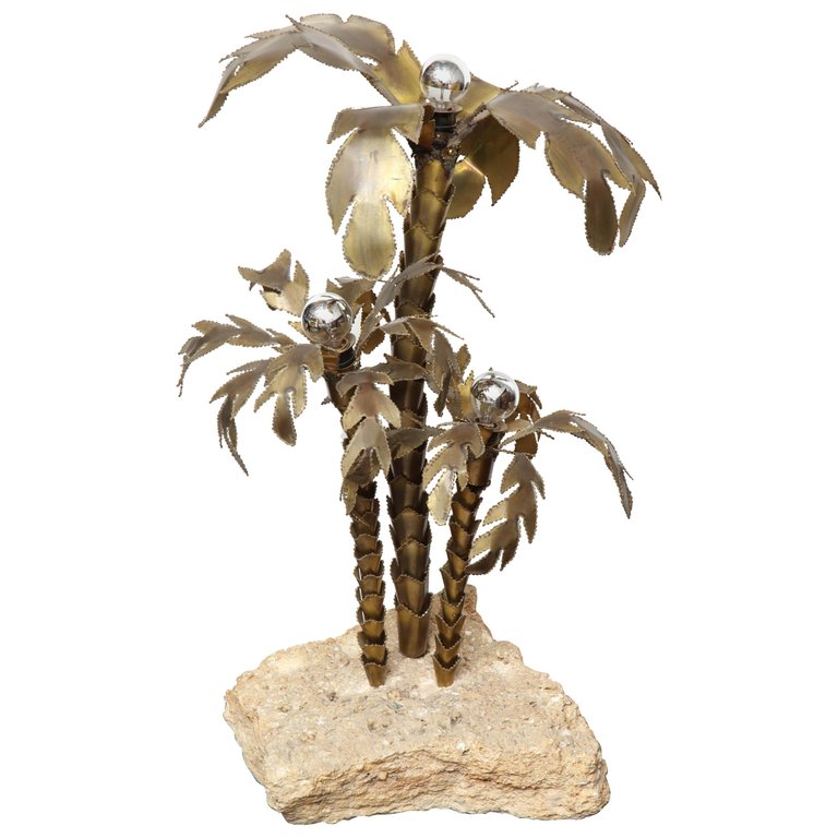 1970's French Brutalist Palm Tree Lamp Table with Natural Stone Base