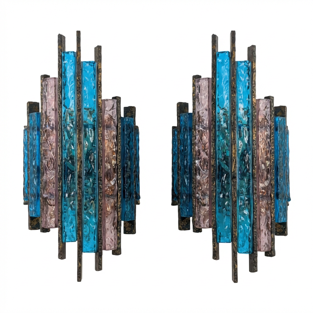 Pair of Longobard Blue & Amethyst Hammered Murano Glass and Wrought Iron Sconces