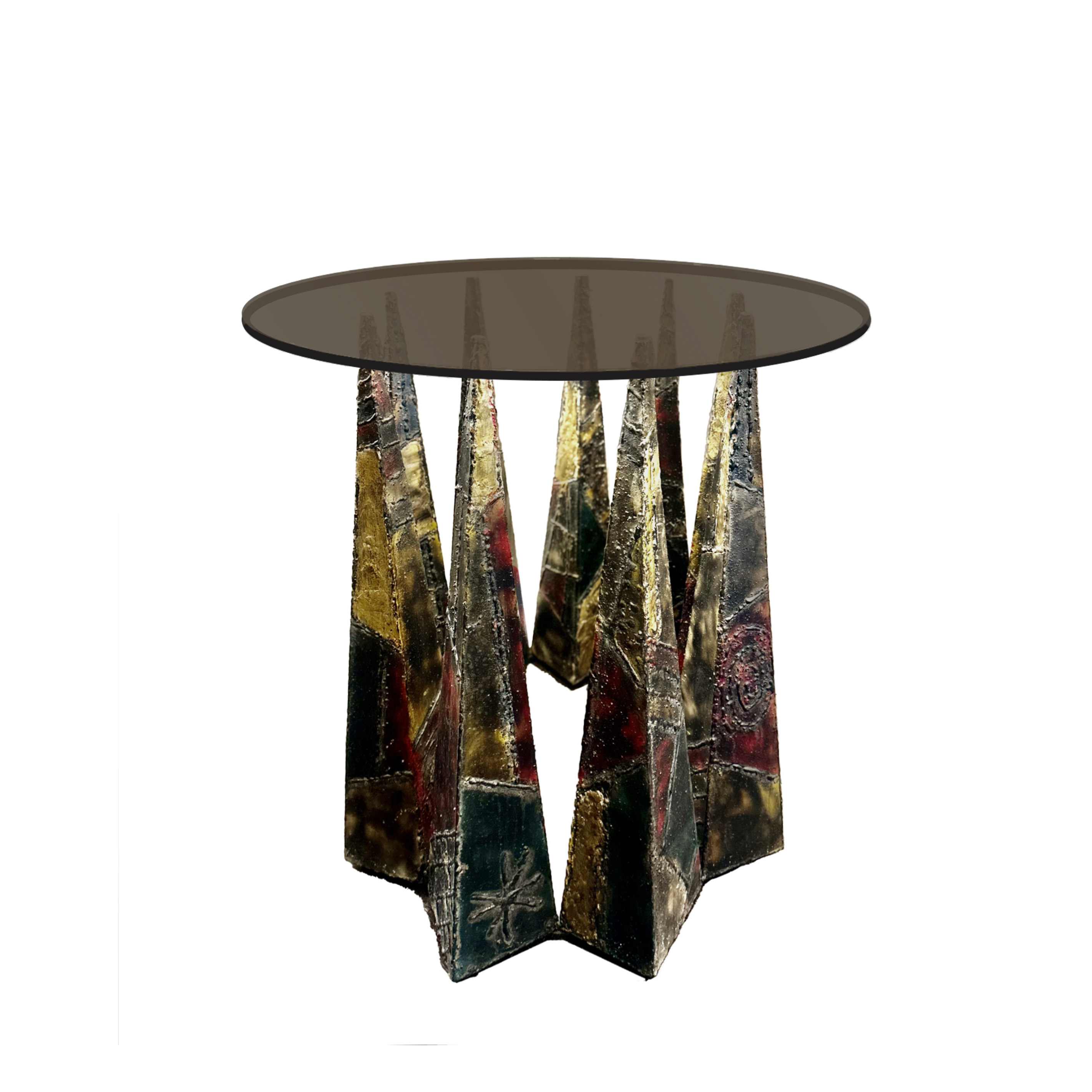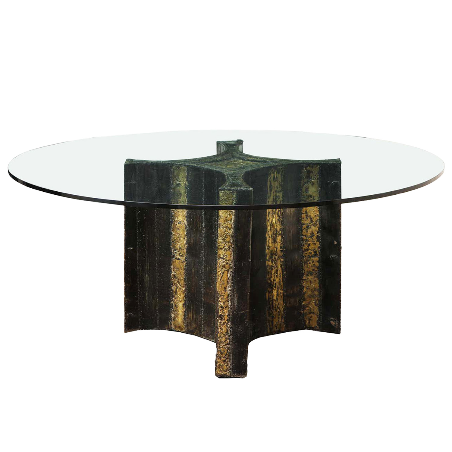 Paul Evans (1931–1987) was an innovative American designer known for his unique furniture that turned mid-century design into art. He primarily worked with metal, creating famous series such as Sculpted Metal, Cityscape, and Argente, using techniques such as hand-welding and torch-cutting.