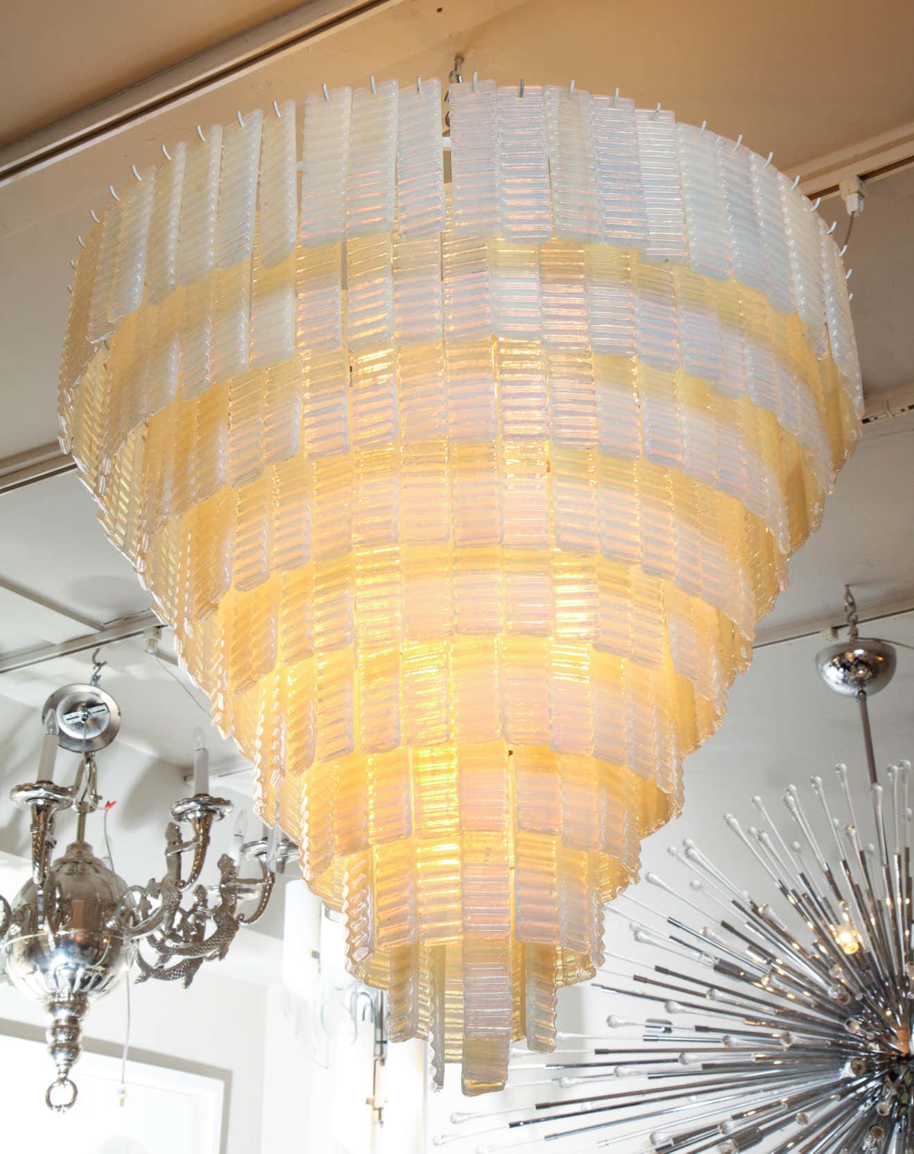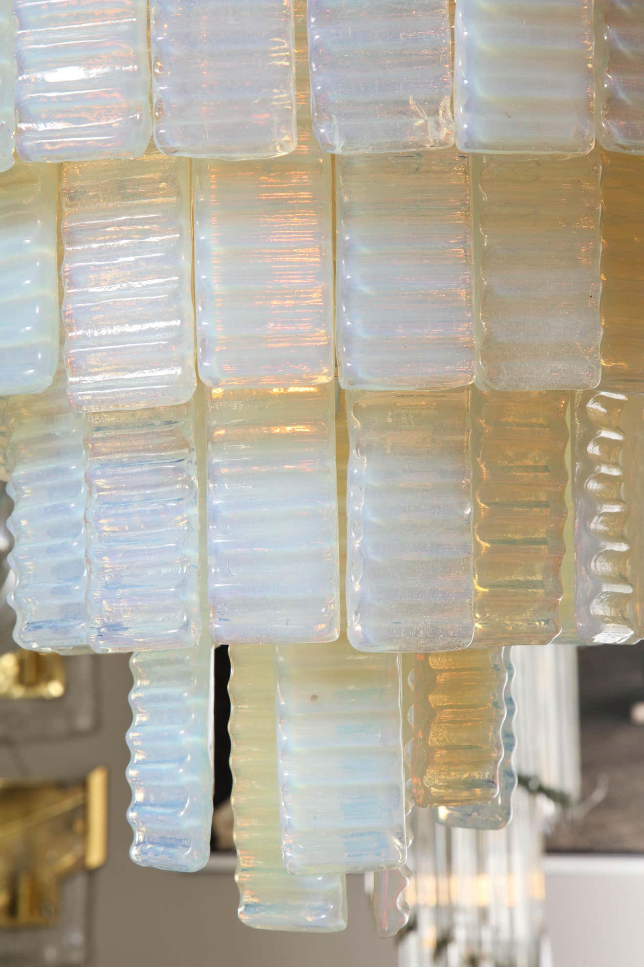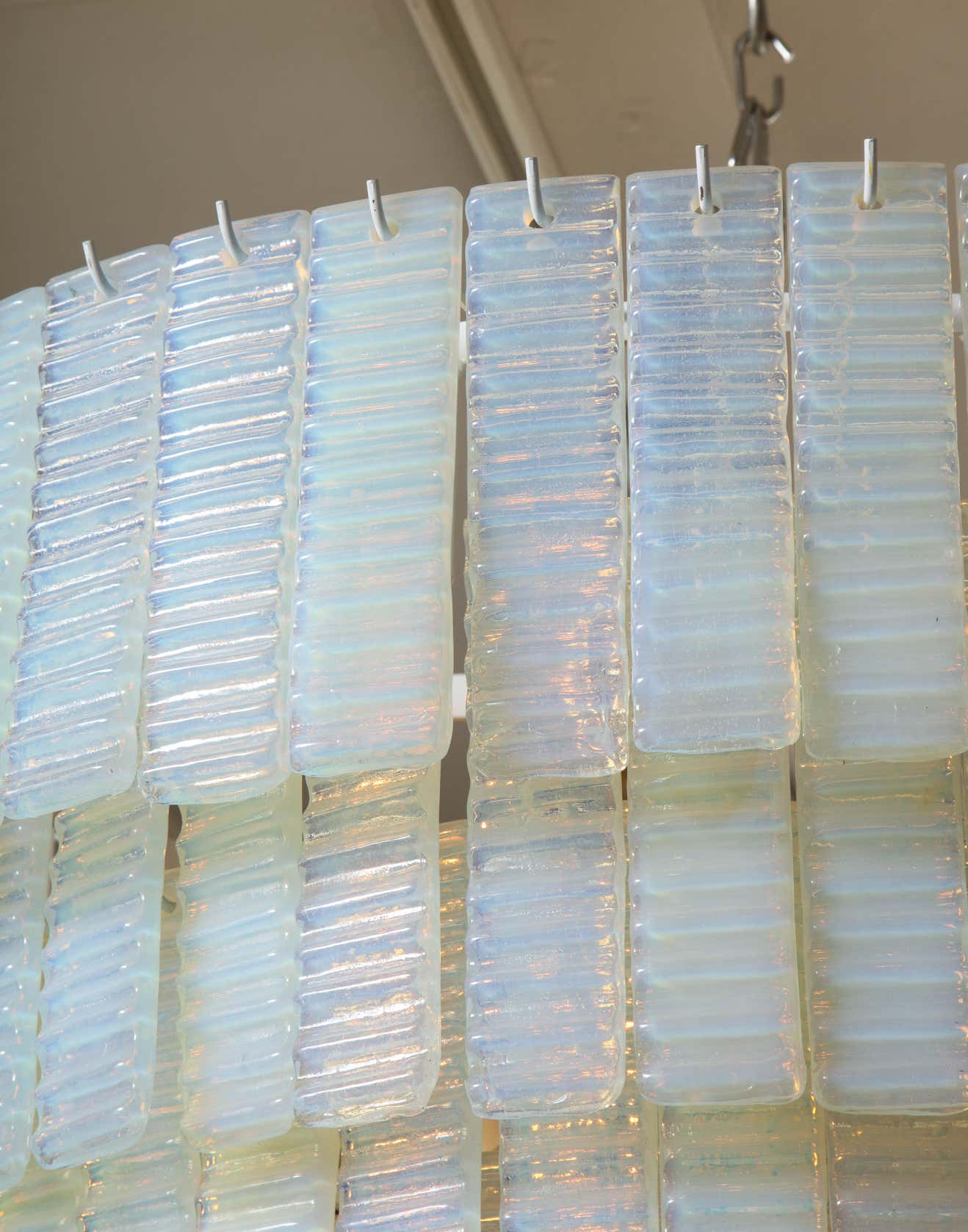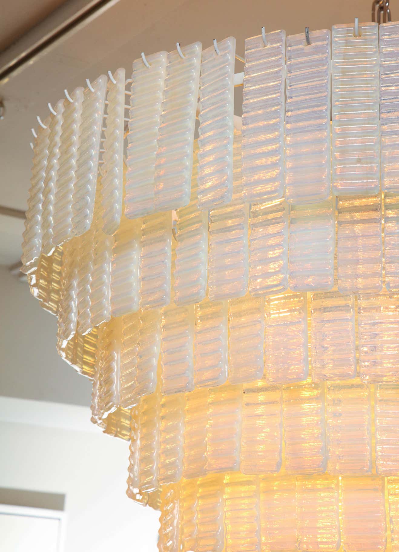 10 tiered corrugated opalescent Murano glass chandelier in a round shape available for immediate purchase. Custom orders are also available for different sizes, shapes, finishes and glass colors.