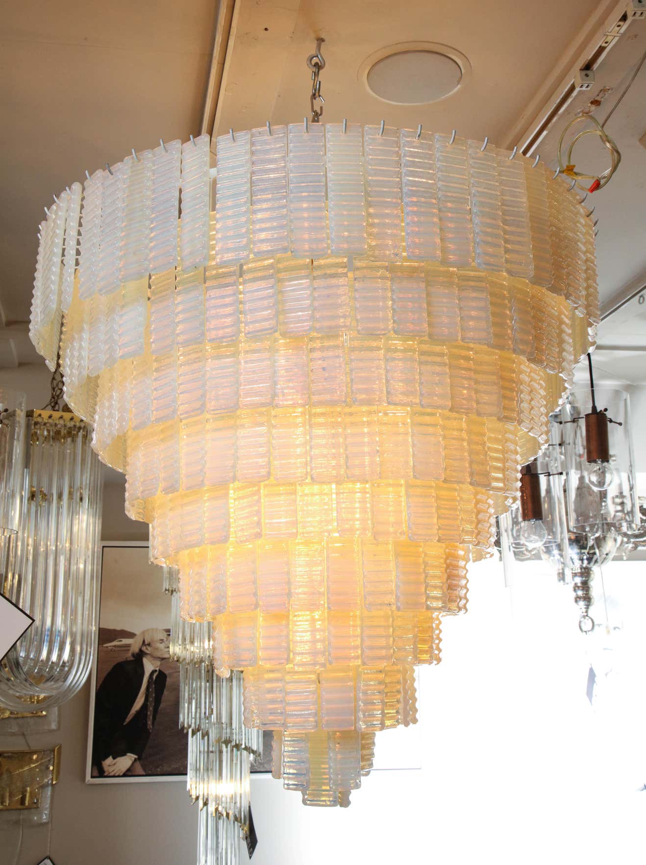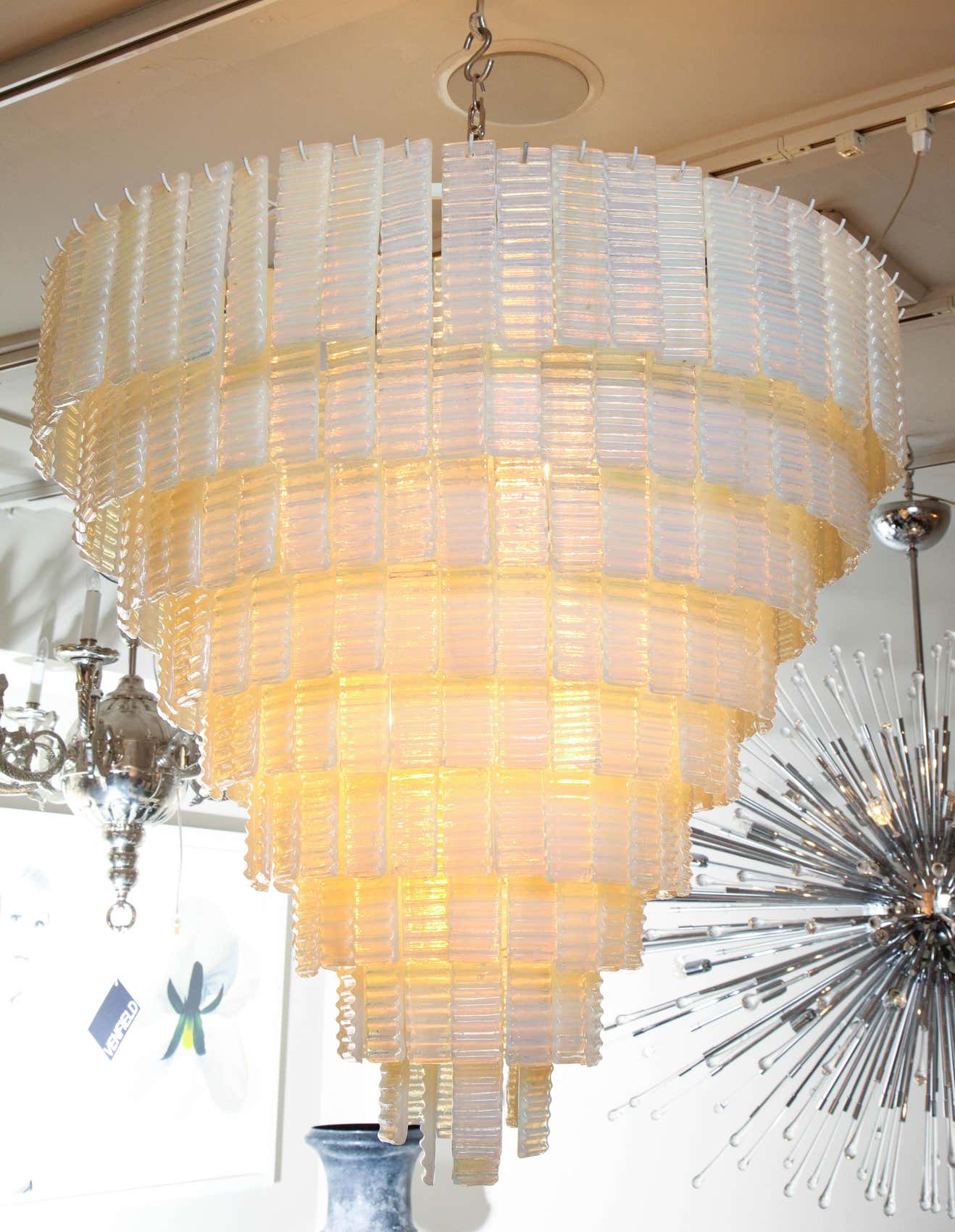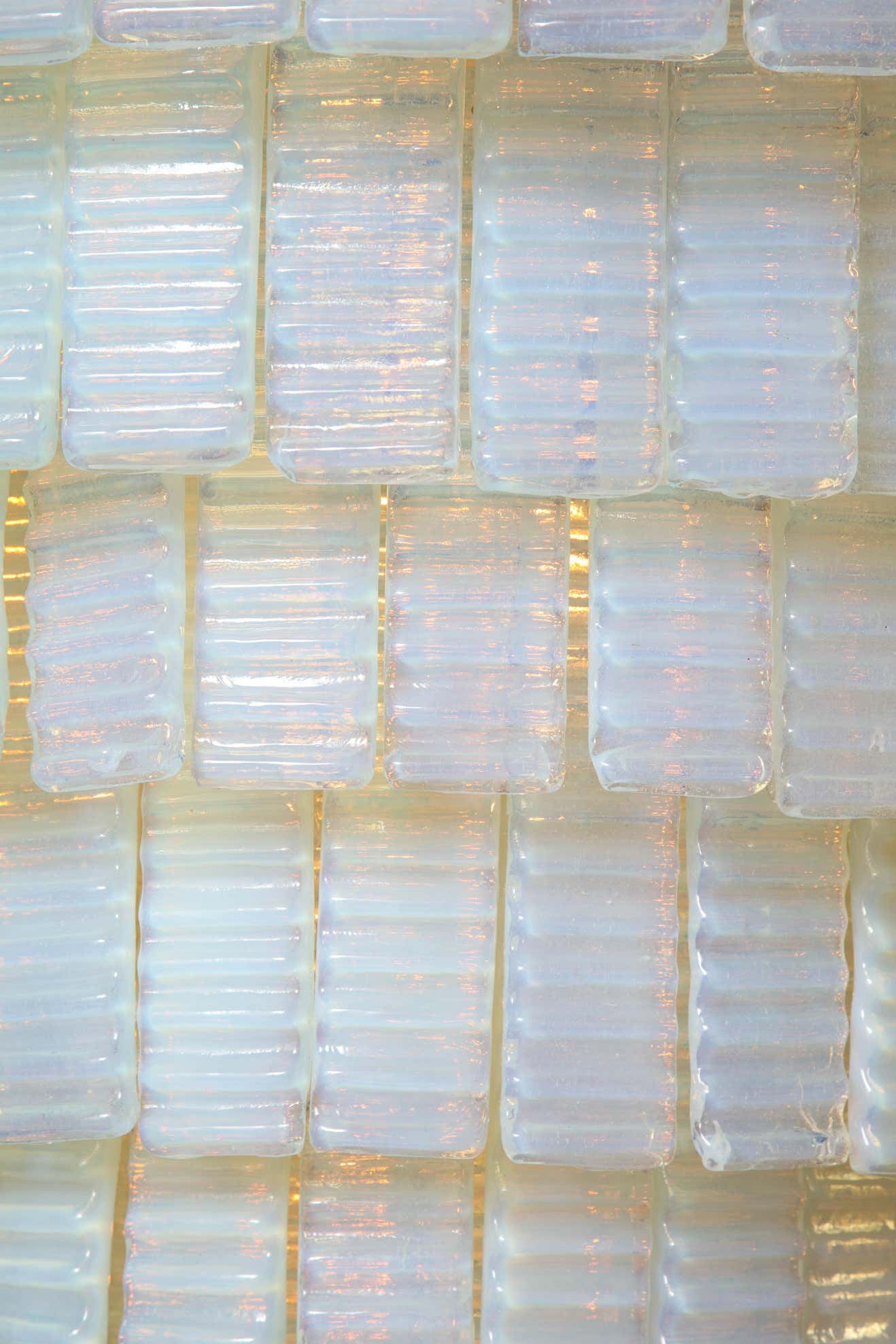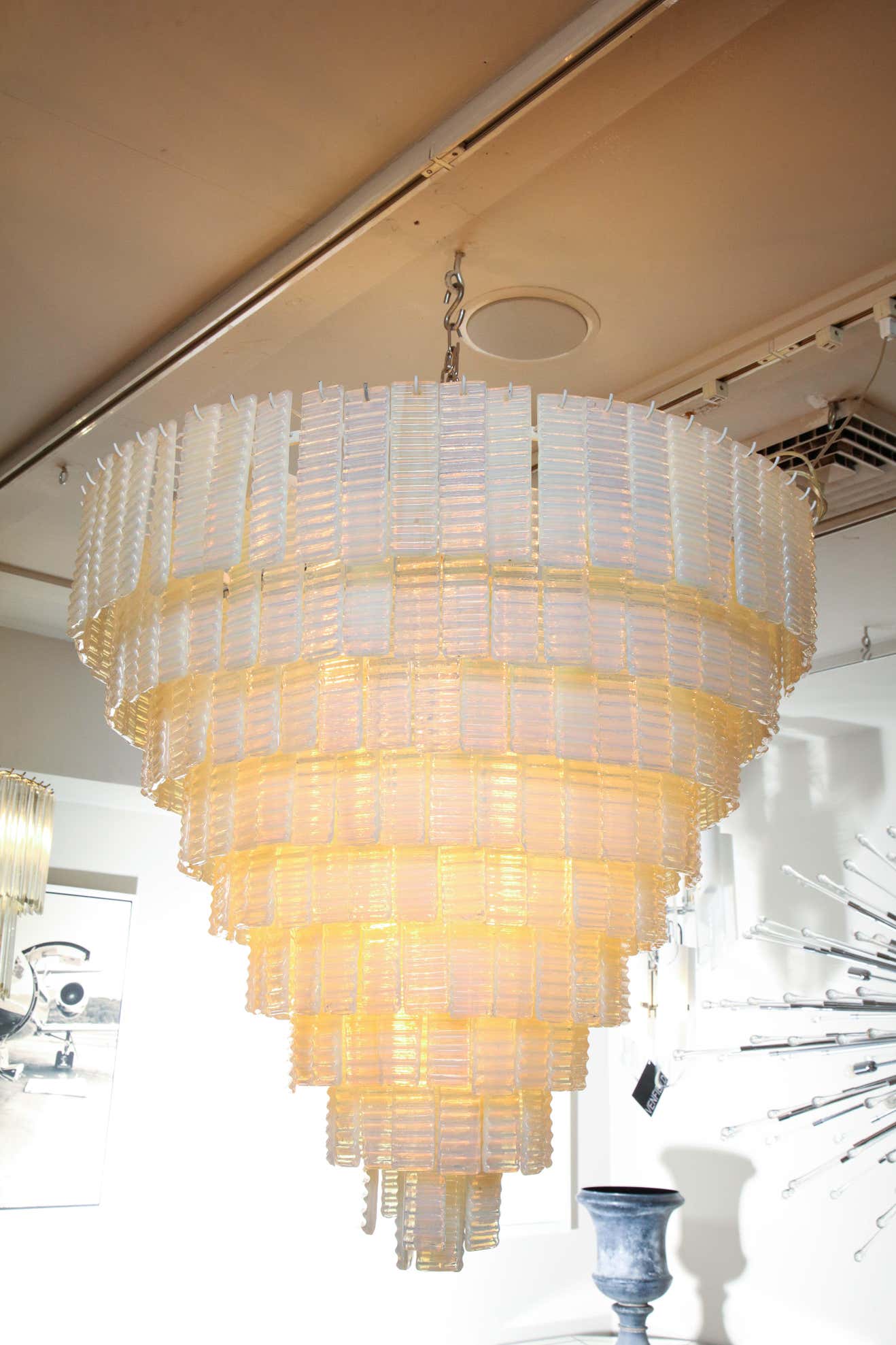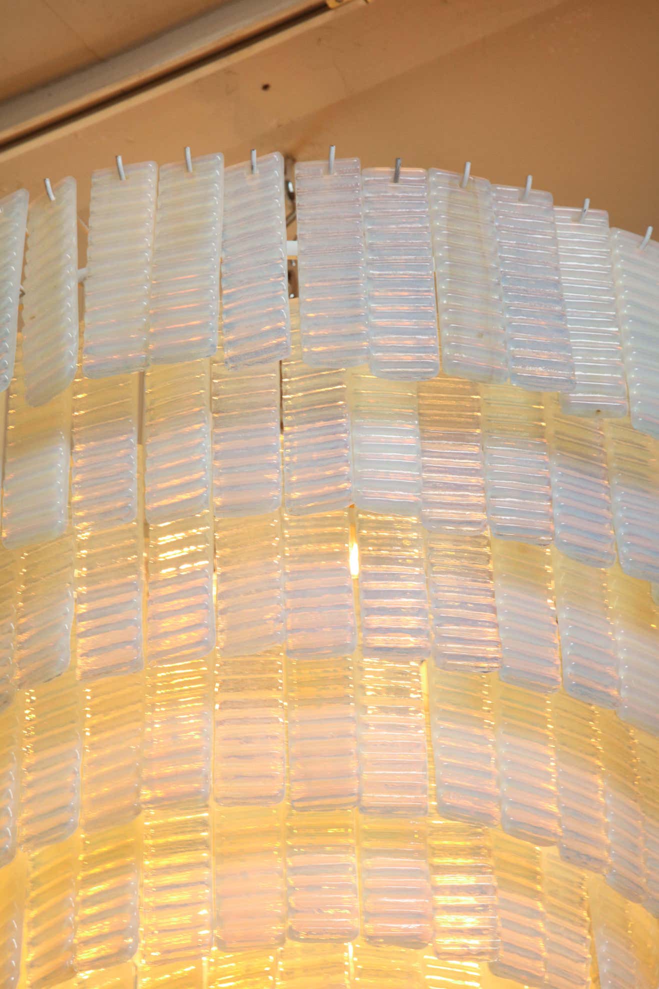 10 tiered corrugated opalescent Murano glass chandelier in a round shape available for immediate purchase. Custom orders are also available for different sizes, shapes, finishes and glass colors.