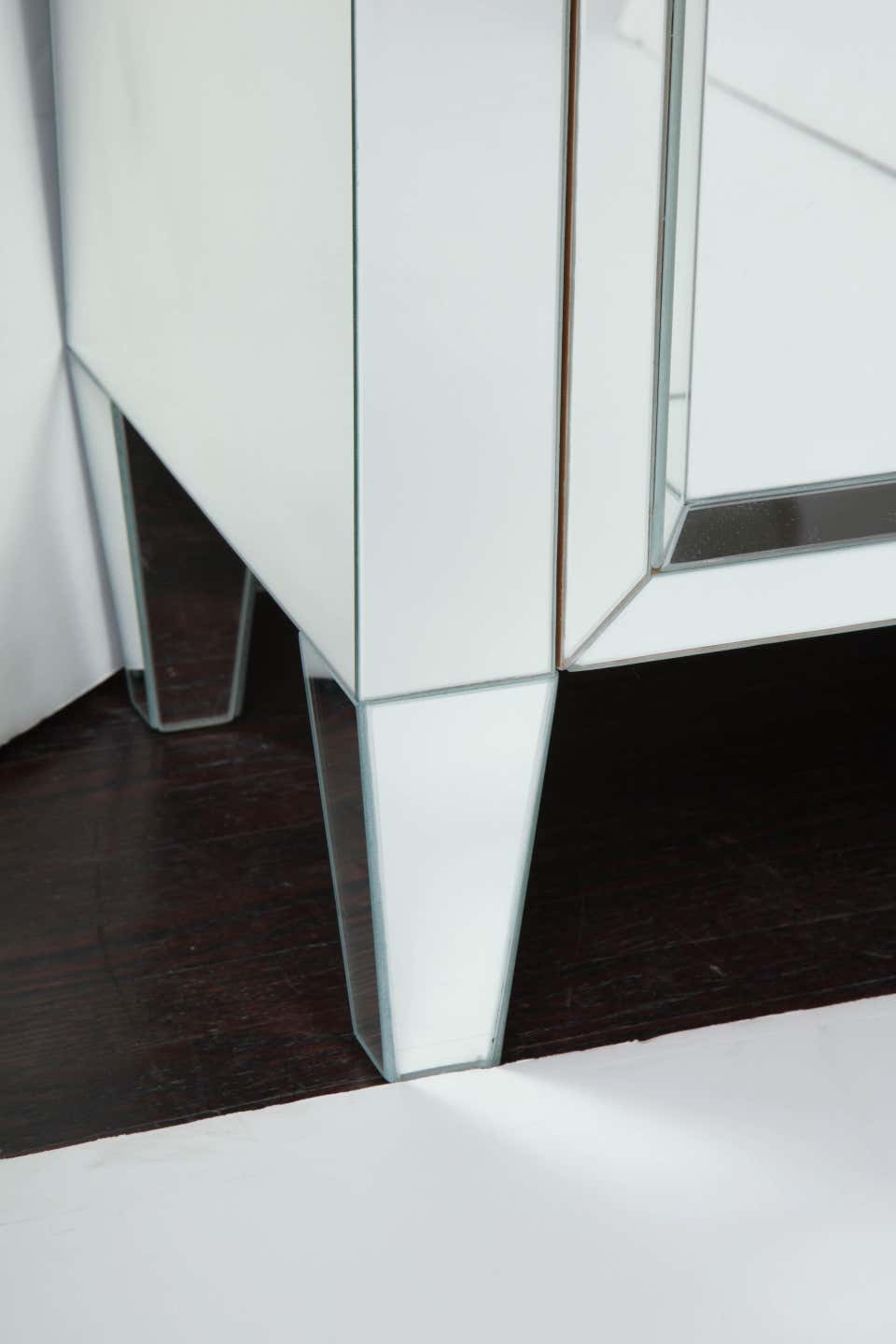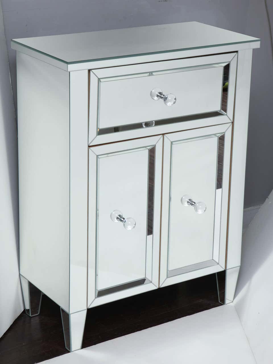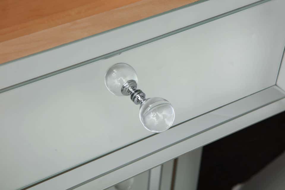 Custom 2-door mirrored nightstand with a single drawer. Customization is available in different sizes, hardware, and mirror finishes. Currently out of stock but available for custom order. Please inquire for estimated production lead times.