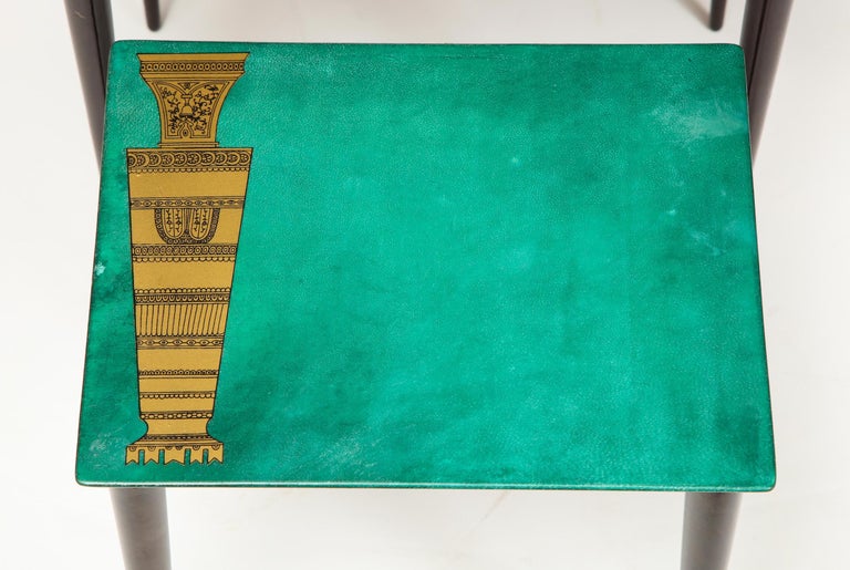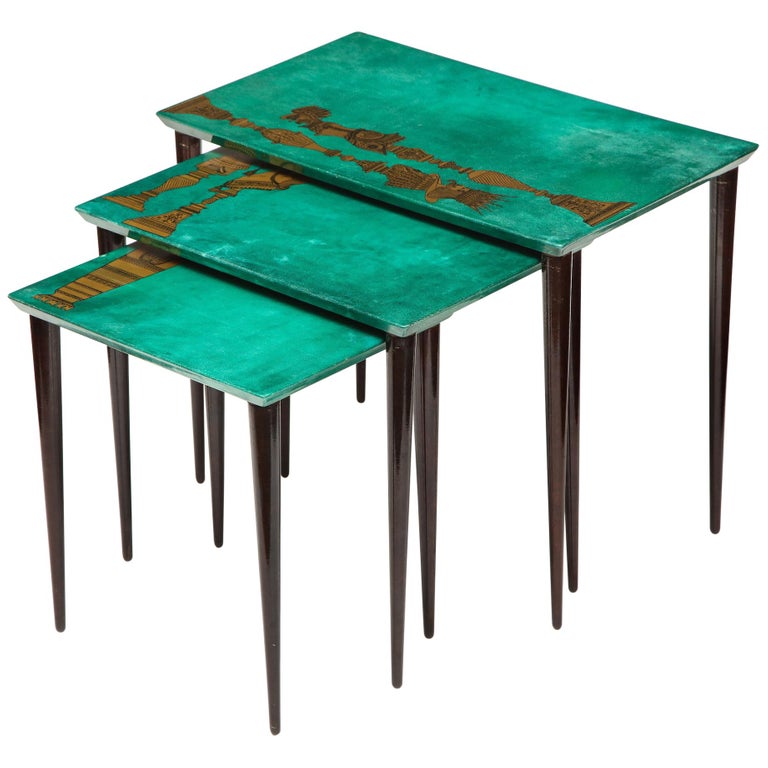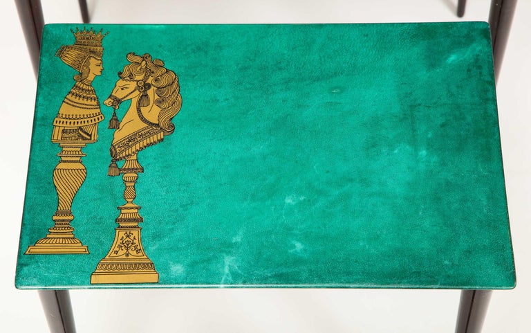3-piece emerald leather nesting table set by Aldo Tura. Each table top has beautiful chess piece gold print design. The sizes are x x x x x 12-1/ x H from the largest to the smallest.