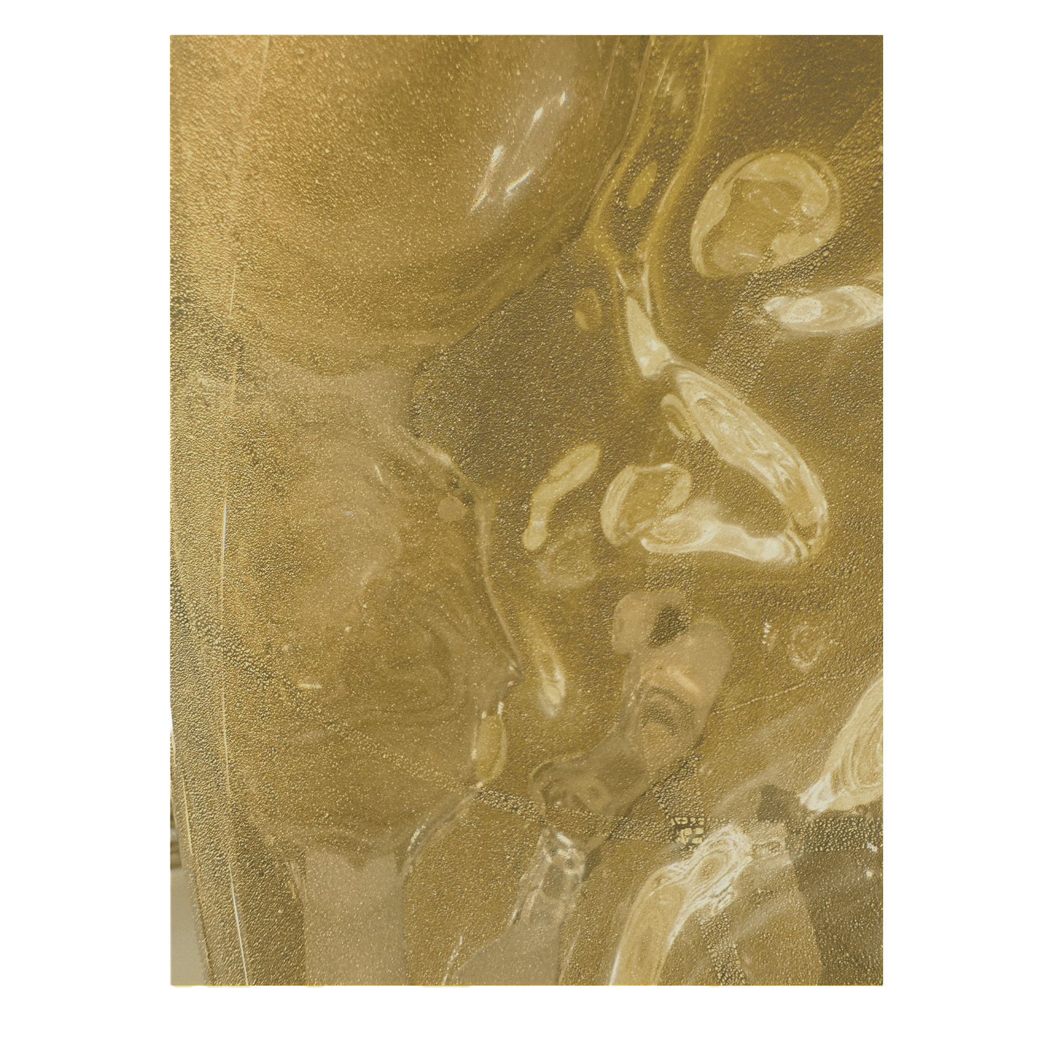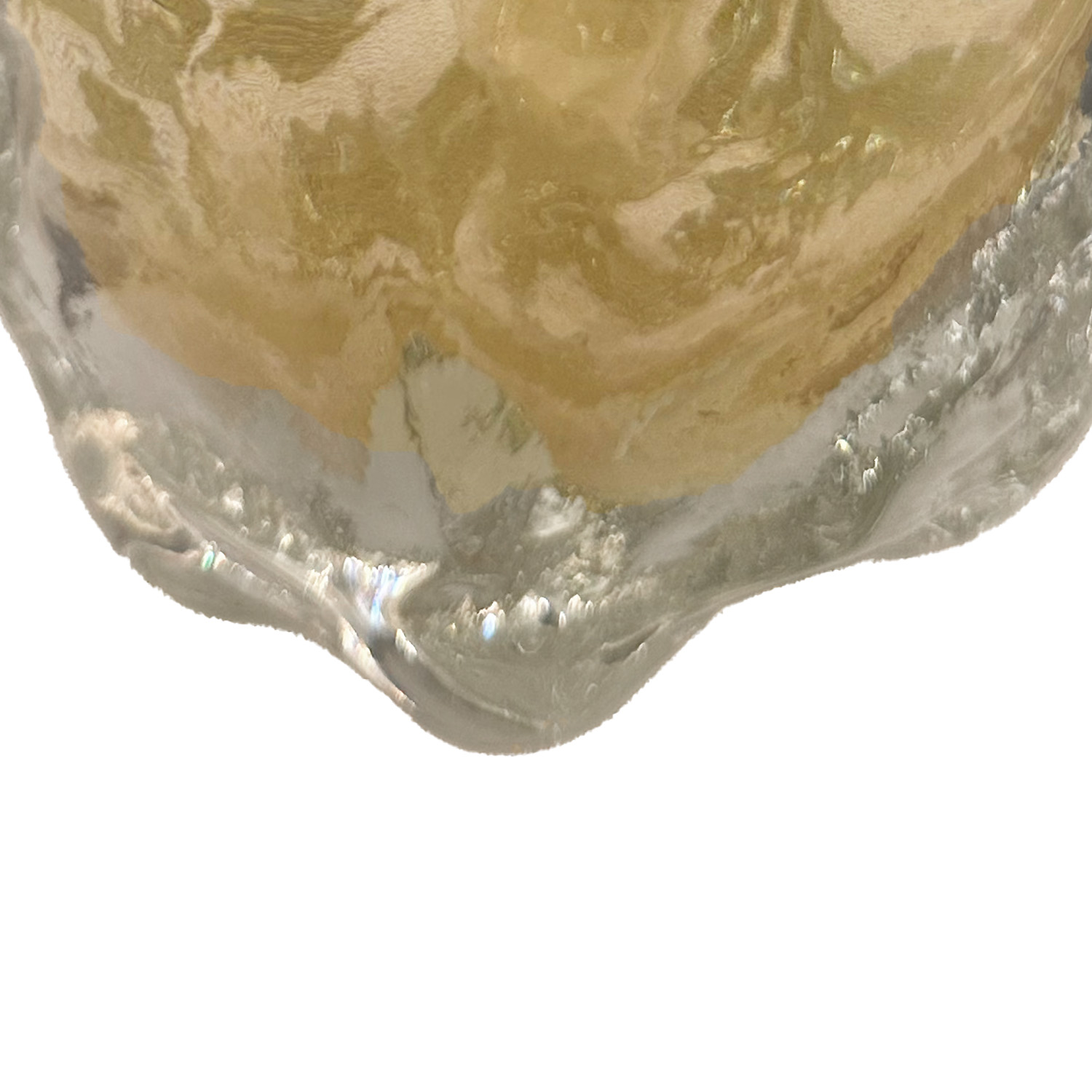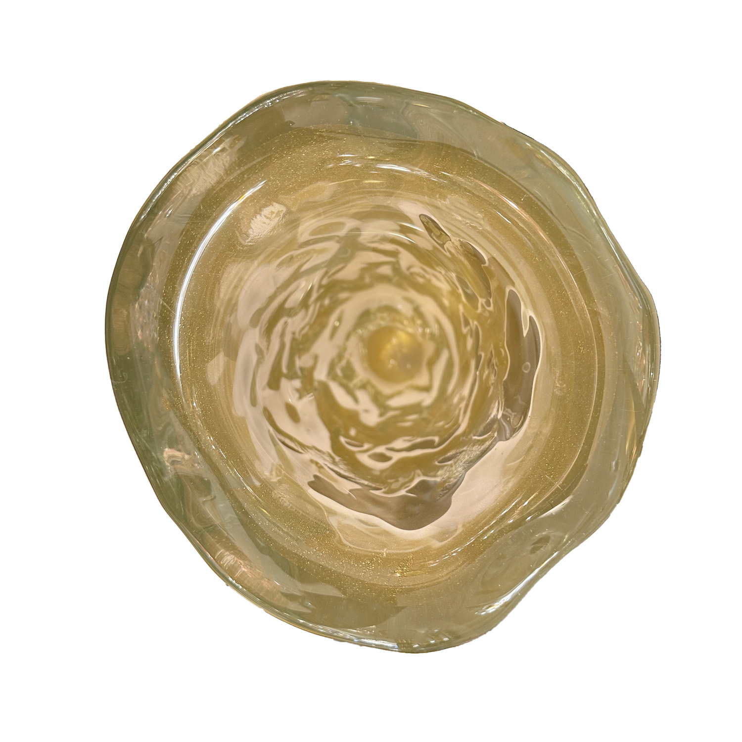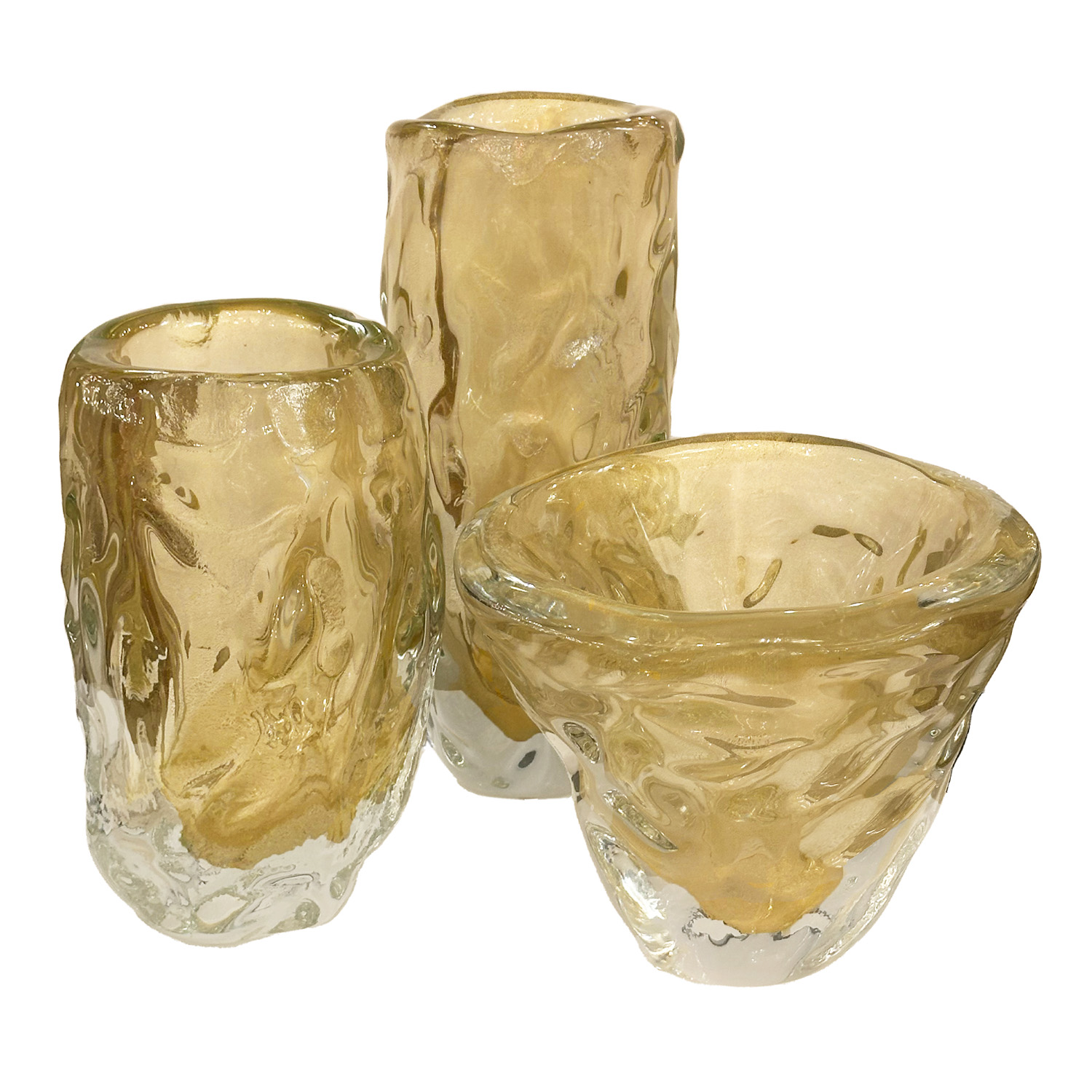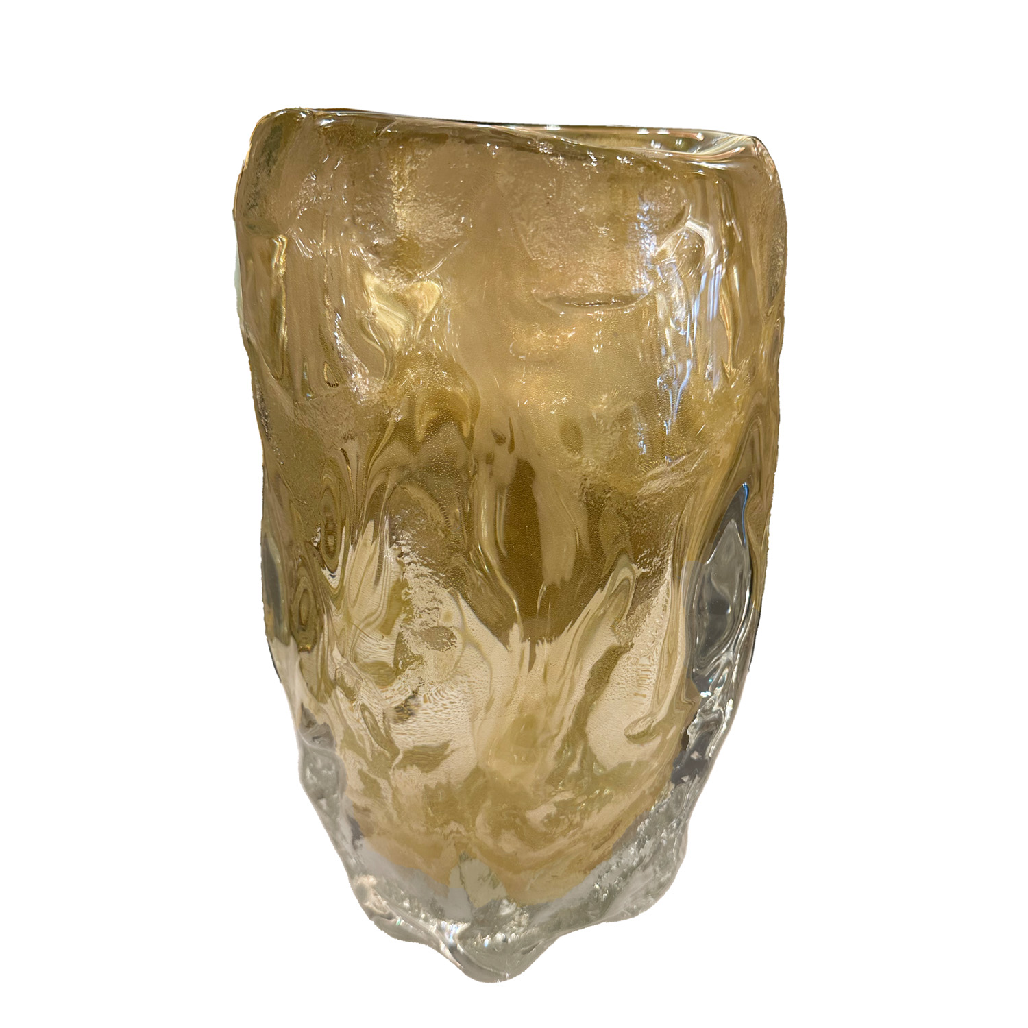 Embodying the legendary craftsmanship of Murano's glassmakers, this exquisite, hand-crafted Murano glass vase showcases the unique Sommerso technique with the addition of aventurina. The shimmering gold hue created is mesmerizing as it captures the changing light. The undulating surface of the glass lends a touch of modern abstraction that elevates its appearance. Whether displayed alone or as a set with the other Burri vases available from this collection, it is sure to captivate. x 10' H & Tall 7. x H. Priced andsold separately.