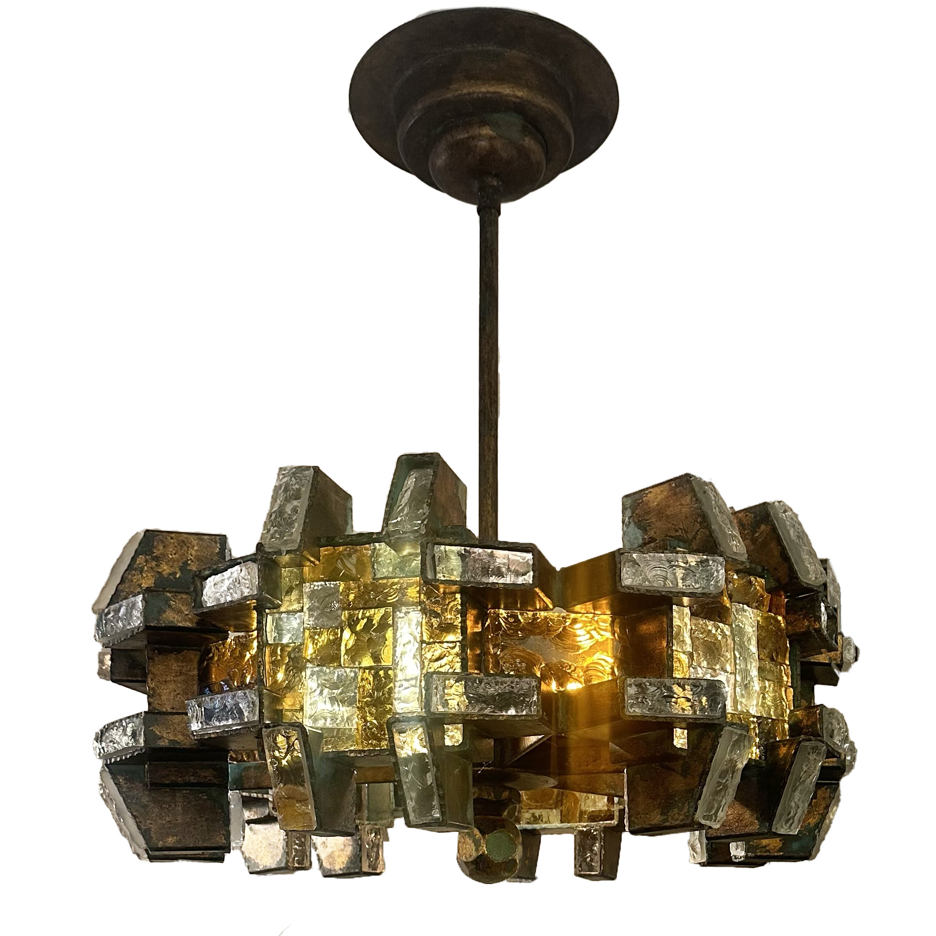 Recognized as a prominent artist and lighting designer of the mid-20th century, Albano Poli's work is noted for its unique designs that are a combination of artistic expression and functionality. His visually striking pieces, like this hexagonal chandelier of wrought iron and hammered glass, can best be described as sculptural, making it not just a source of light but a work of art as well. Here, Amber, Topaz and green Murano glass are used to create sparkling mosaics backlit by six lamps that emit practical light up and down.