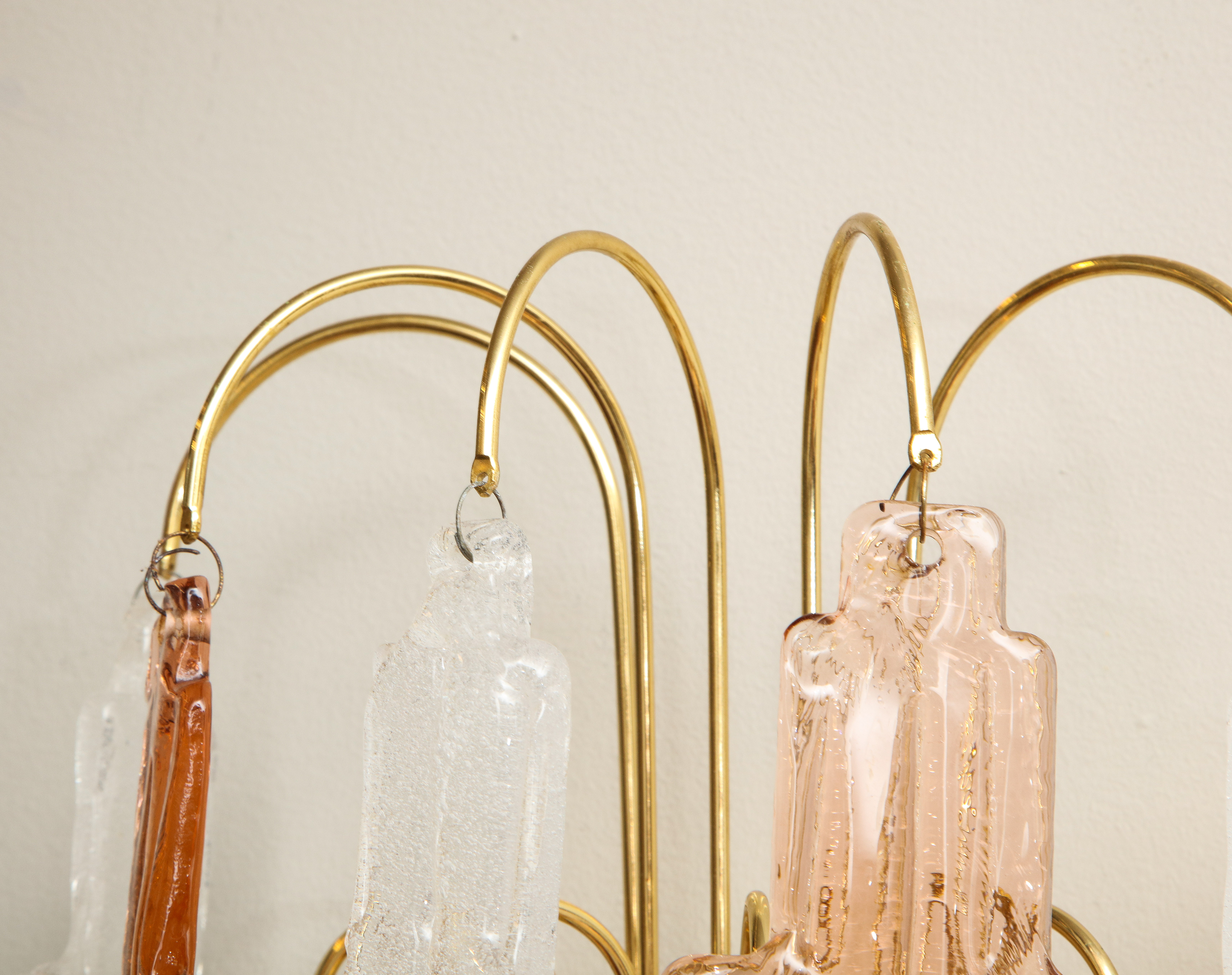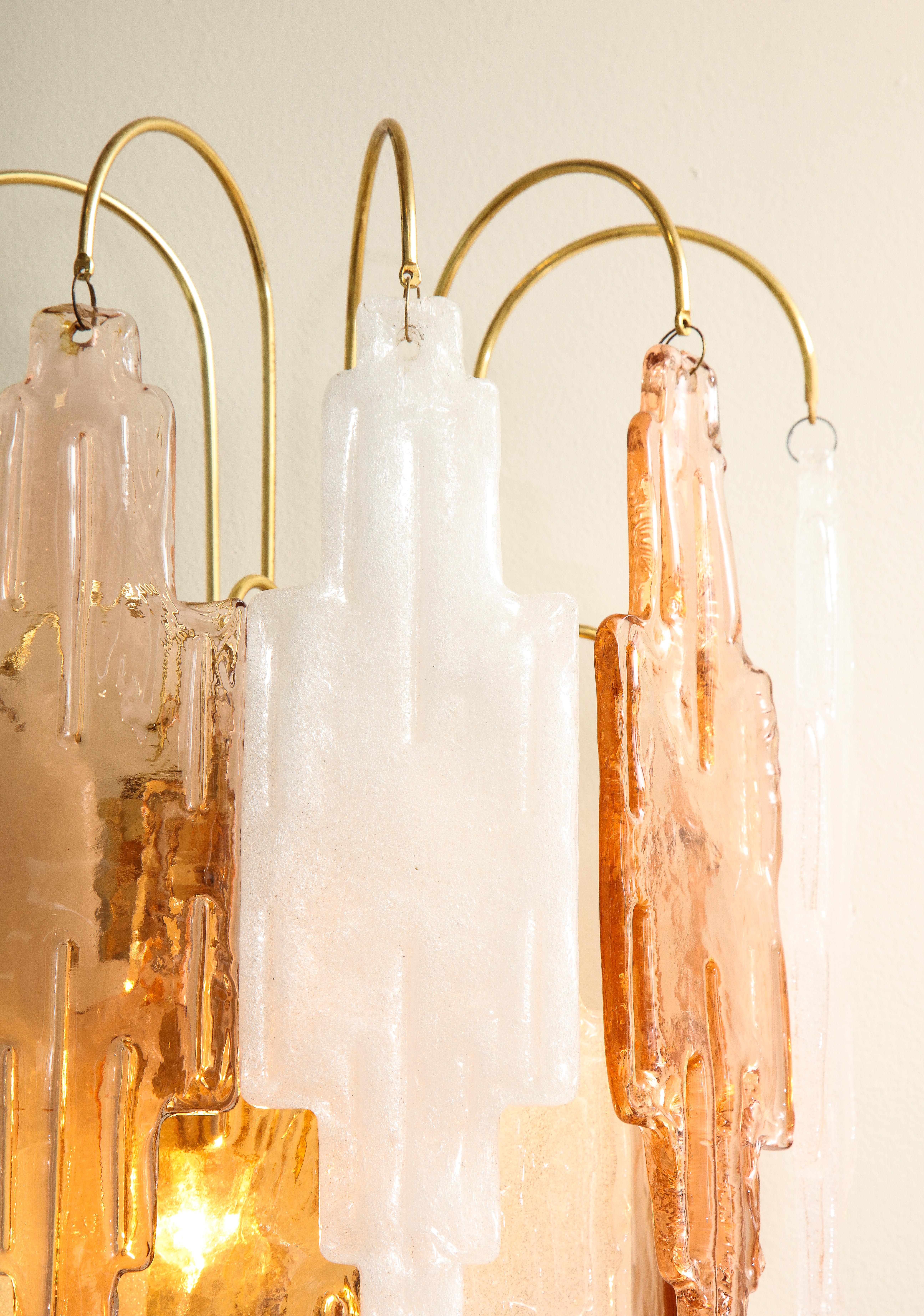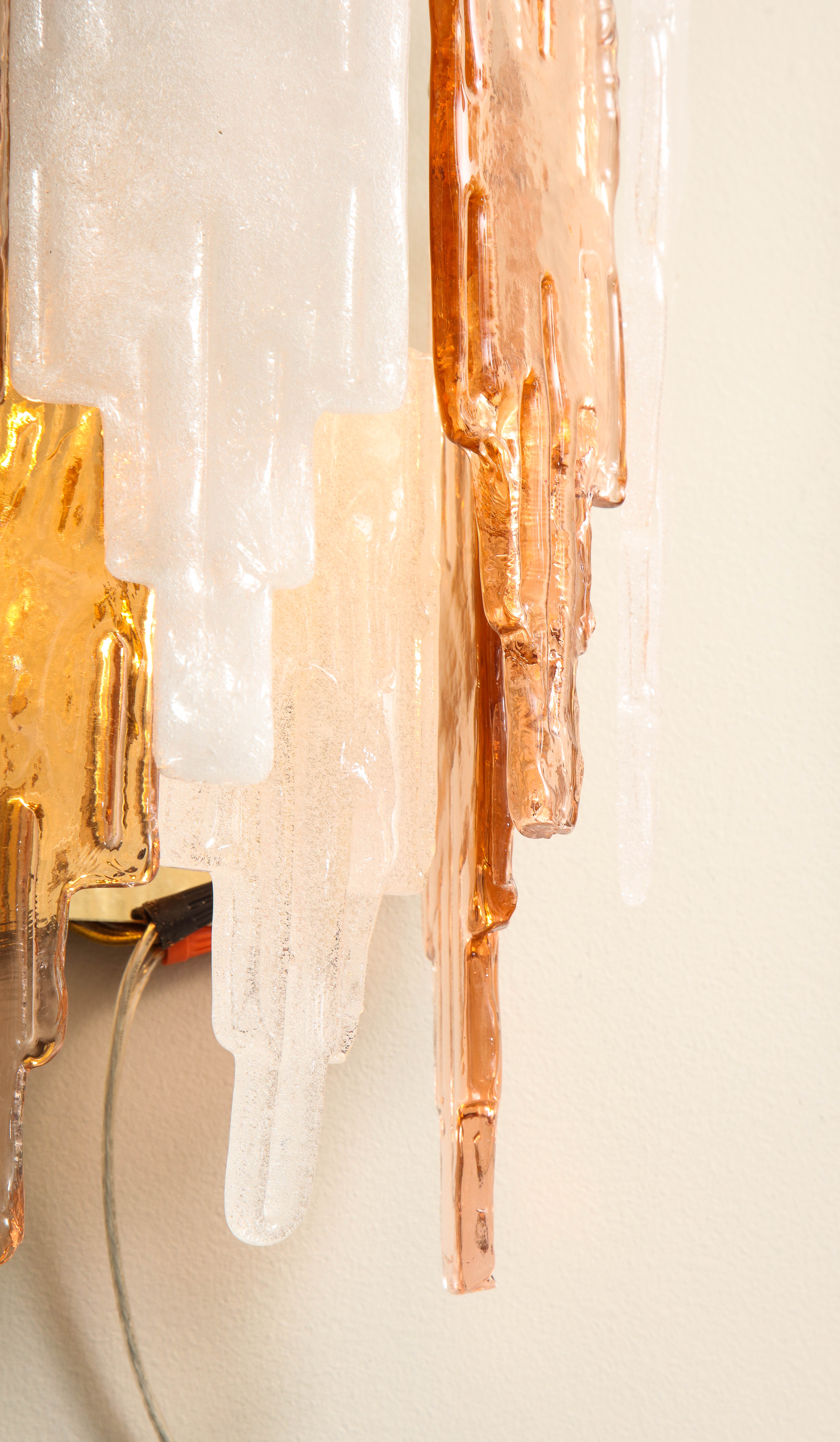 Elegant pair of Murano glass Art Deco style sconces in rare bicolor peach and frost glass by Albano Poli for Mazzega Murano. Italy 1970's.