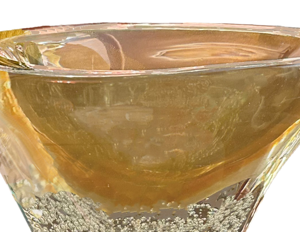 An exquisite Murano blush and amber sommerso glass vase with gold inclusions that seamlessly transitions into a pool of clear glass with bullicante. The vase's abstract color gradient and tiny bubbles create visual texture while the organic form of the thick smooth glass lends an air of modern sophistication. A mezmerizing and elegant addition that will enhance any interior.