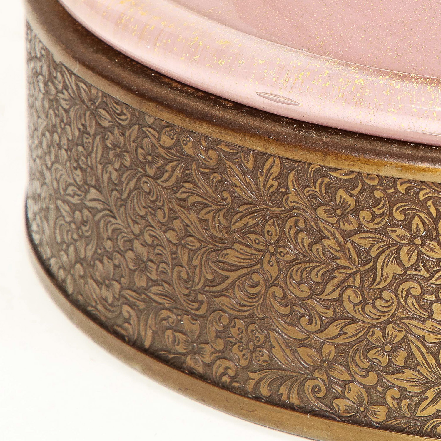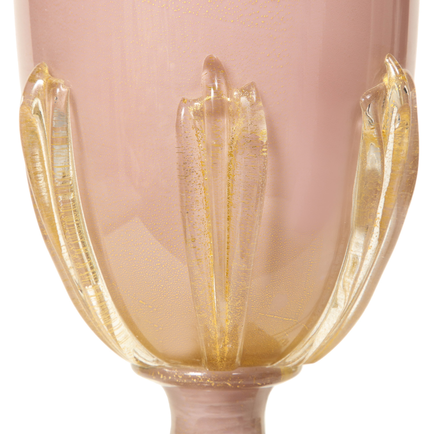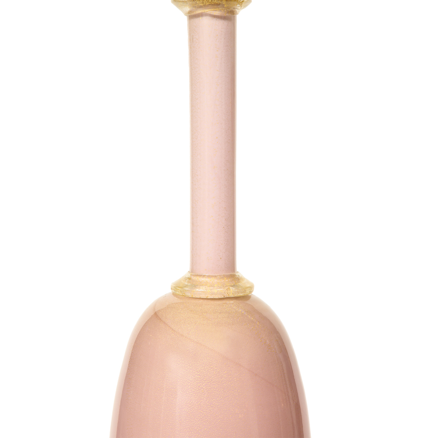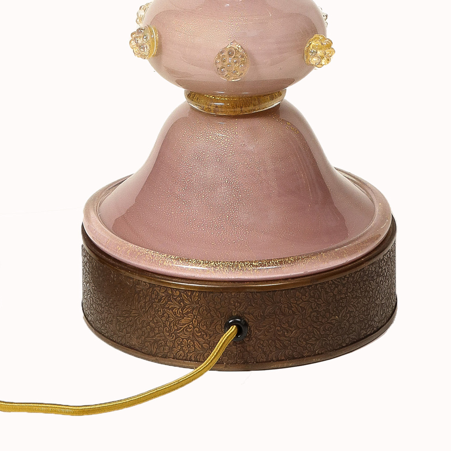 Hand-blown blush color Murano glass table lamp adorned with clear glass ornamentation and avventurine throughout. Burnished brass base is decorated with an etched floral motif. 34" is from the bottom of the base to the top of the socket. Italy 1960s.