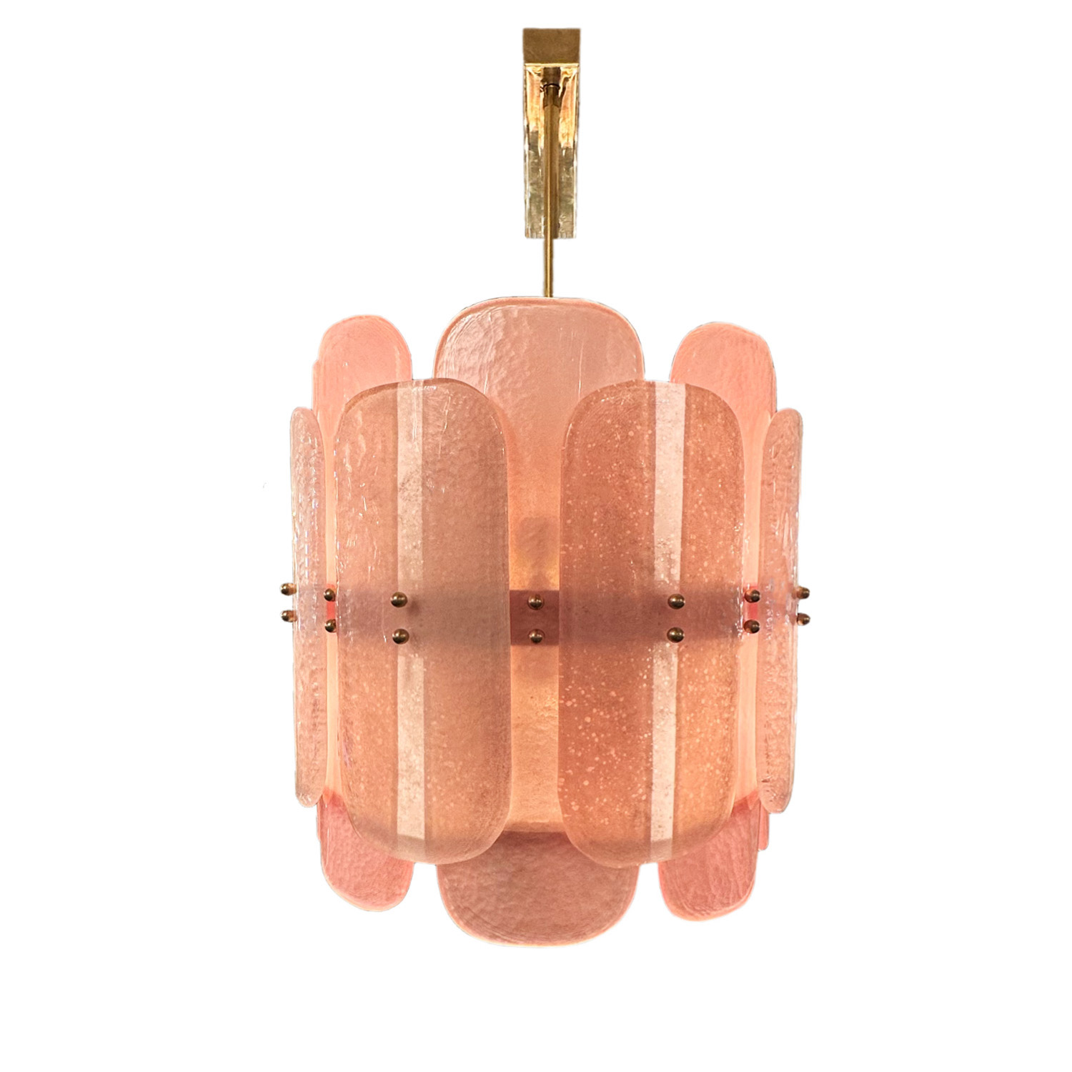 Elegant linear Murano glass tile pendant fixture with unlacquered brass frame and canopy. Each gently curved and overlapping glass tile is fastened to the frame with two matched finish ball finials. An opaque glass diffuser running the length of the fixture, softens the light emitted from 6, 60 watt sockets.