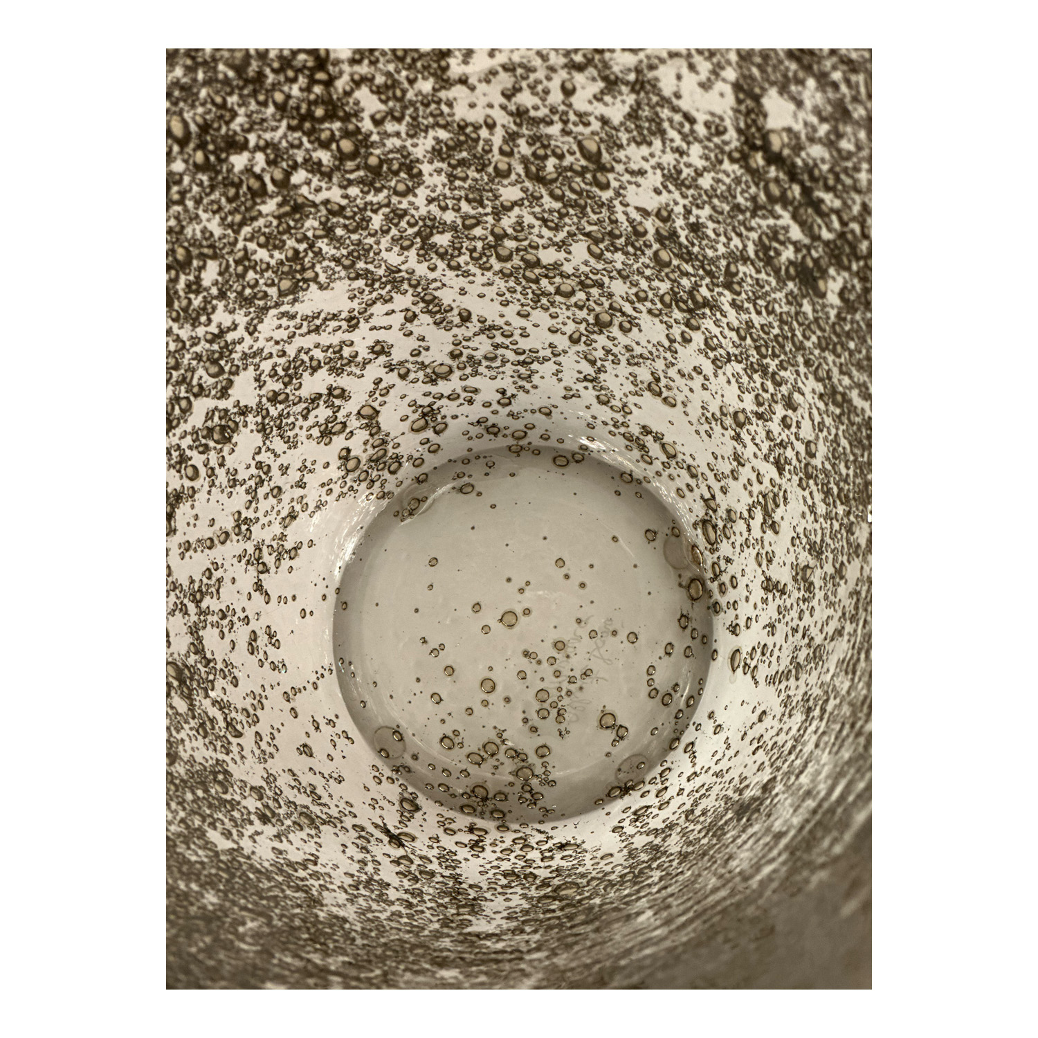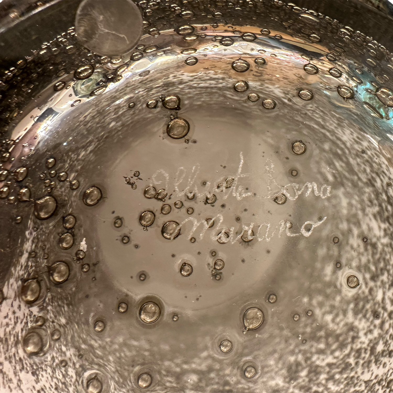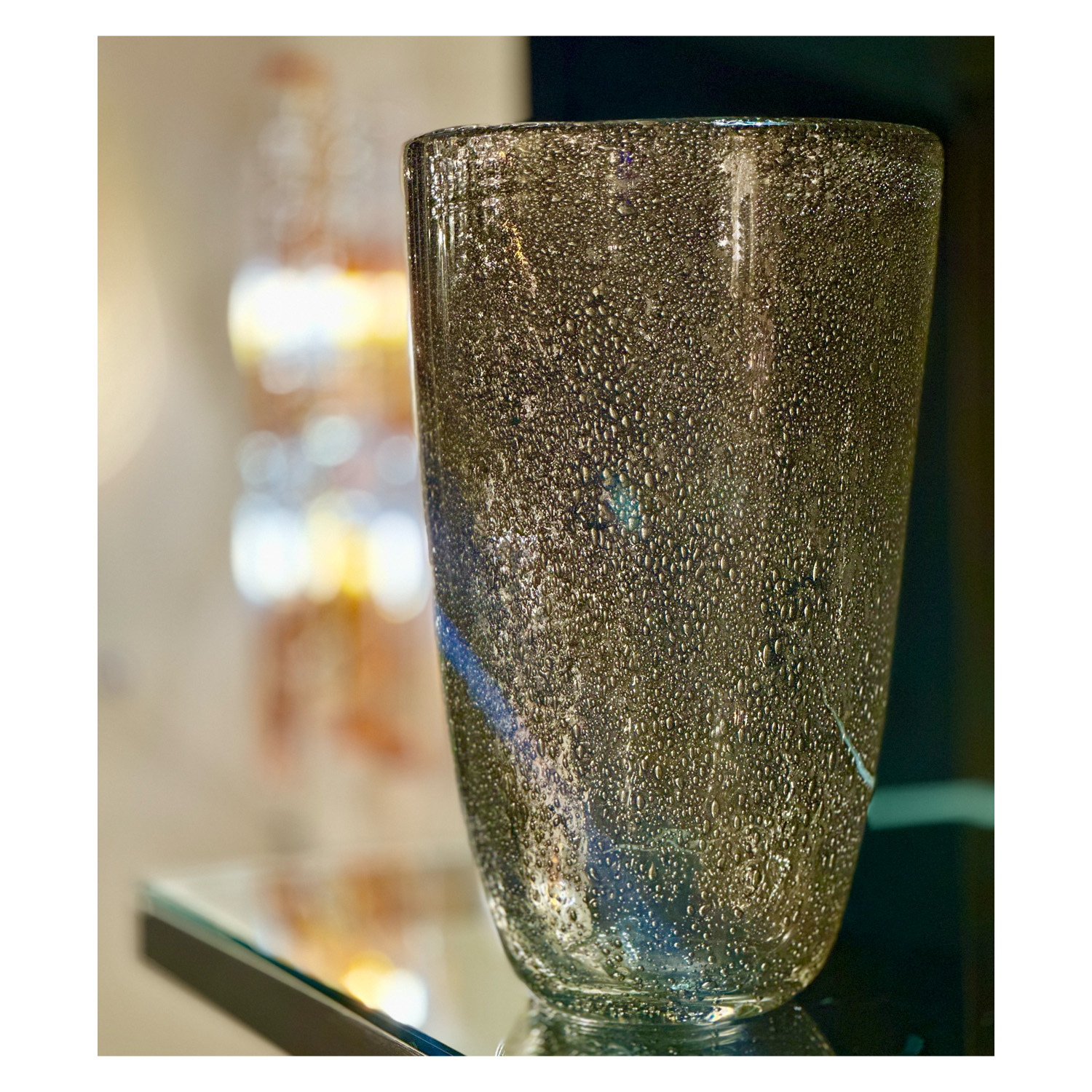 This visually intricate, handcrafted piece is a combination of contemporary design and classic Murano glass-making technique. The result is a stunning and elegant piece of glassware and an exquisite piece of craftsmanship. The implied texture created by the thousands of metallic bubbles against a clear backdrop creates a unique stand-out work of art. Currently on display in our NYC showroom.