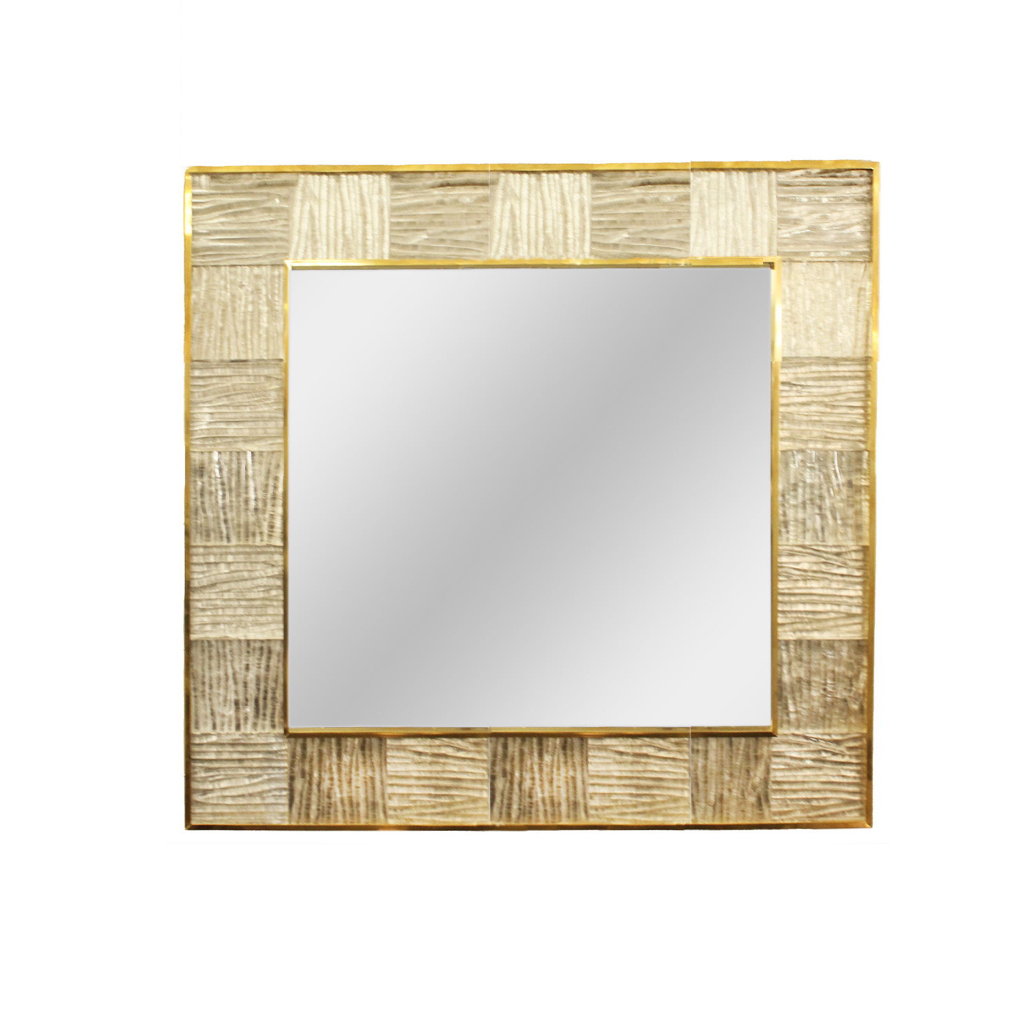 Hand crafted Murano glass square tile and brass framed mirror. Italy. This mirror is currently available as shown in our NYC showroom. Custom Art glass available in additional colors. Lead time is 7-8 weeks. Please inquire with Venfield.