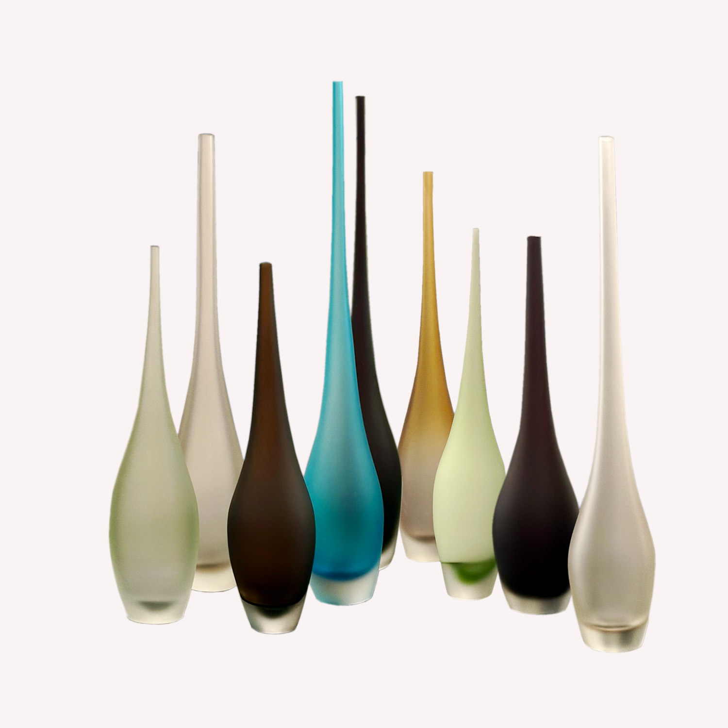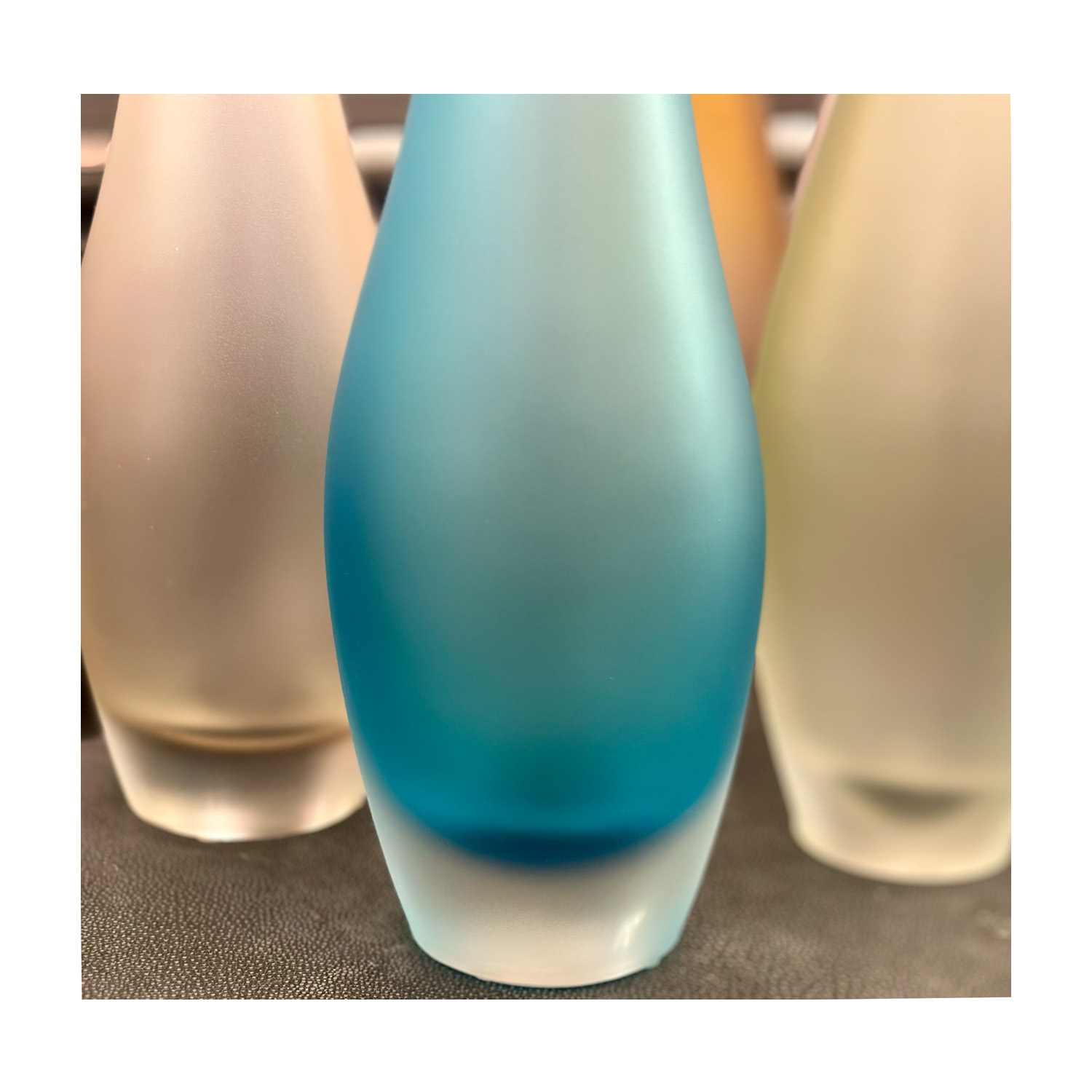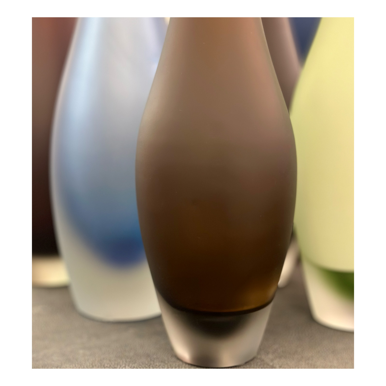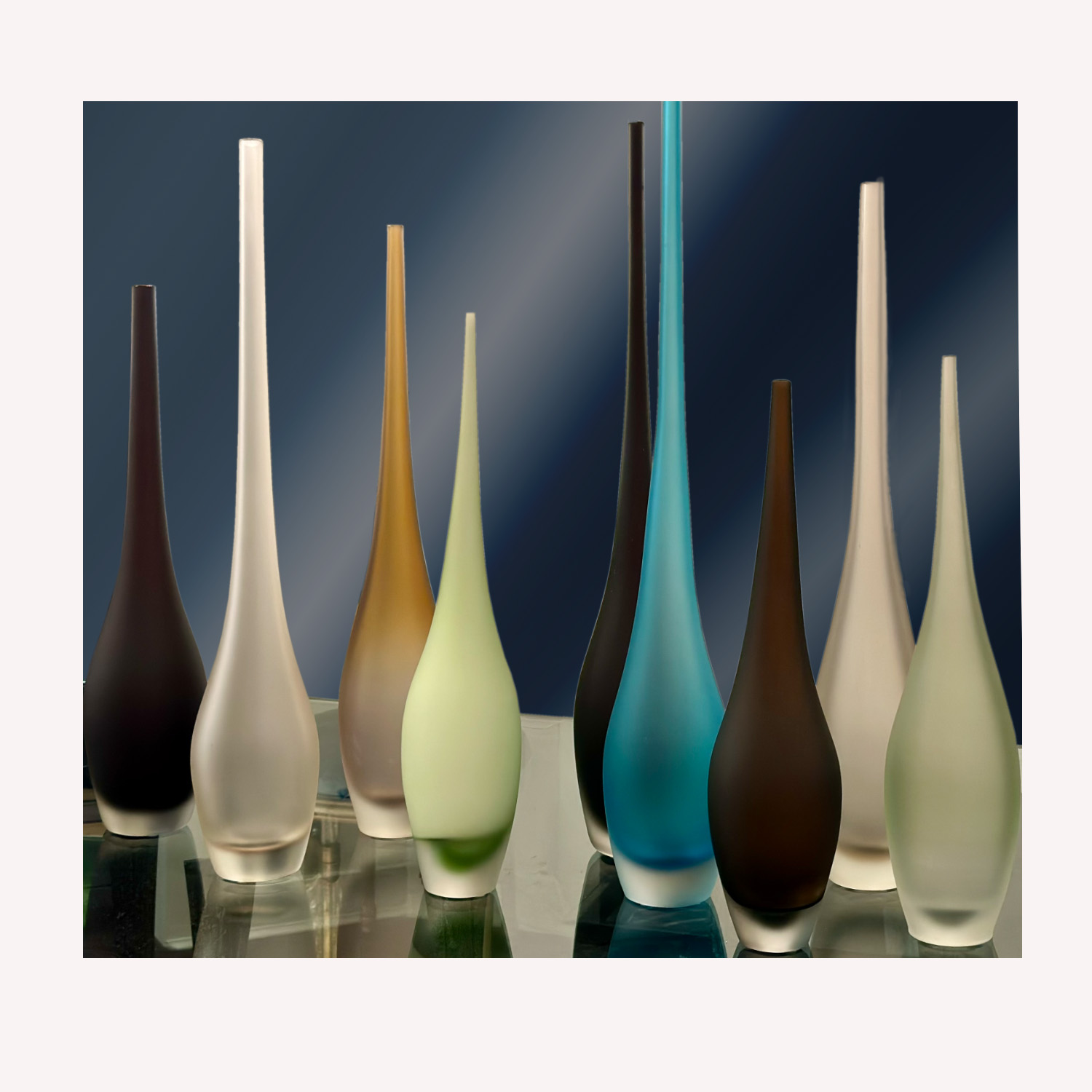 Whether displaying one or a collection, the elegant Alto Vase is certain to be noticed. Each long-neck vase is made using the traditional Sommerso technique, creating a stunning tone-on-tone effect that makes each appear to glow from within. They are beautiful as stand-alone pieces, but, when grouped, they create a display that elevates the aesthetic of any room. Available in an assortment of vibrant colors and three sizes. Sold and priced individually. Currently in our New York City showroom. 5" H.