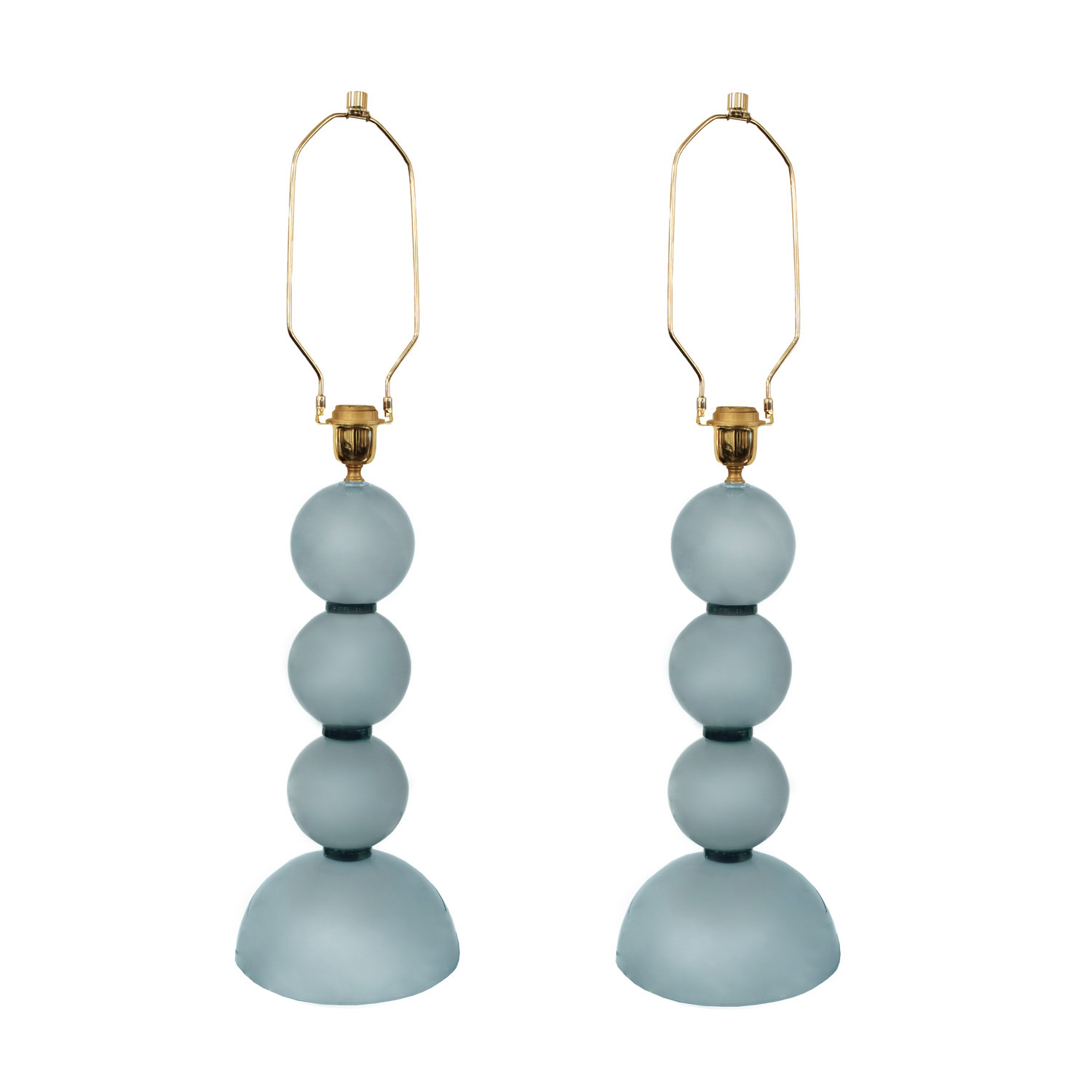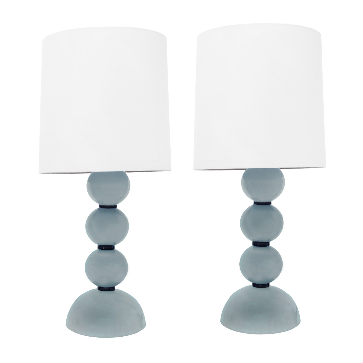 Pair of hand-blown gray Murano lattimo glass ball table lamps with black glass bands and brass hardware.