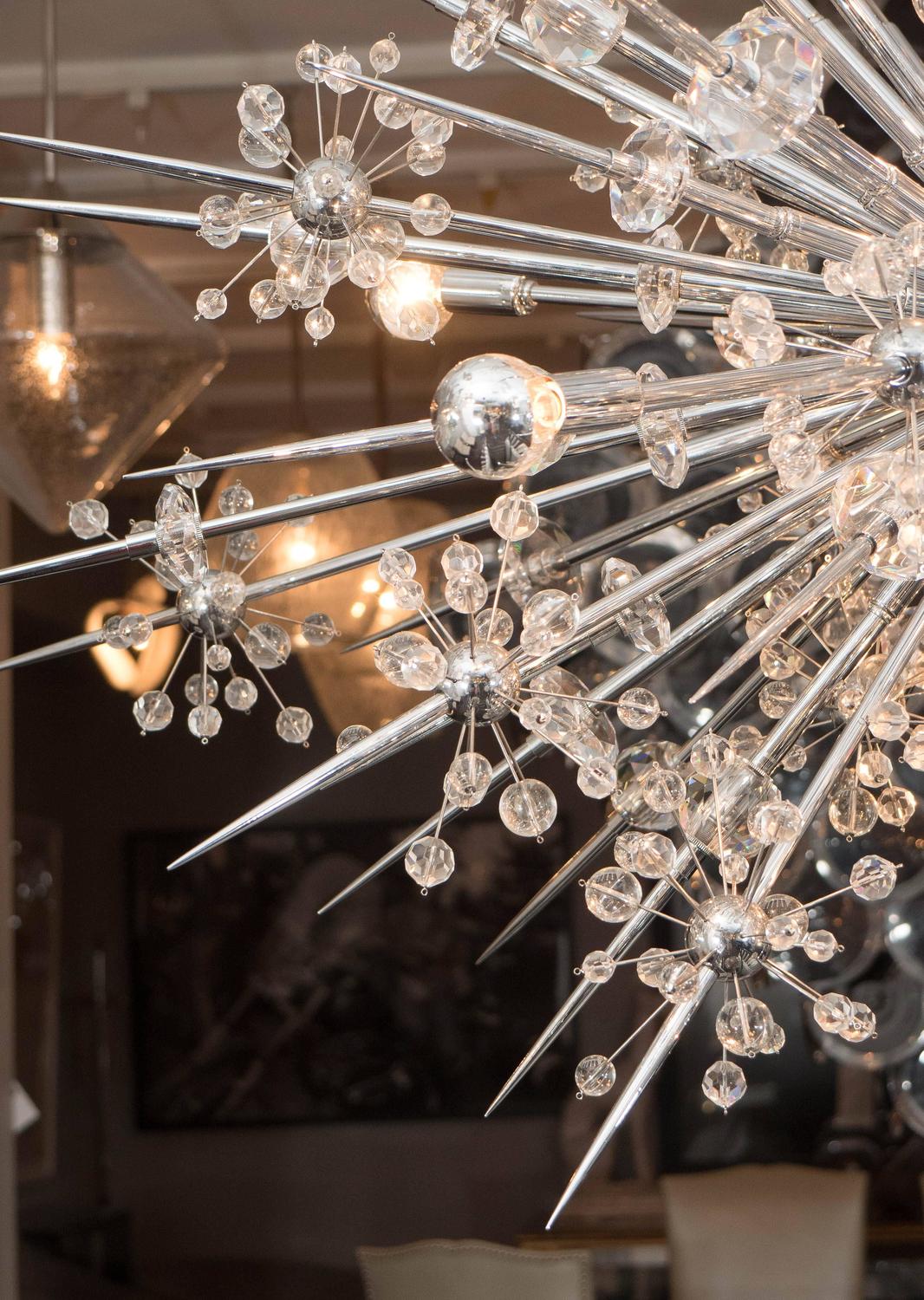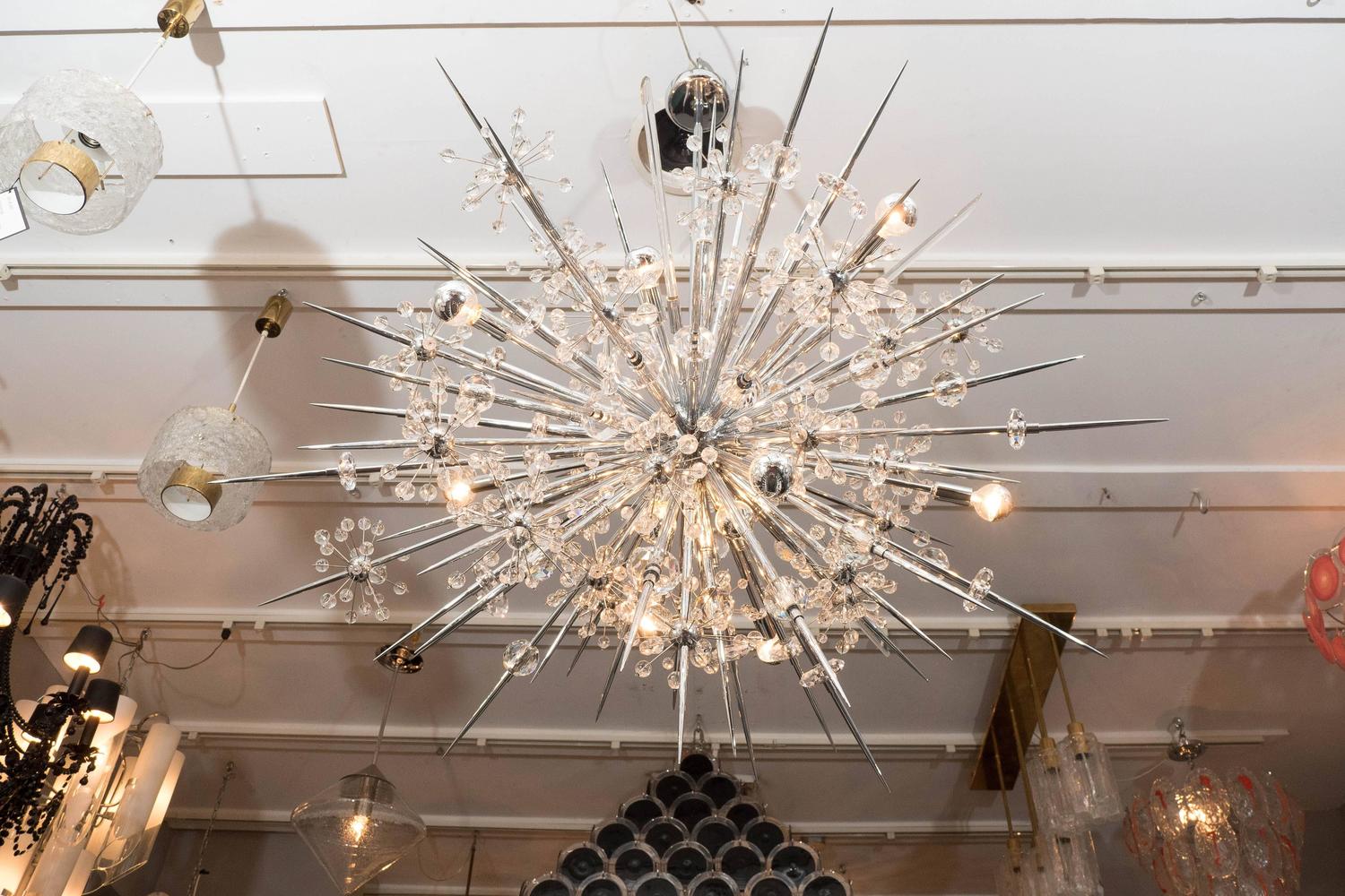 Custom Austrian crystal starburst Sputnik chandelier with polished nickel spheres and spikes. Customization is available in different sizes and finishes.