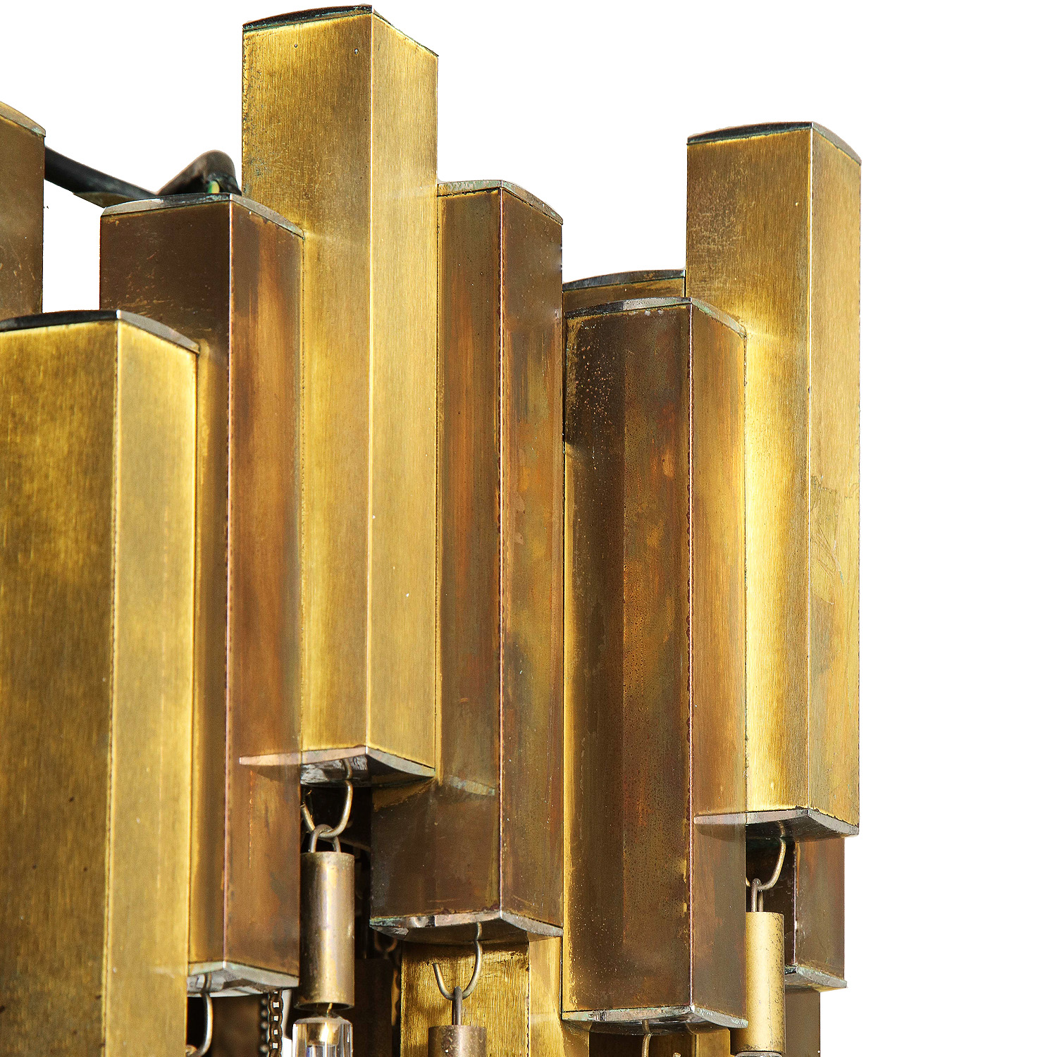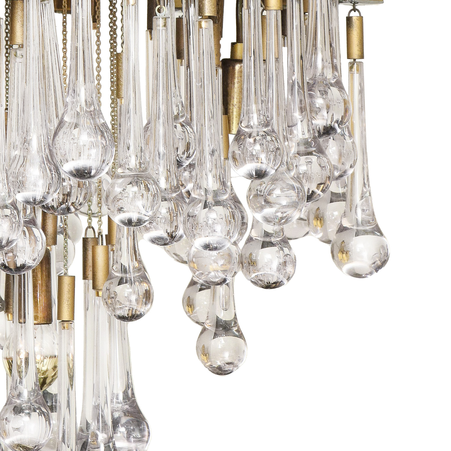 Exceptional Brutalist Chandelier with Murano clear glass drops adorning a mixed metal brass and chrome body by BD Lumica, Spain 1970's. A remarkable chandelier combining styles reflective of prominent Mid-Century Modern lighting and furniture designers such as Paolo Venini, Geatano Sciolari and Willy Rizzo.