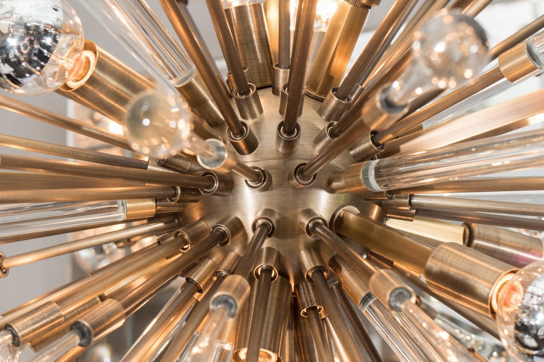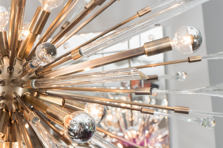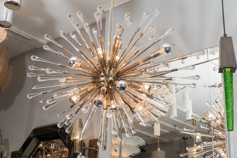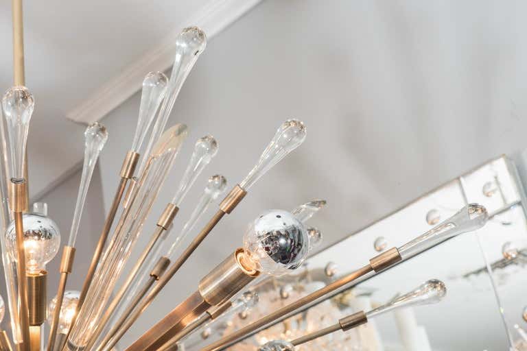 Beautifully detailed custom glass teardrop oval Sputnik chandelier in antique brass finish. Customization is available in different sizes, and finishes. Currently out of stock but available for custom order. Please inquire for estimated production lead times.