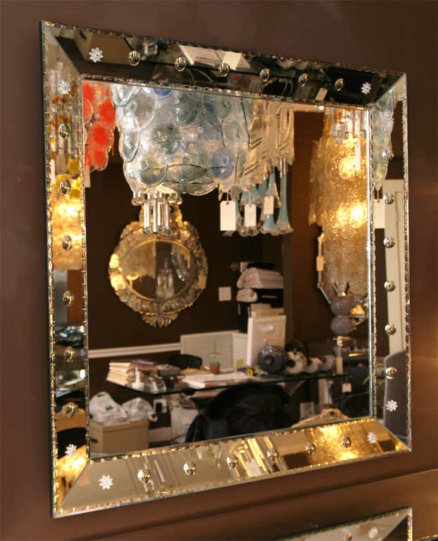 Custom beveled square ponti mirror with pie crust edge. Decorative glass rosette details at the corners. Customization is available in different sizes and finishes.