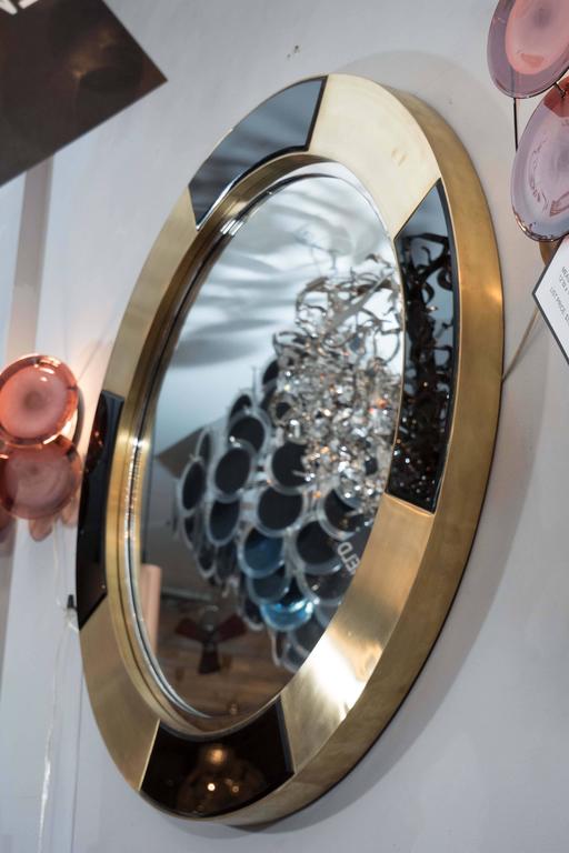 Black and brass frame circle mirror. Minor blemishes that is consistent its age on the frame.