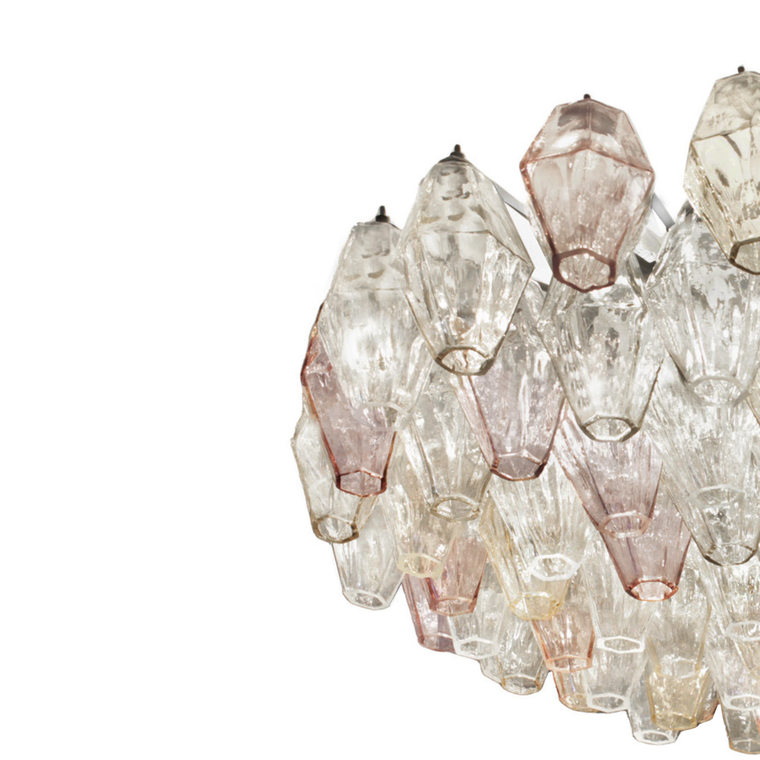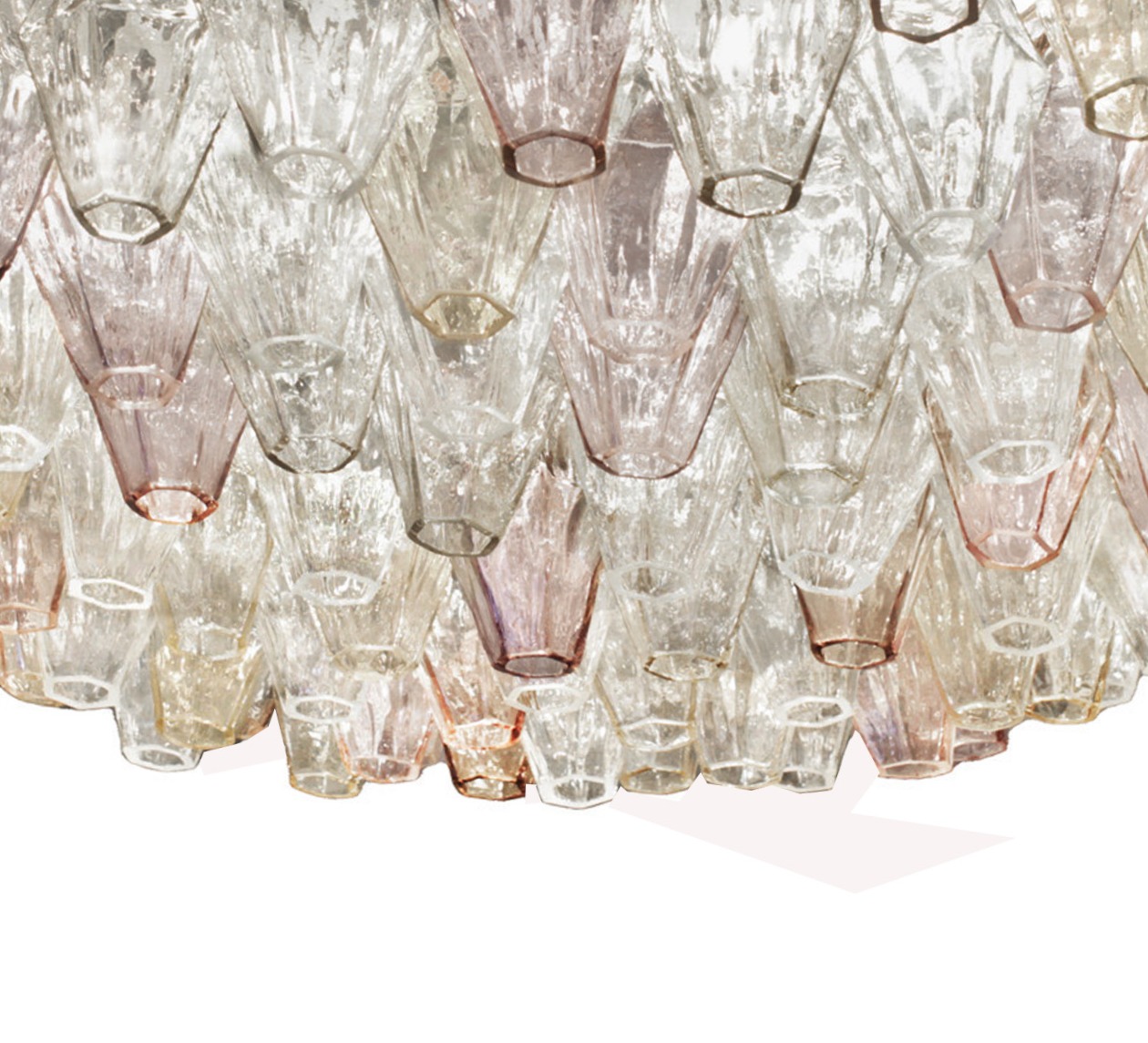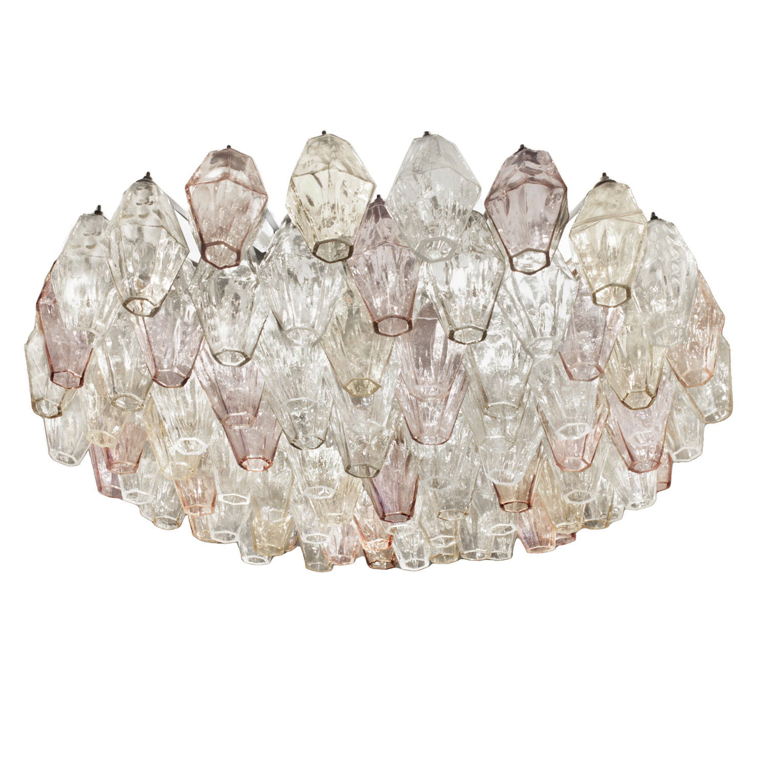 Iconic model, "Poliedri" semi flush mount ceiling light in amethyst, topaz and clear Murano glass. This assemblage of subtly colored, hand crafted poliedre is arranged in a staggered and tiered configuration suspended from a white powder coated metal frame. Designed by Carlo Scarpa for Venini. Italy 1950's. Venfield also carries a larger 33.5".
