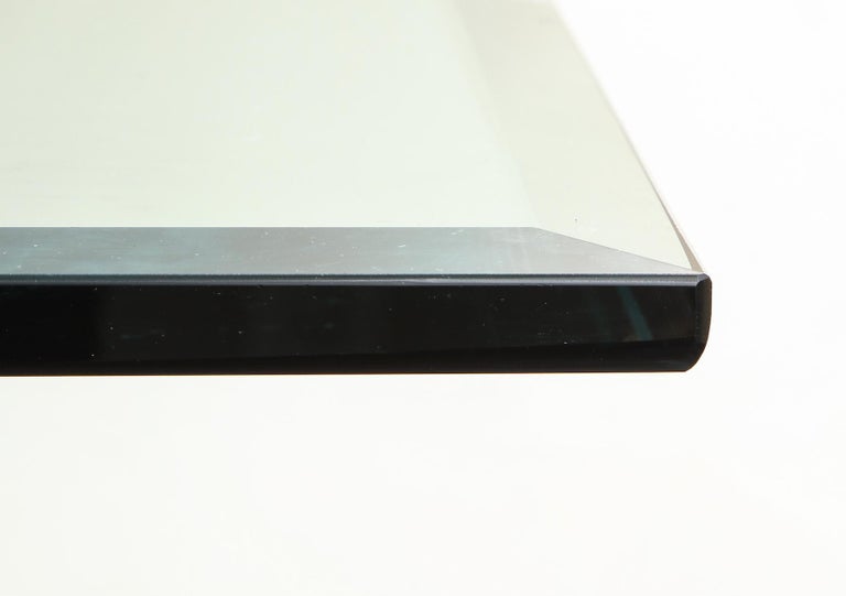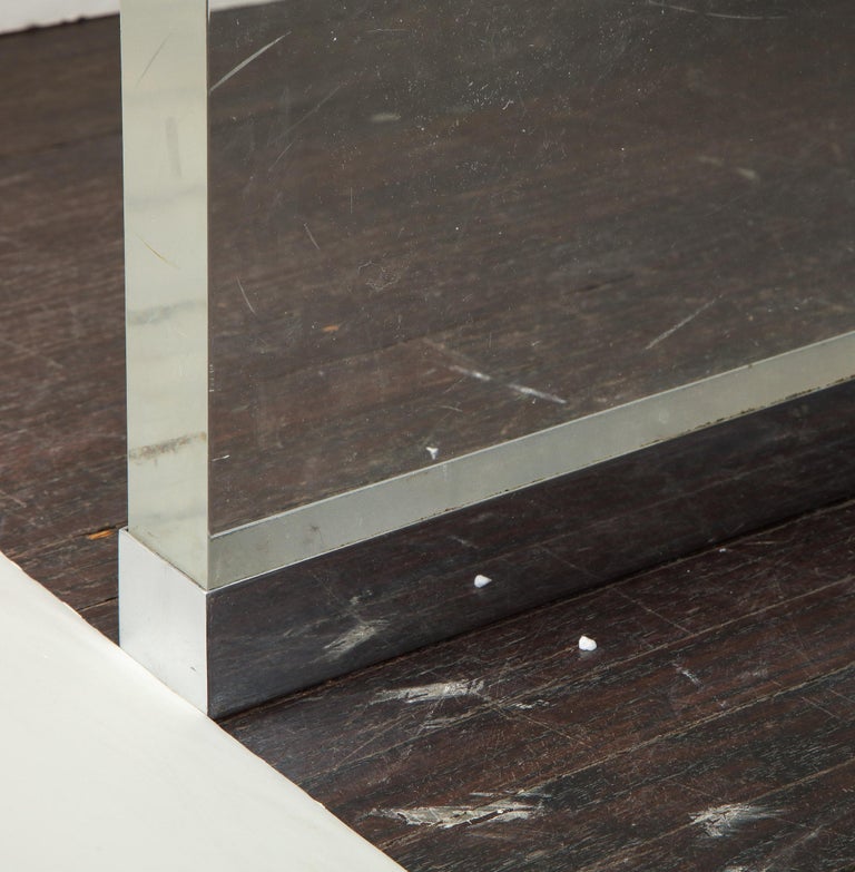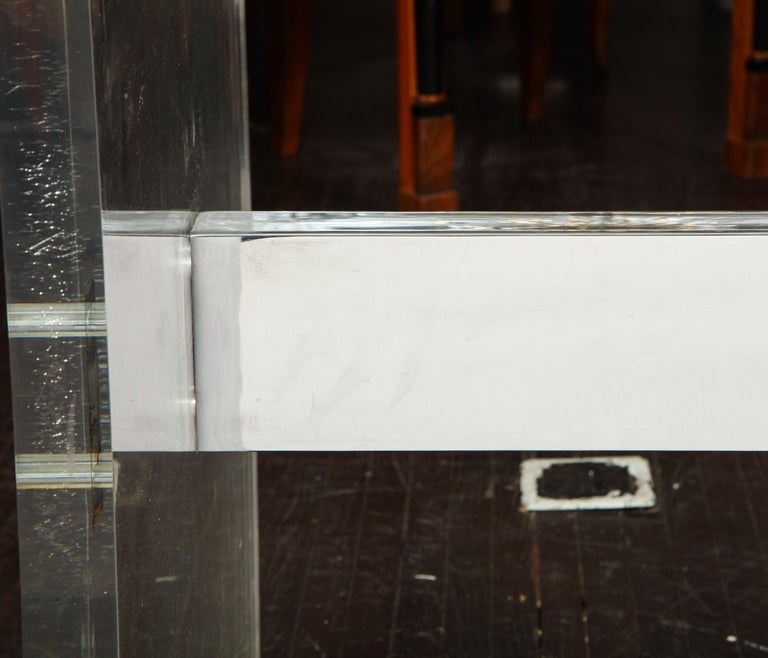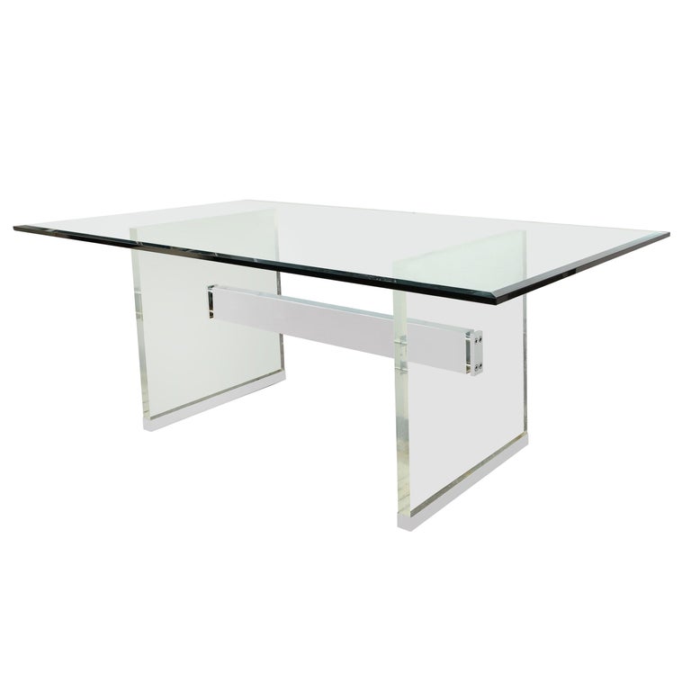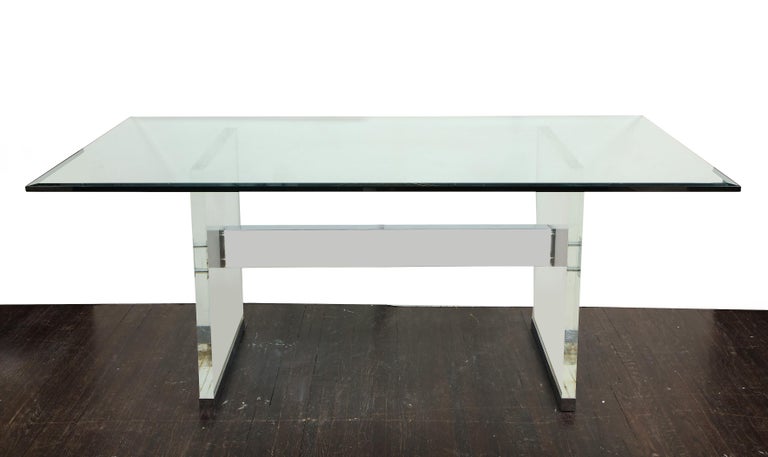 Original Charles Hollis Jones dining table with Lucite legs. A refined modern dining table designed by Charles Hollis Jones in 1970s. The table consists of thick Lucite legs, a polished nickel brace and beveled glass top. Crazing shows on Lucite pieces.