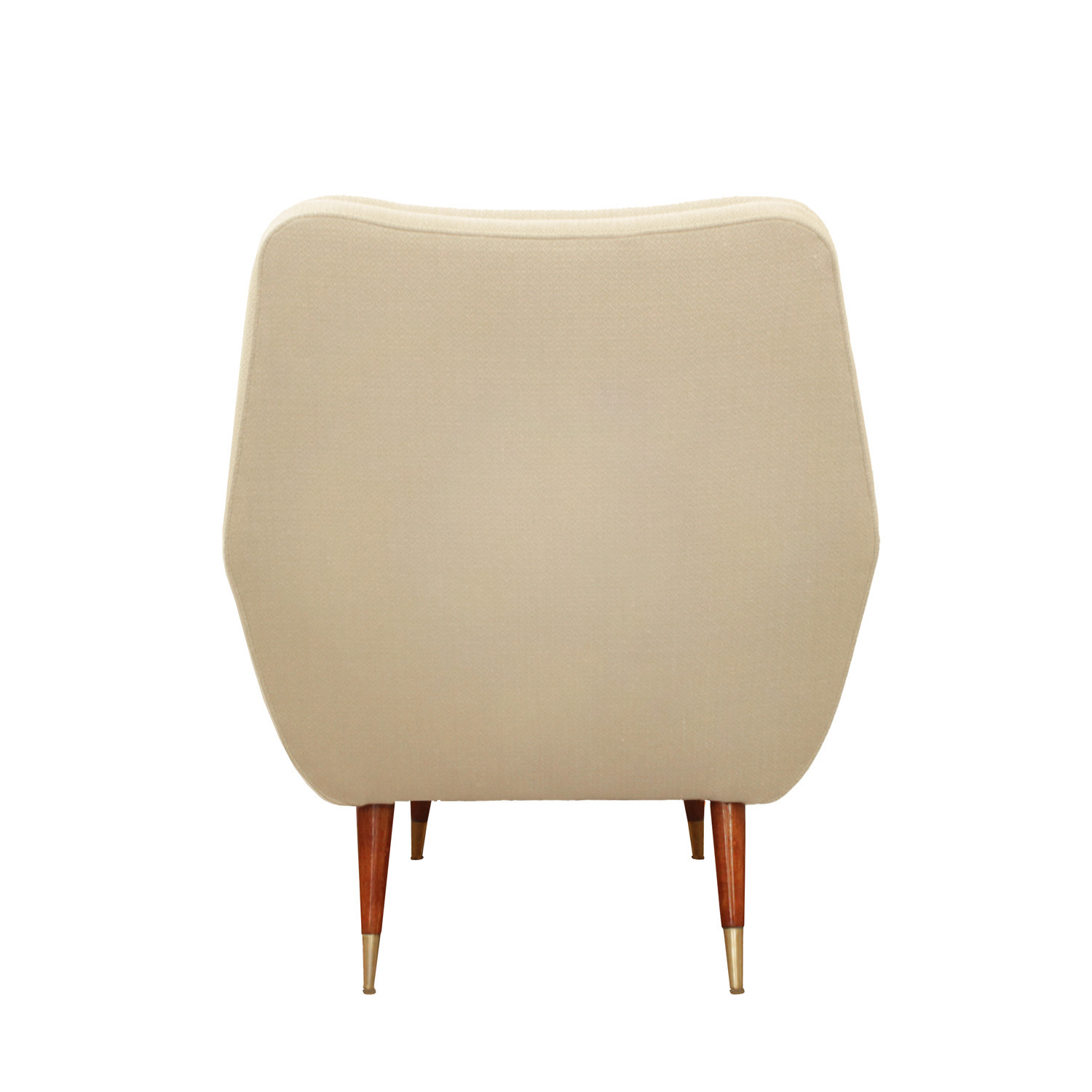 Pair of uniquely shaped Mid-Century "Scoop" chairs with button detail and walnut legs capped with brass sabot. Italian, 1950. Newly upholstered in small scaled diamond patterned Holly Hunt fabric by Venfield.