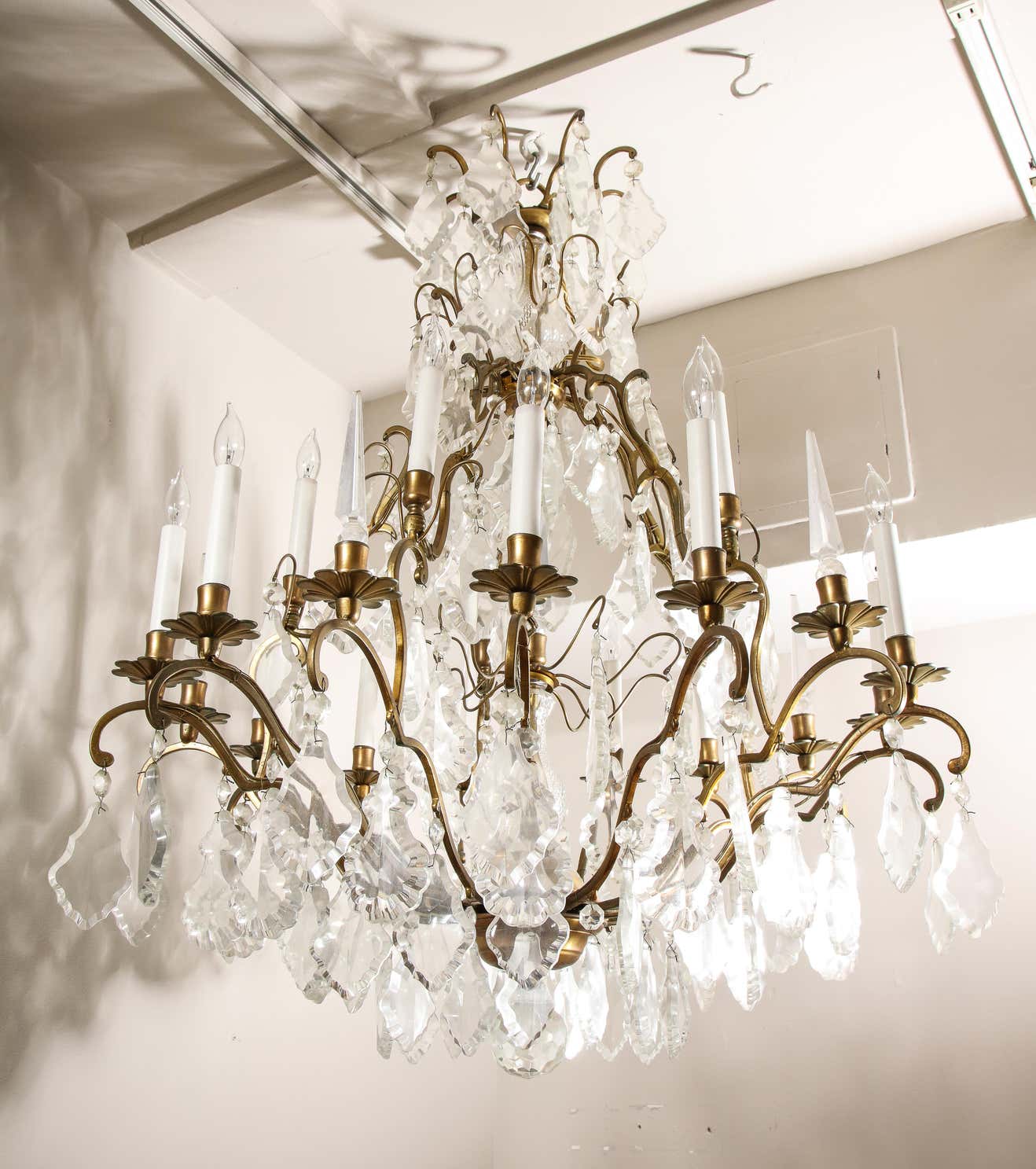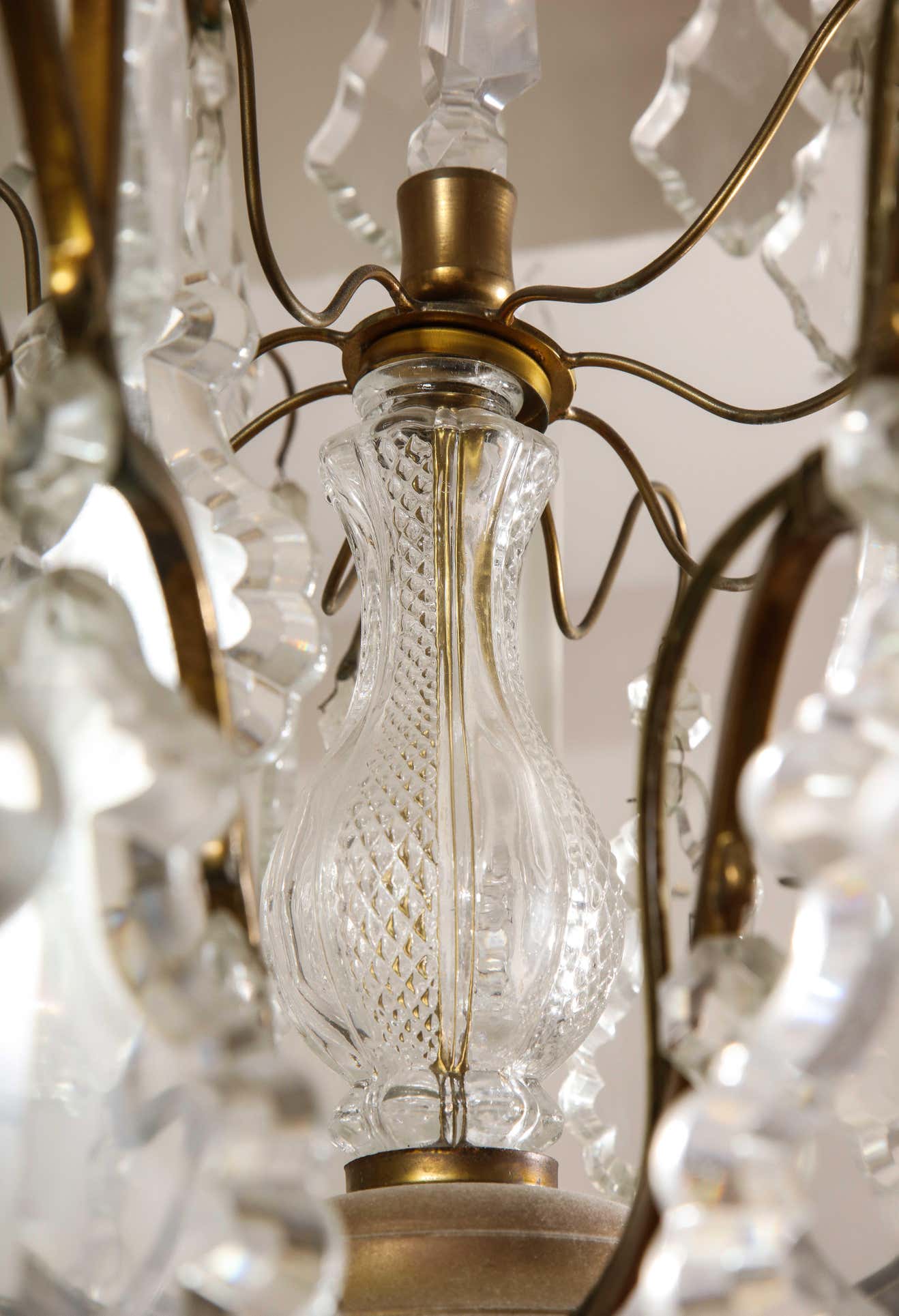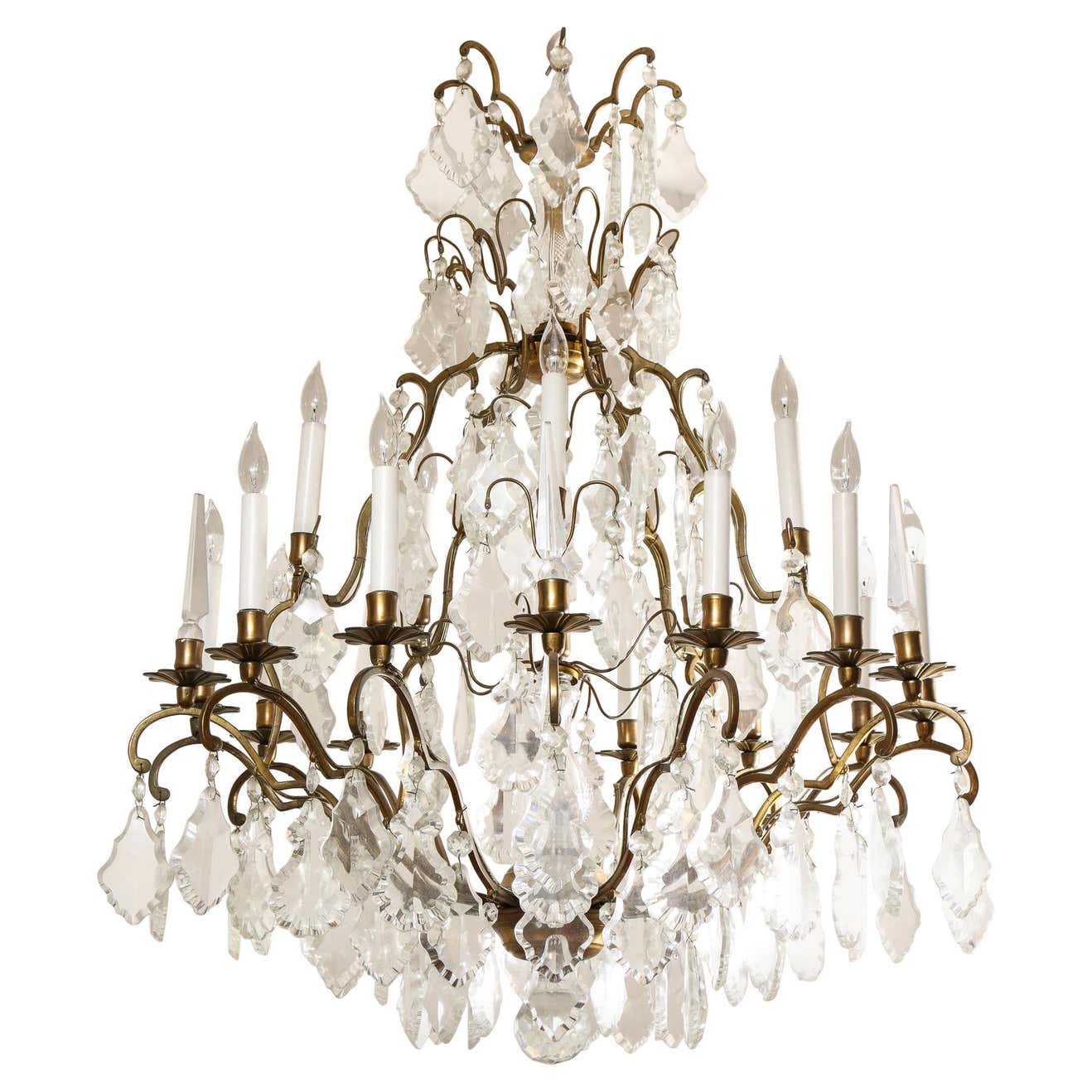 Classic French Versailles style Austrian crystal chandelier in antique brass finish. Multi-tiered chandelier with a partial crystal column in the center. There are 6 crystal obelisks and 15 lights on candle cups. It is in working The chandelier is available for immediate purchase and one of a kind, high-quality chandelier that is great in both traditional and contemporary settings.