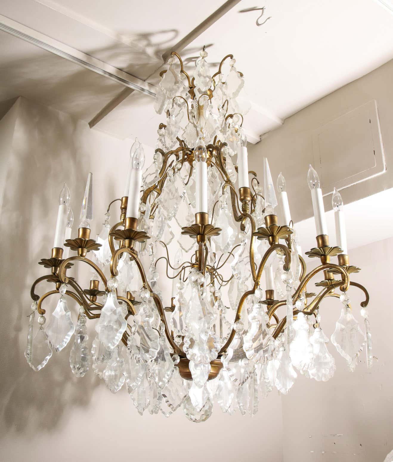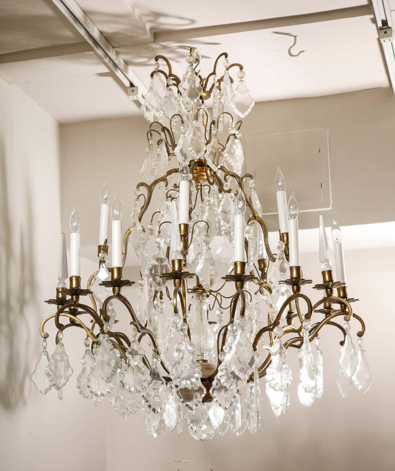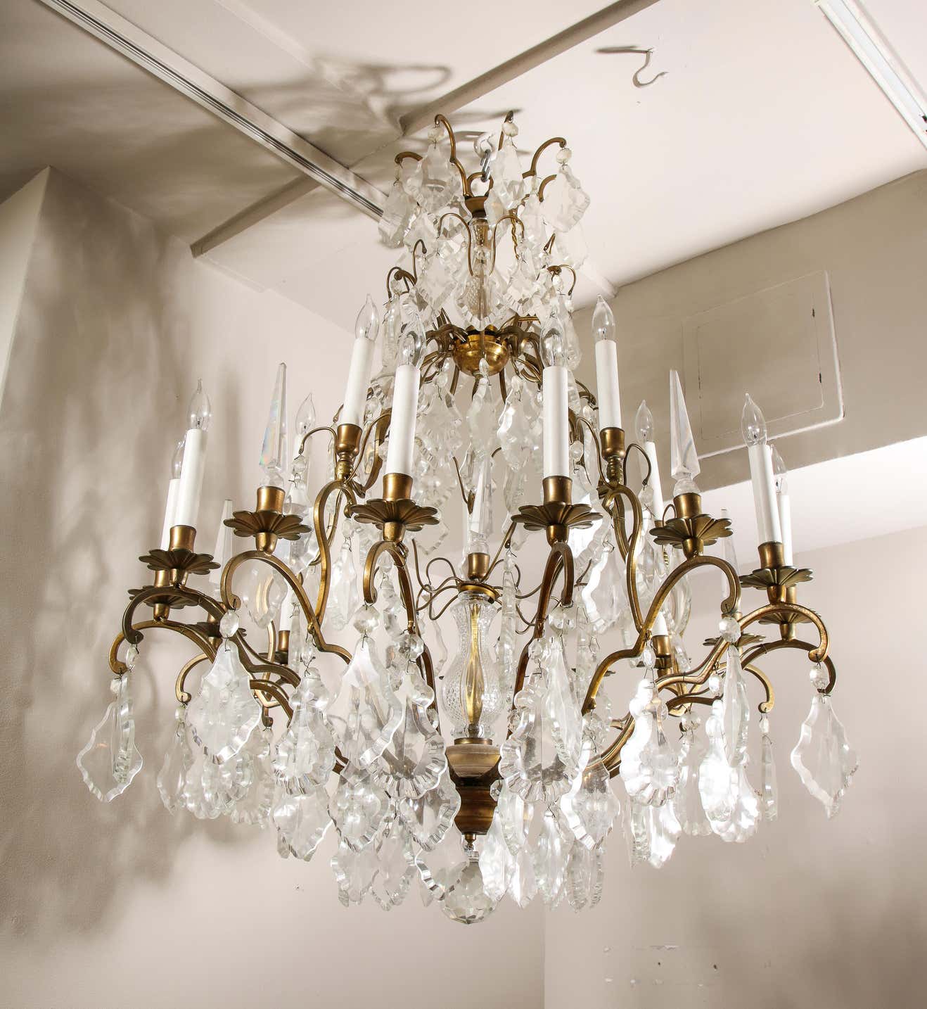 Classic French Versailles style Austrian crystal chandelier in antique brass finish. Multi-tiered chandelier with a partial crystal column in the center. There are 6 crystal obelisks and 15 lights on candle cups. It is in working The chandelier is available for immediate purchase and one of a kind, high-quality chandelier that is great in both traditional and contemporary settings.