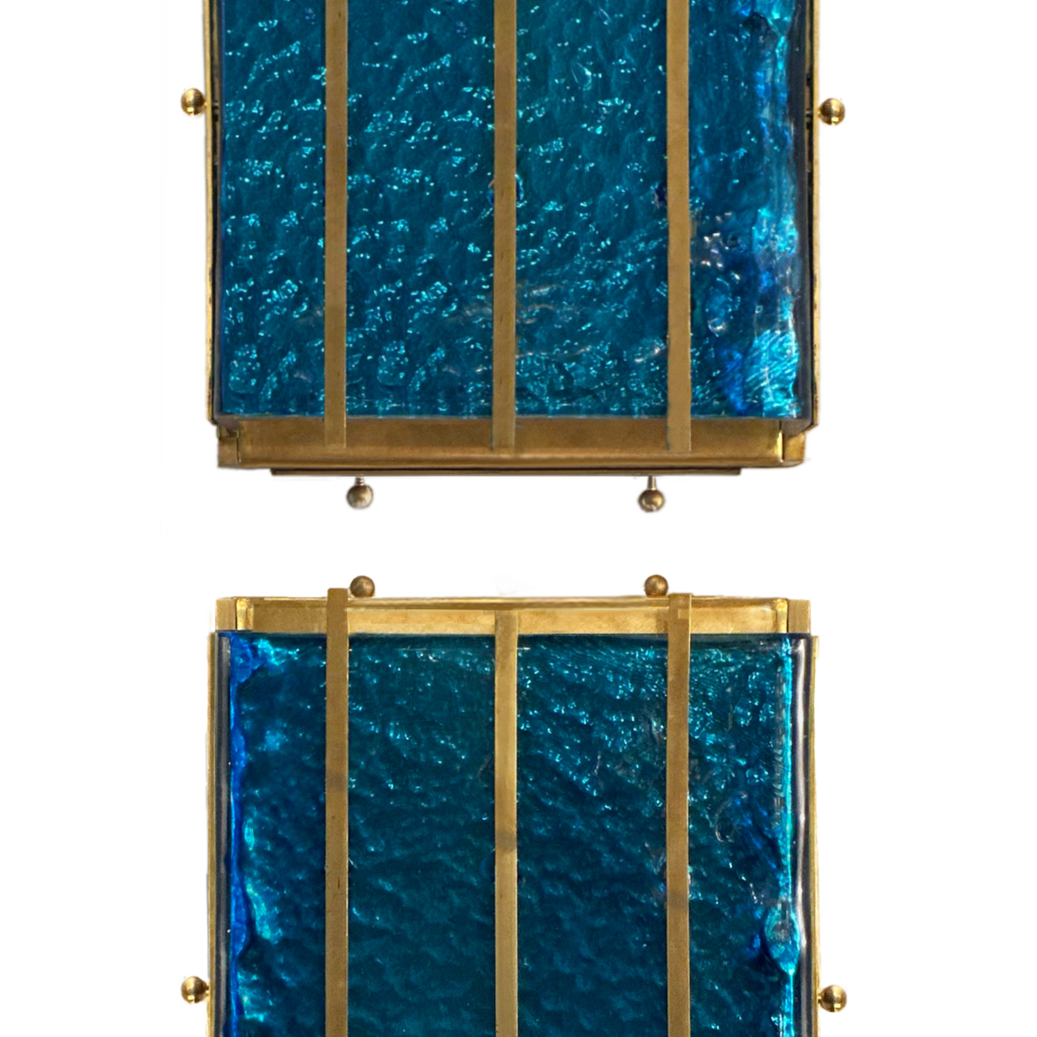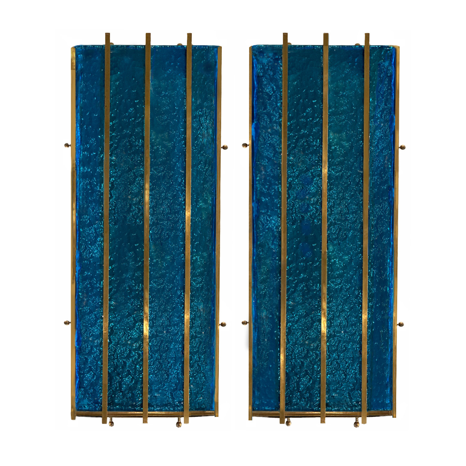 With a nod to the Brutalist style lighting of Longobard of Verona, this pair of cerulean blue hammered Murano glass wall sconces are elegantly refined by the addition of brass "baguette" accents immediately adding a touch of luxury and sophistication to them. Made with the impeccable craftsmanship of Murano's glass makers these stunning pieces will bring unparalleled beauty and artistry to any space they illuminate.