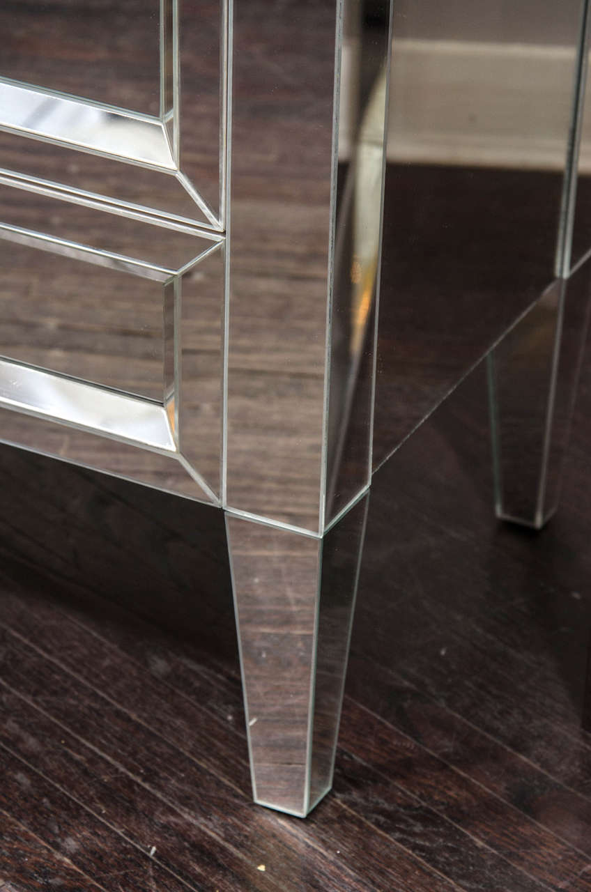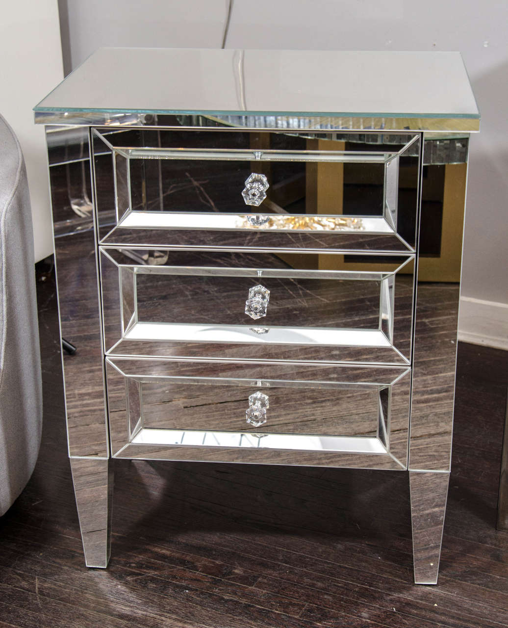 Custom 3-drawer mirrored nightstand. Customization available for different sizes and with customer owned hardware.