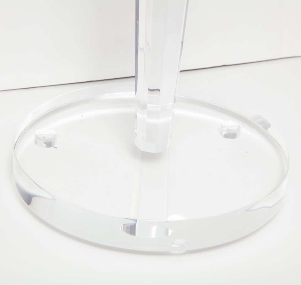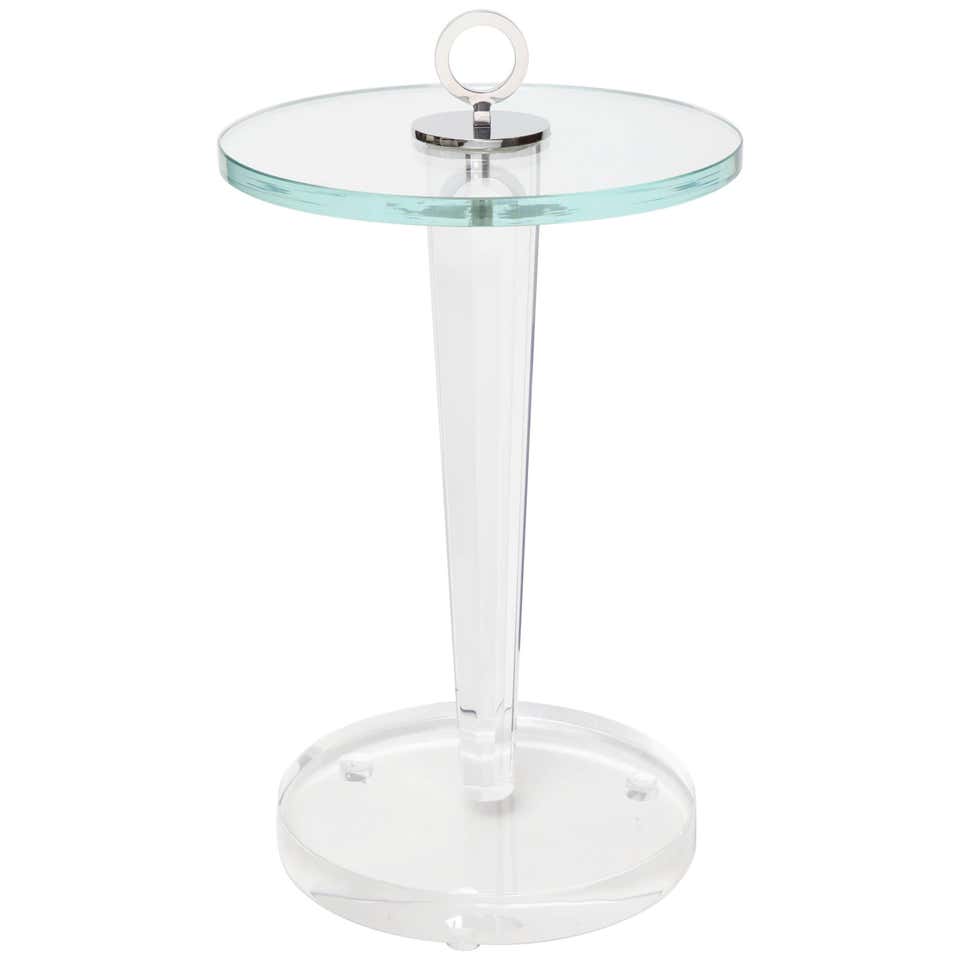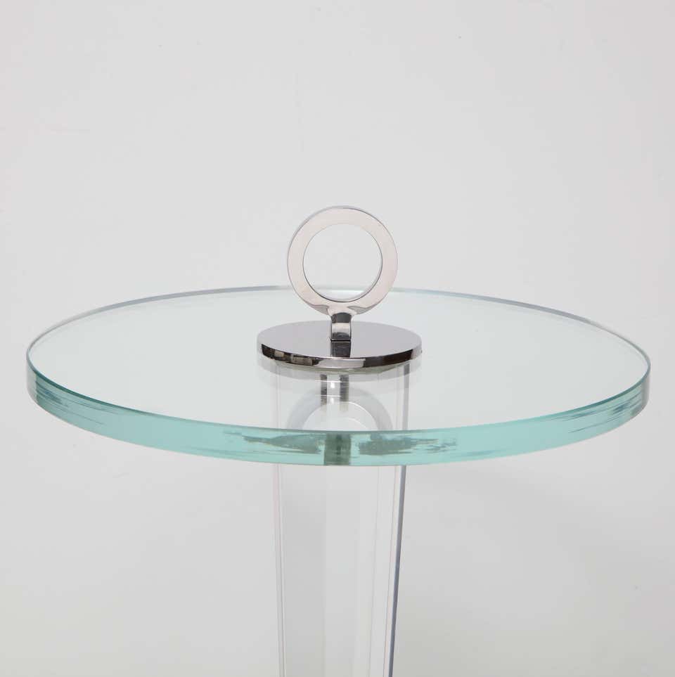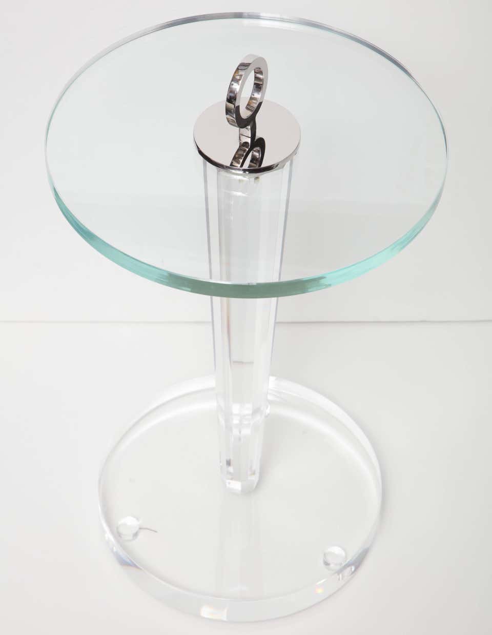 Custom acrylic occasional table with glass top and plated nickel ring. Customization is available in different sizes and finishes.