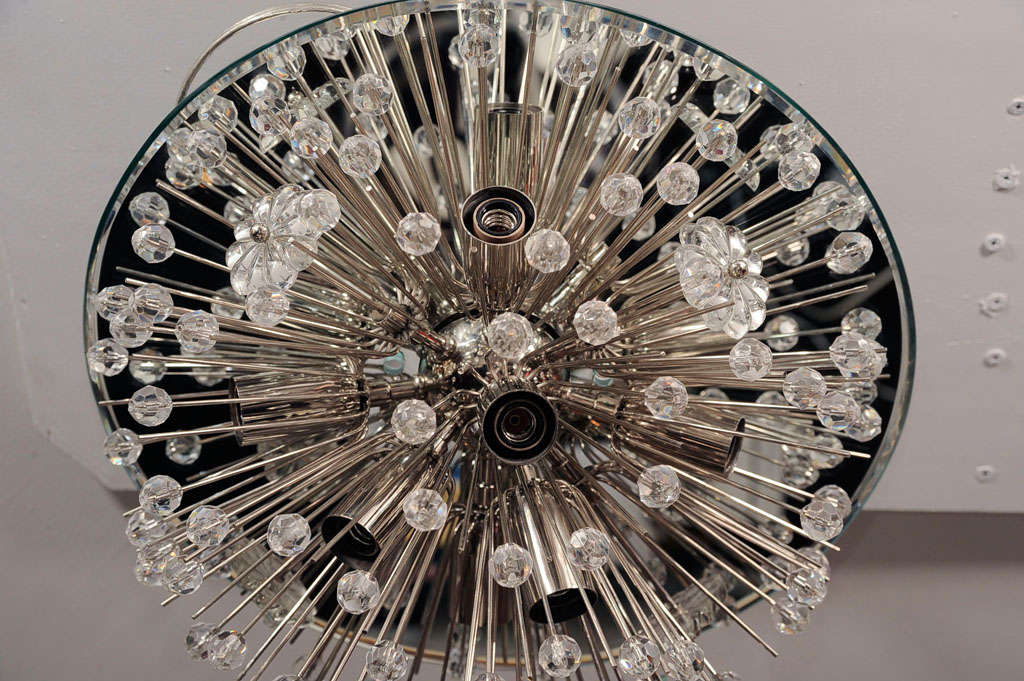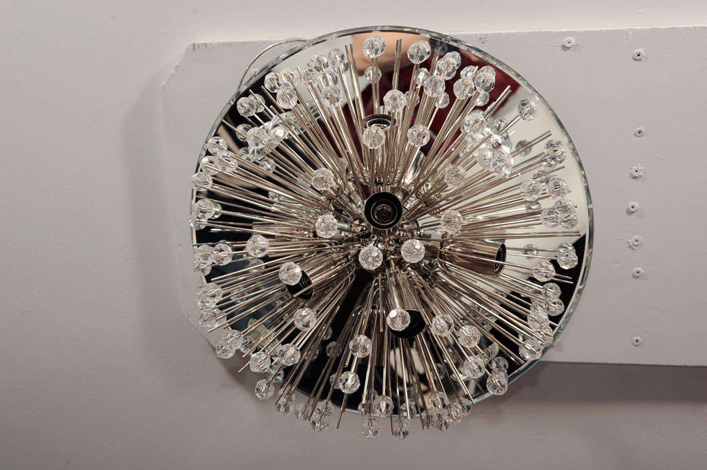 Custom Austrian snowflake crystal flush mount in nickel finish, with a ceiling-hugging mirror. Currently out of stock but available for custom order. Customization available for different sizes and finishes. Inquire with Venfield about estimated production lead times.