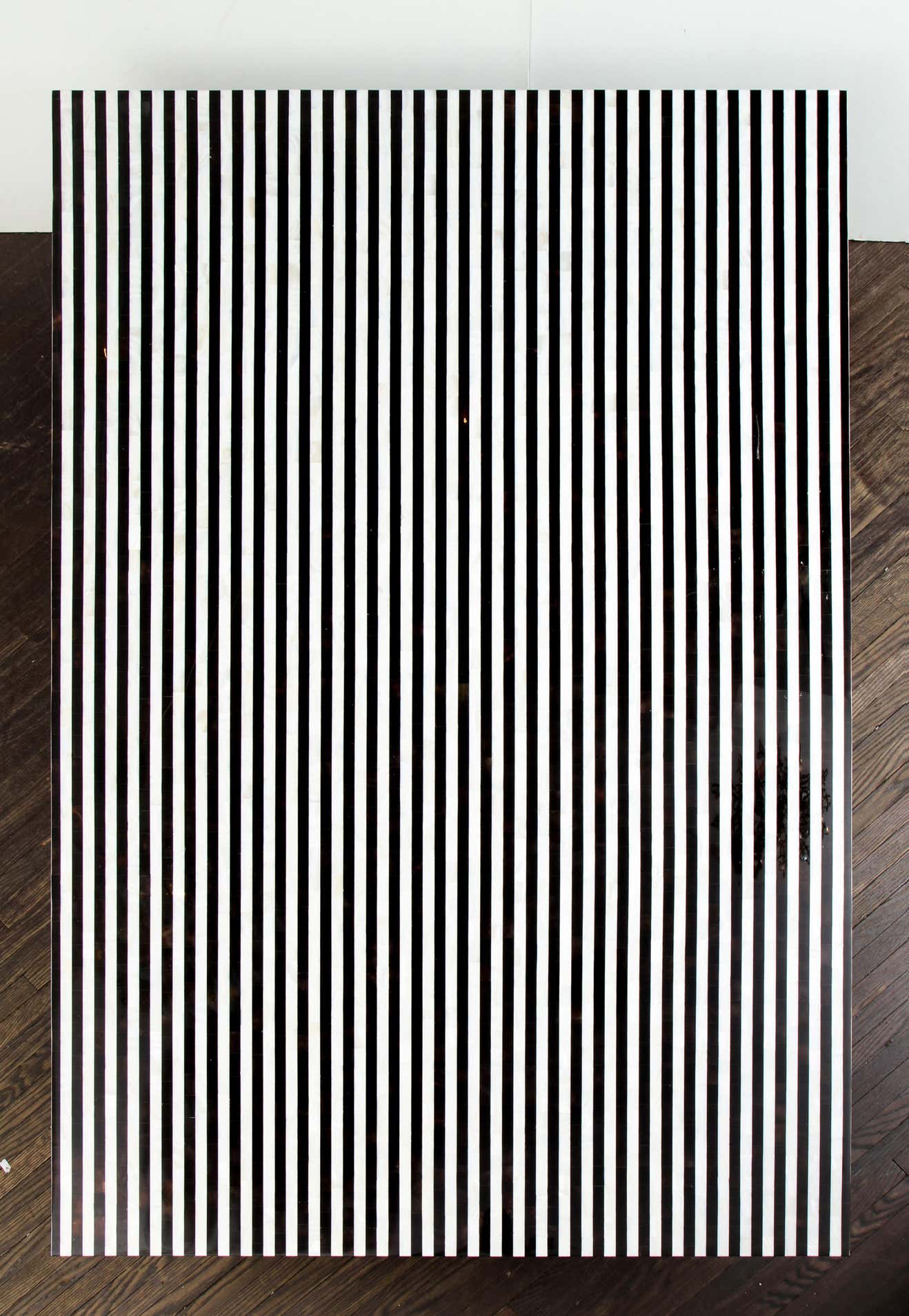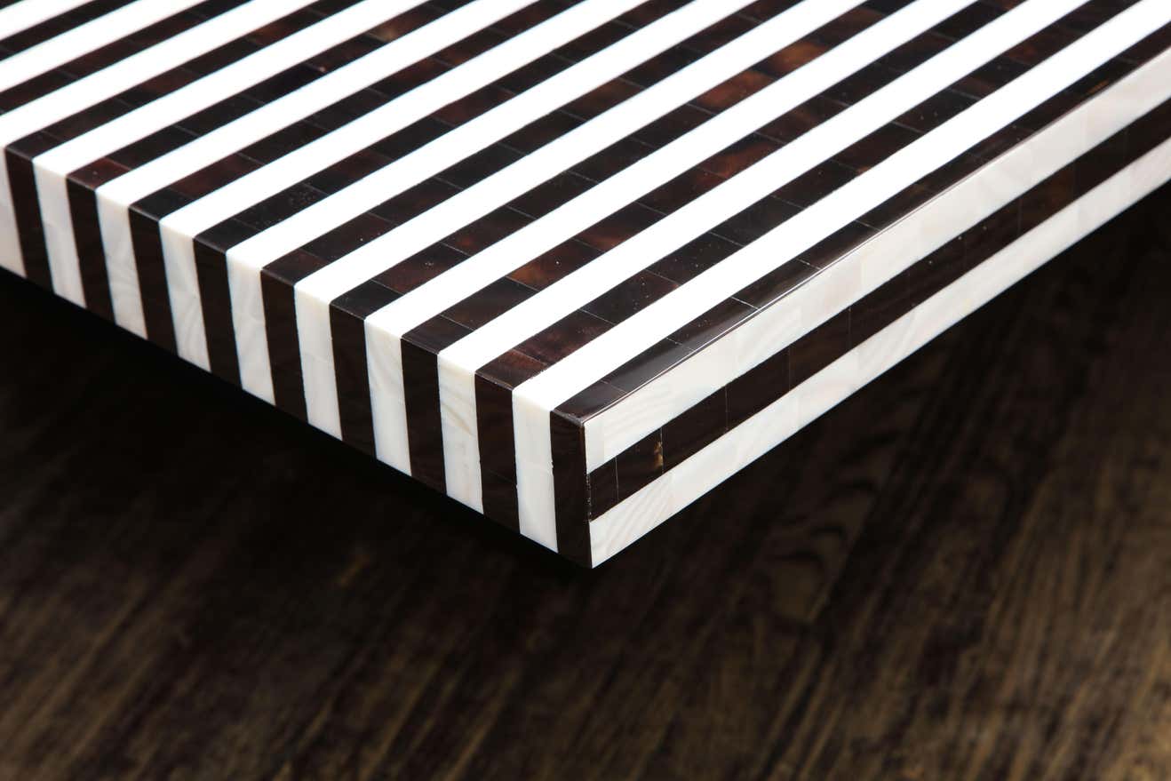 Custom black-and-white shell-stripe marquetry table Currently out of stock but available for custom order in different sizes. Inquire with Venfield about customization and estimated production lead times.