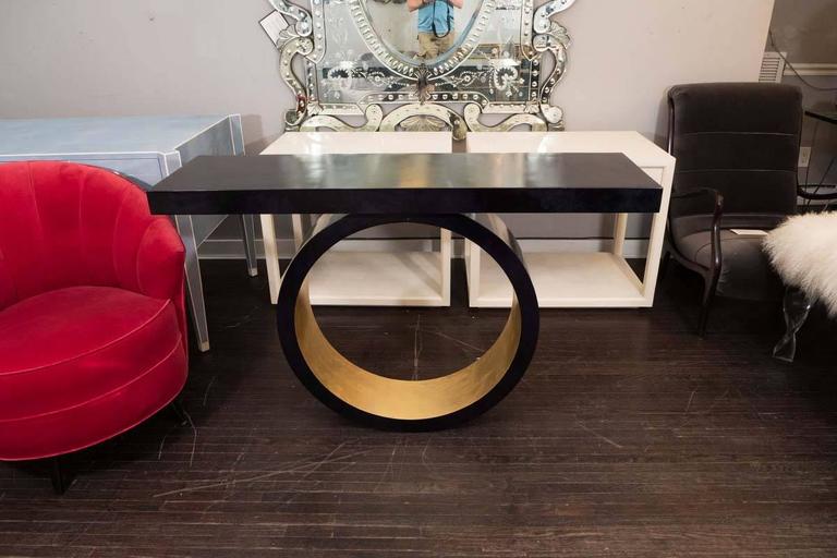 Custom black parchment wall-mounted circle console with gold leaf. Custom orders are available for different sizes and parchment colors.
