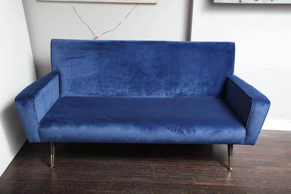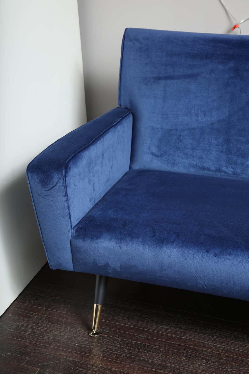 Custom blue velvet settee. Customization is available in different sizes and fabrics (COF).