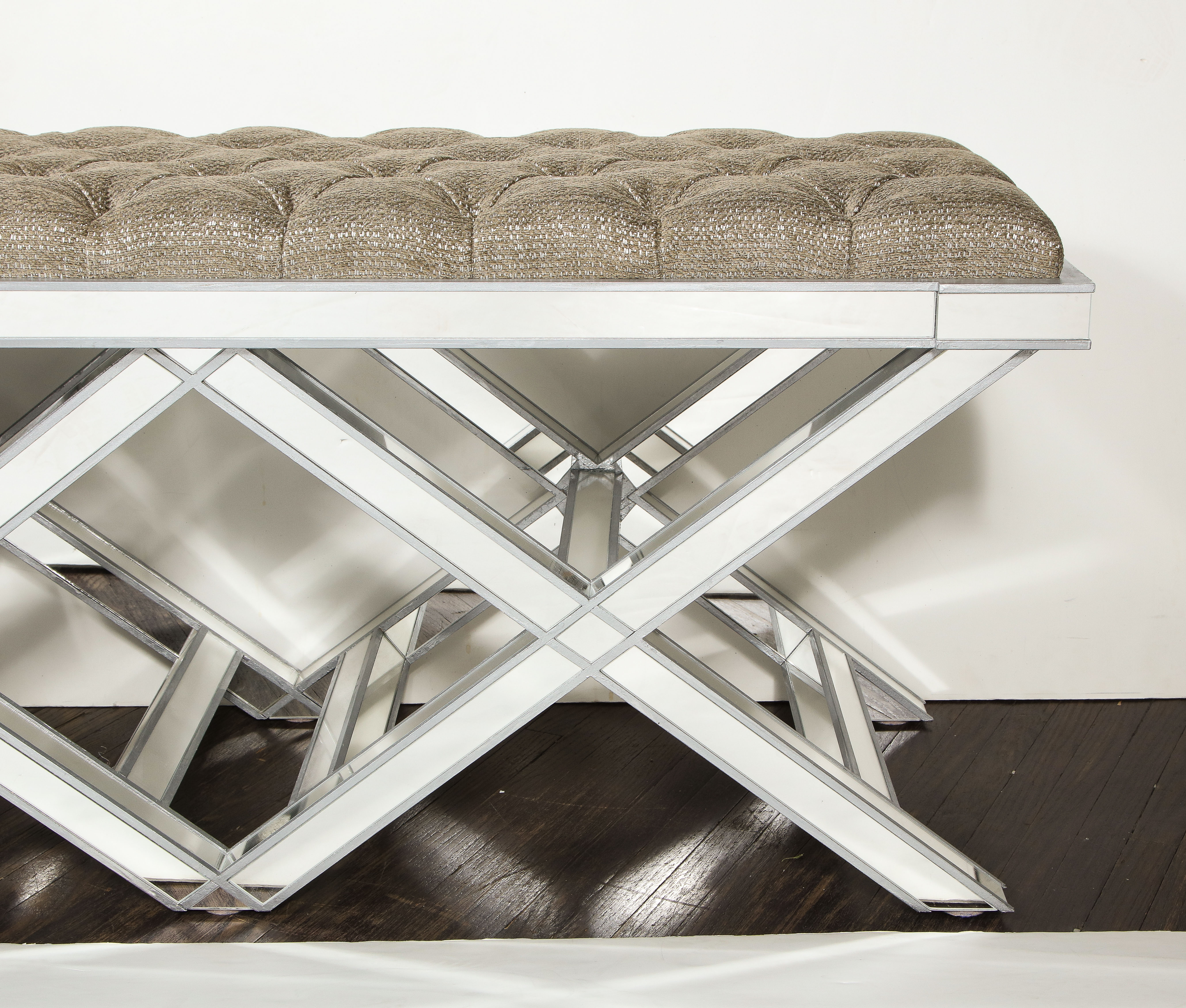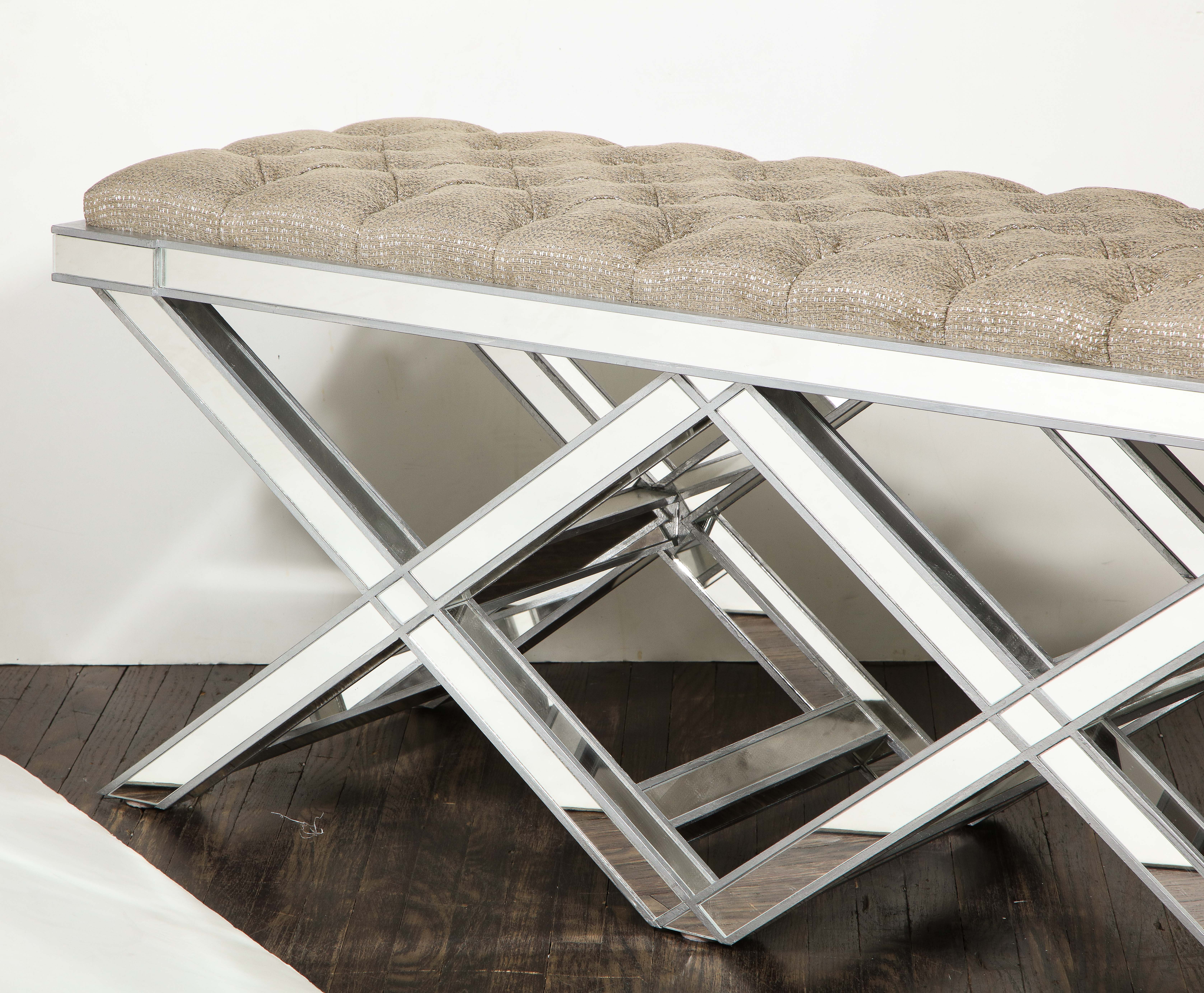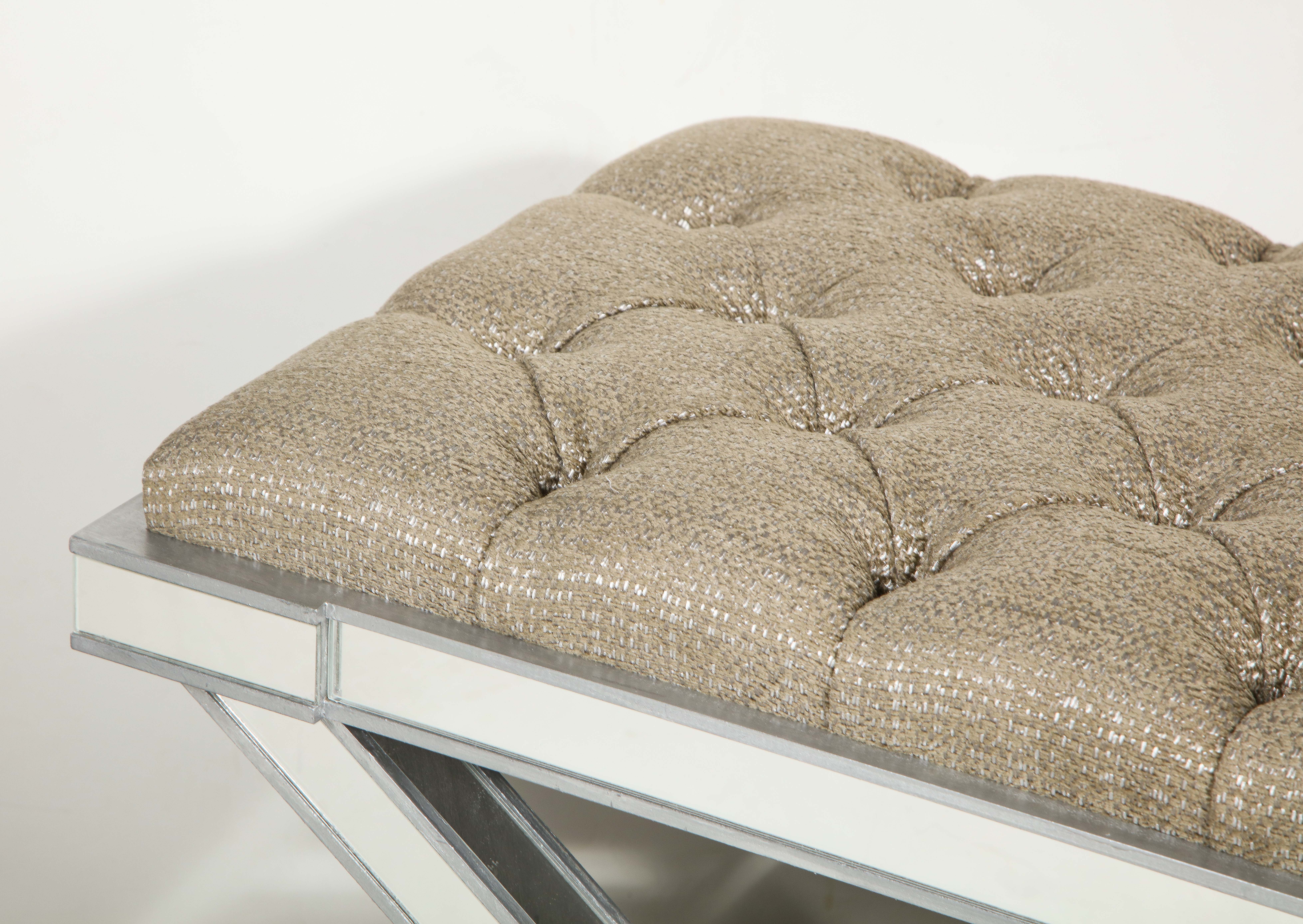 Custom double silver trim mirrored X-band bench with upholstered tufted fabric cushion. Currently out of stock but available for custom order in different sizes, finishes, and fabrics. Inquire with Venfield about customization and estimated production lead times.