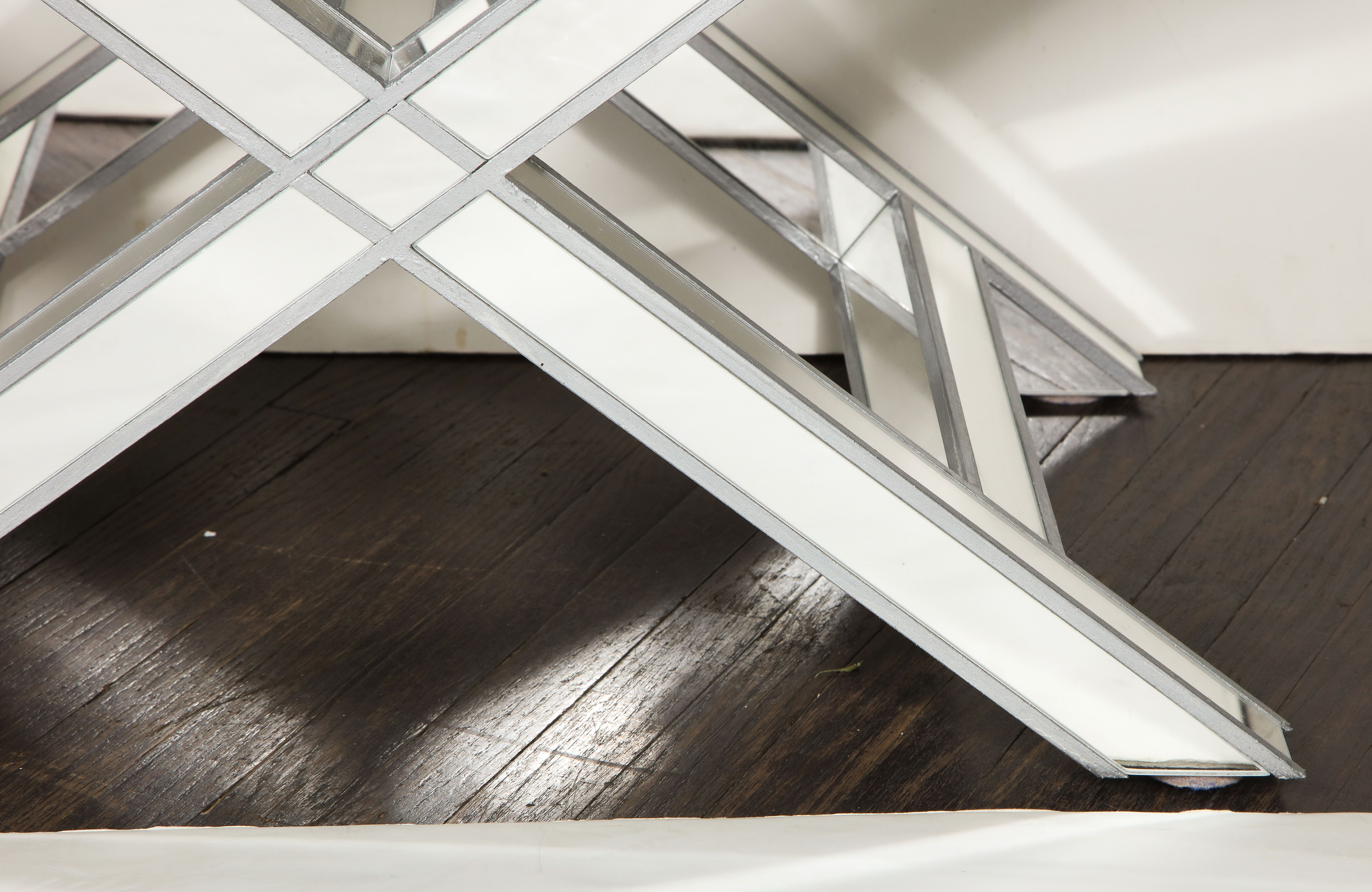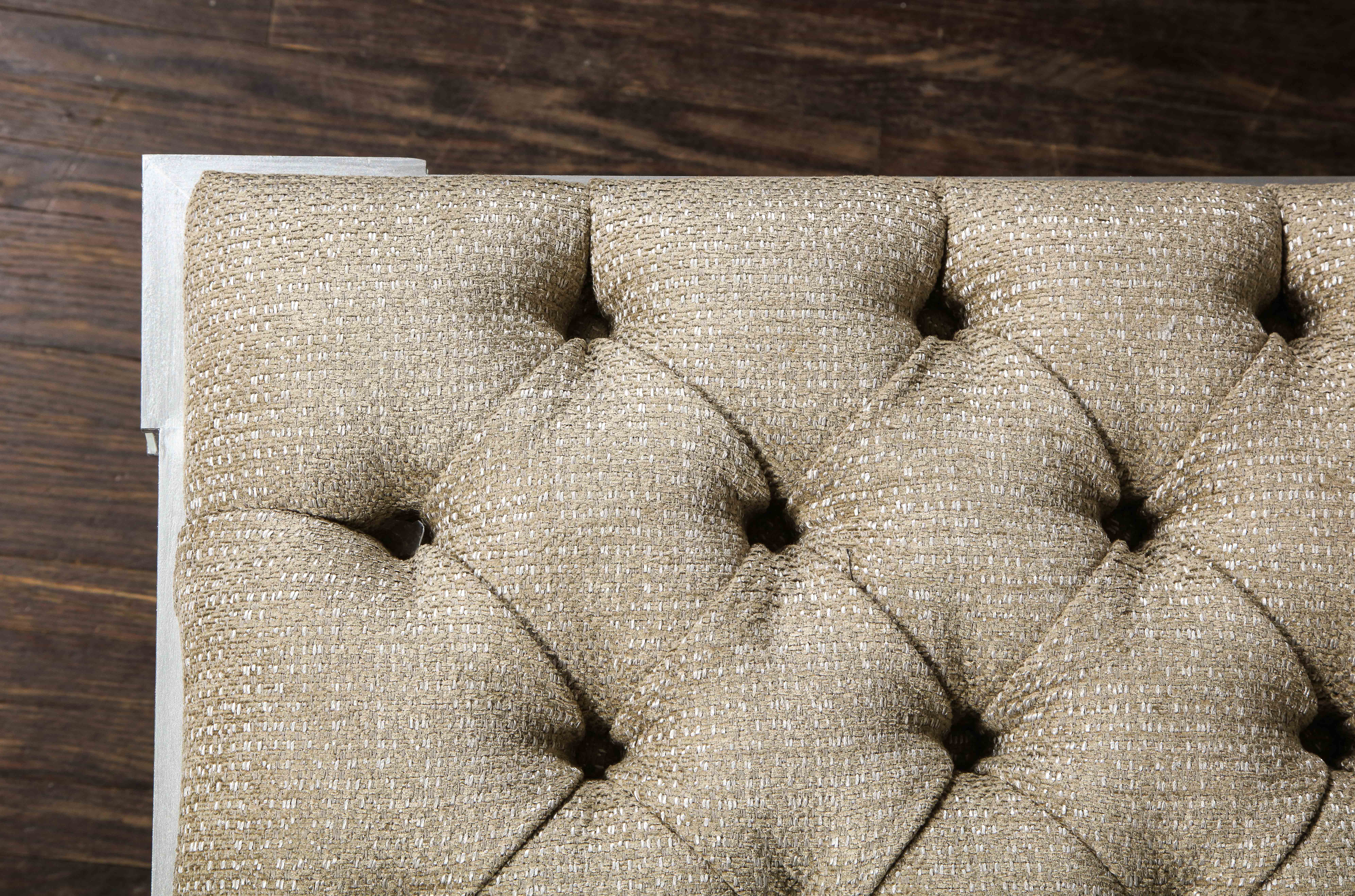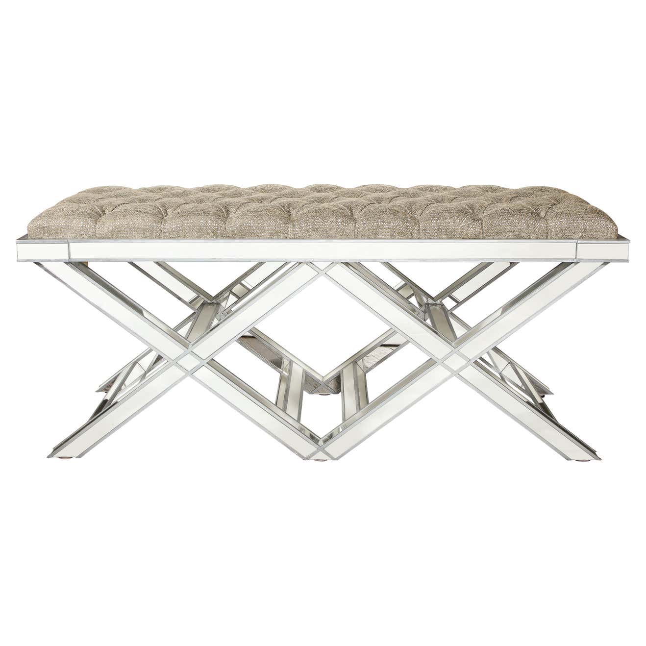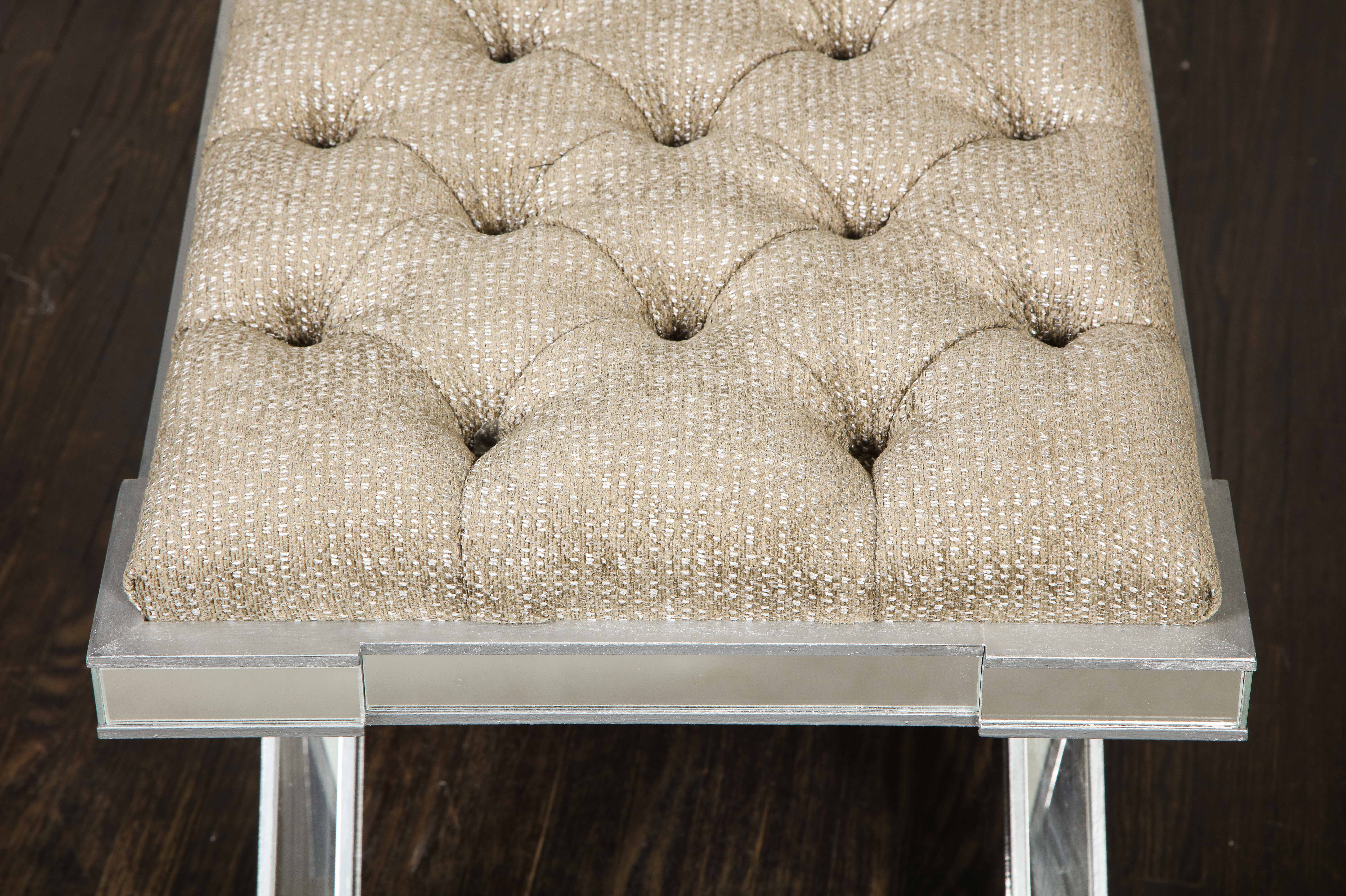 Custom double silver trim mirrored X-band bench with upholstered tufted fabric cushion. Currently out of stock but available for custom order in different sizes, finishes, and fabrics. Inquire with Venfield about customization and estimated production lead times.