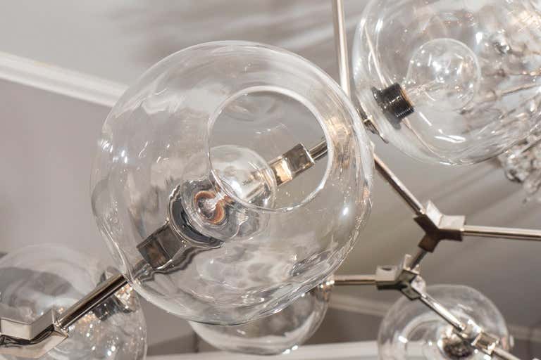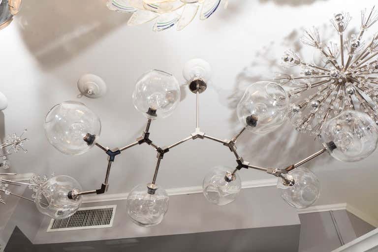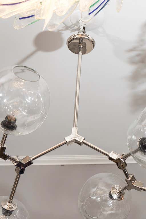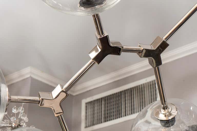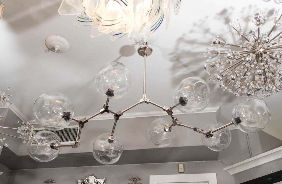 Custom eight-globe branch chandelier with cleaer glass and polished nickel finish. Customization is available in different sizes, finishes and glass color.
