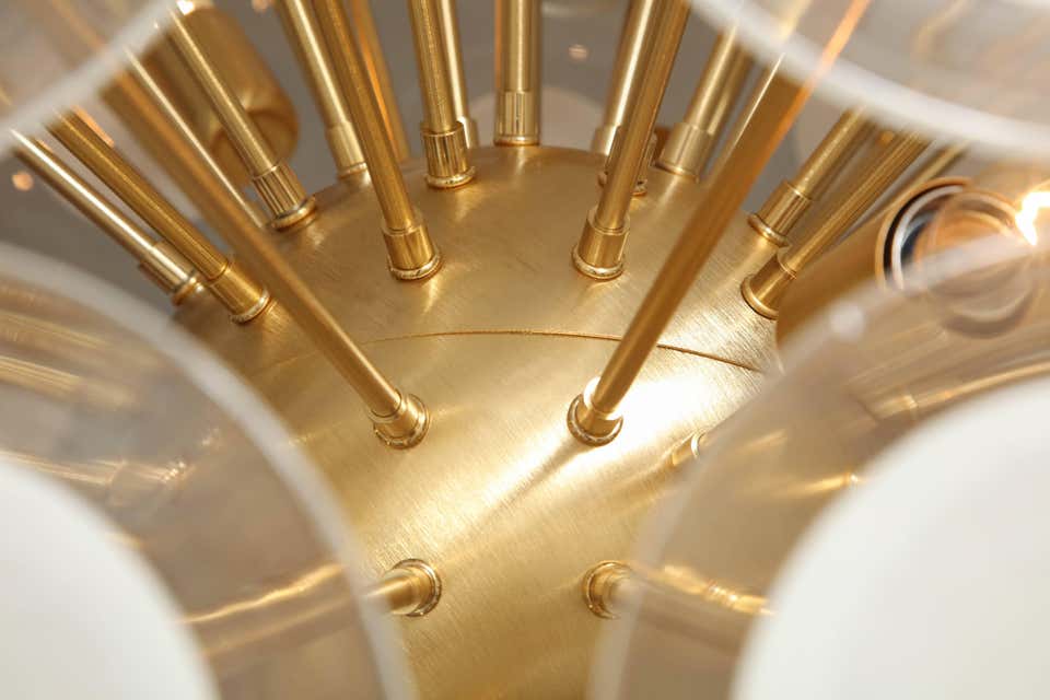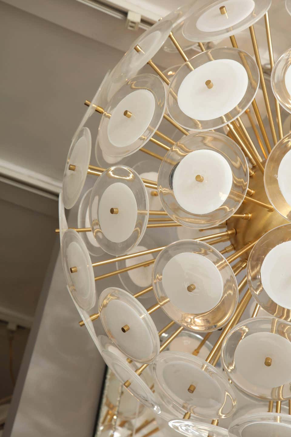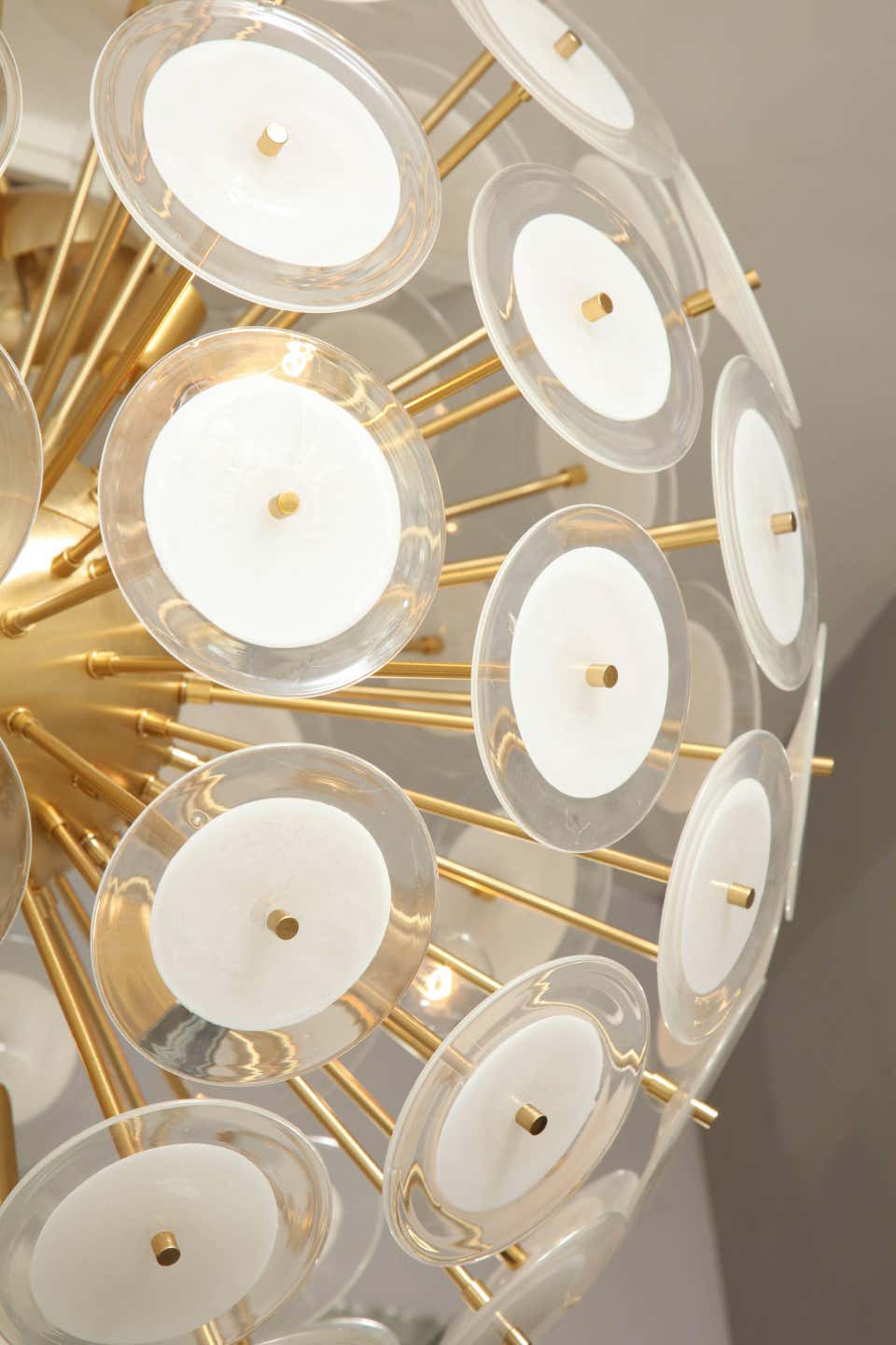 Custom extra large white Murano glass disc Sputnik chandelier, in brass finish. Customization is available in different sizes, finishes and glass colors.