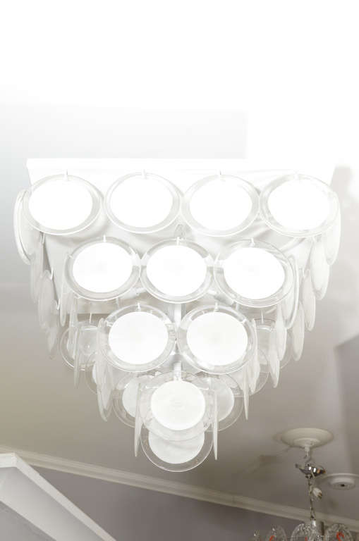 Custom flush mount white Murano disc lighting fixture in the manner of Vistosi. Currently out of stock but available for custom order in different sizes, glass colors, and finishes. The one shown with vintage white glass discs from 1970s and new custom frame. Inquire with Venfield about customization and estimated production lead times.