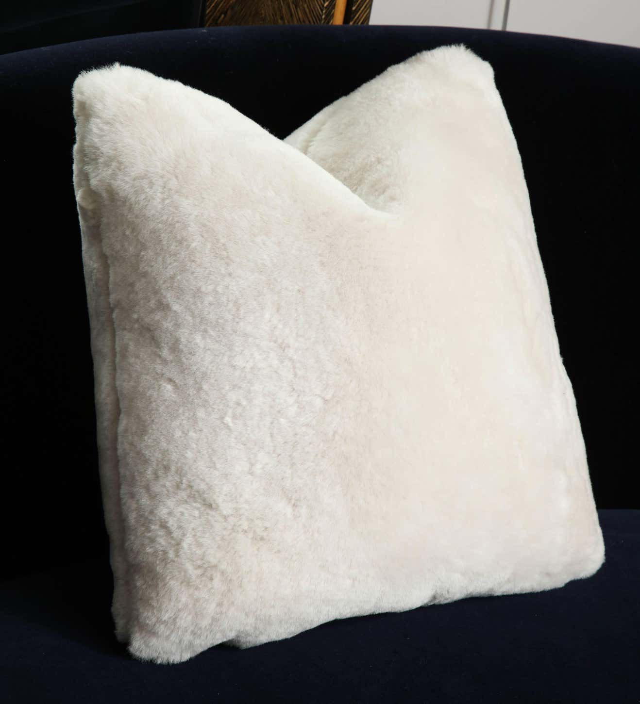 Custom 18" square genuine shearling pillow in white color. Currently out of stock but available for custom order in different sizes, colors, and fabrics. Inquire with Venfield about customization options and estimated production lead times.