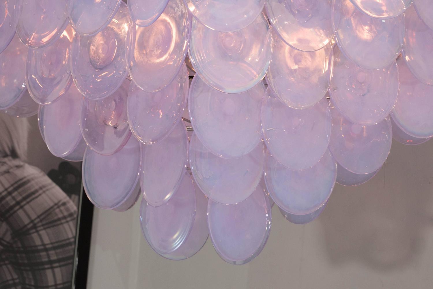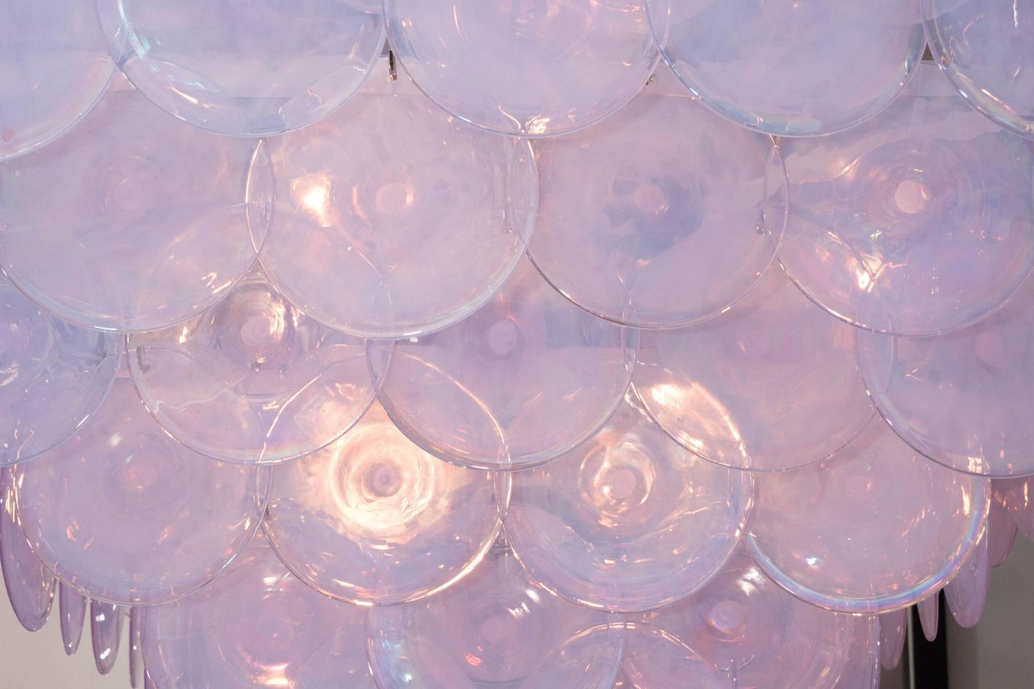 Custom huge Alex iridescent Murano glass disc chandelier in double pyramid shape and with polished stainless steel frame. Currently out of stock but available for custom order in various sizes, finishes, and glass colors. Inquire with Venfield about customization options and estimated production lead times.