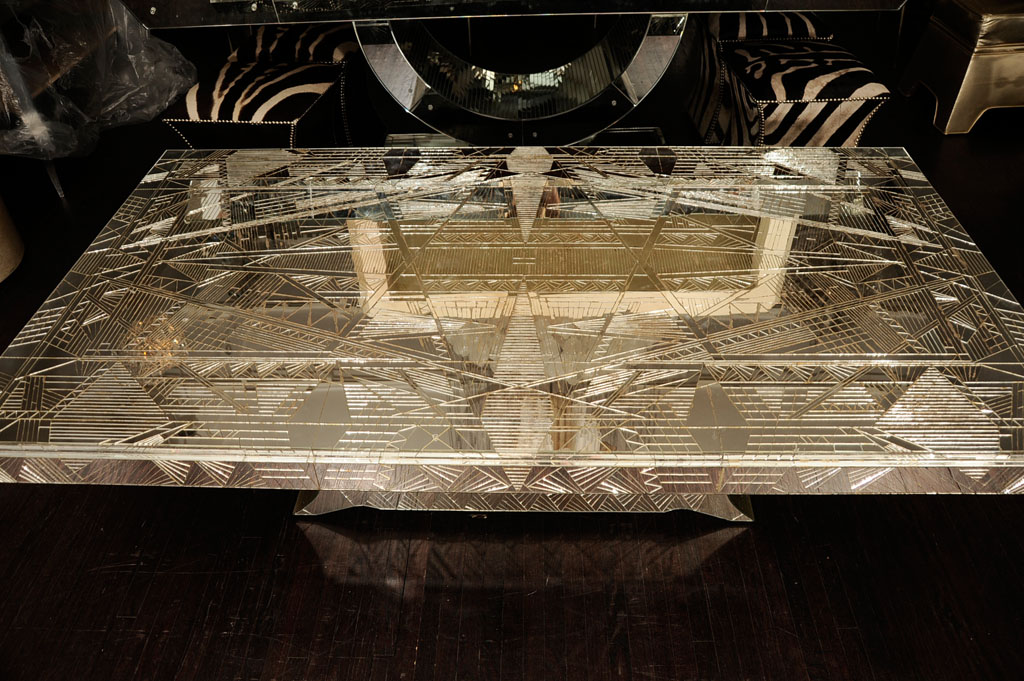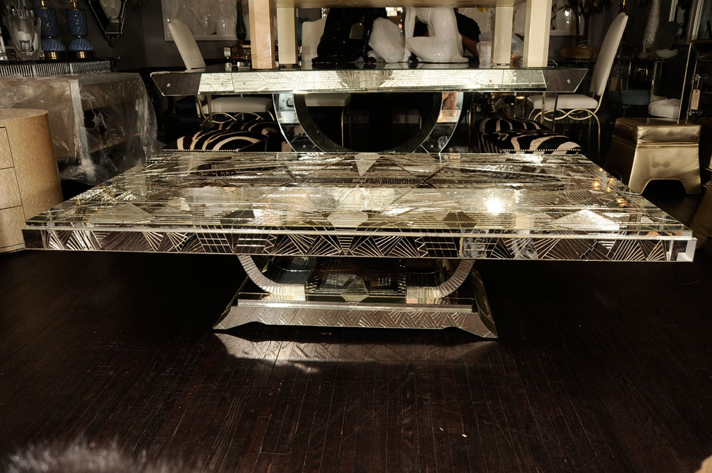 Custom-made majestic French Art Deco-style mirrored table. An extraordinary, stunning table piece with cut mirror glass in Art Deco style motif details, all done by hand. Currently out of stock but available for custom order. Customization is available in different sizes and shapes. Inquire with Venfield about estimated production lead times.