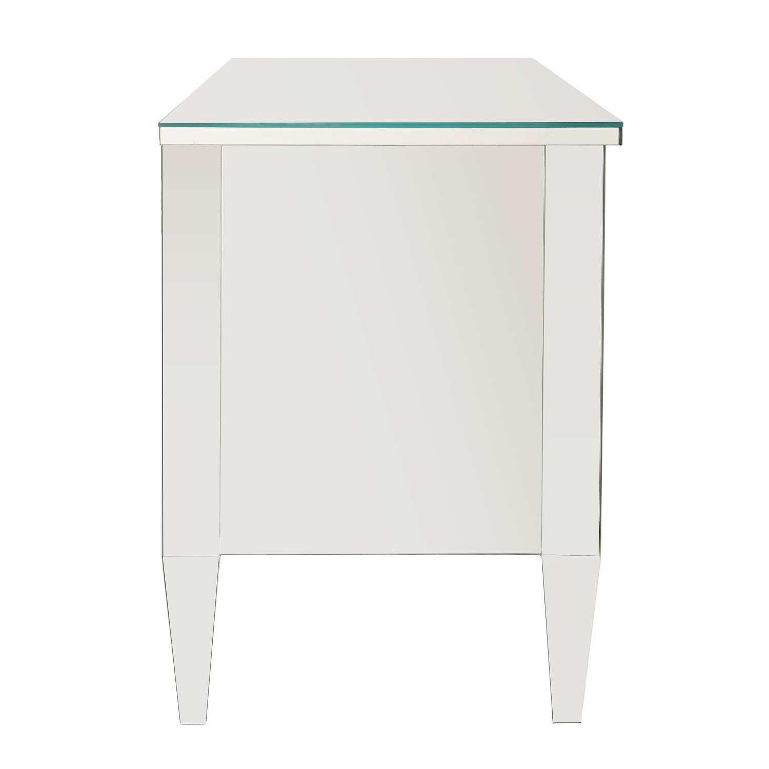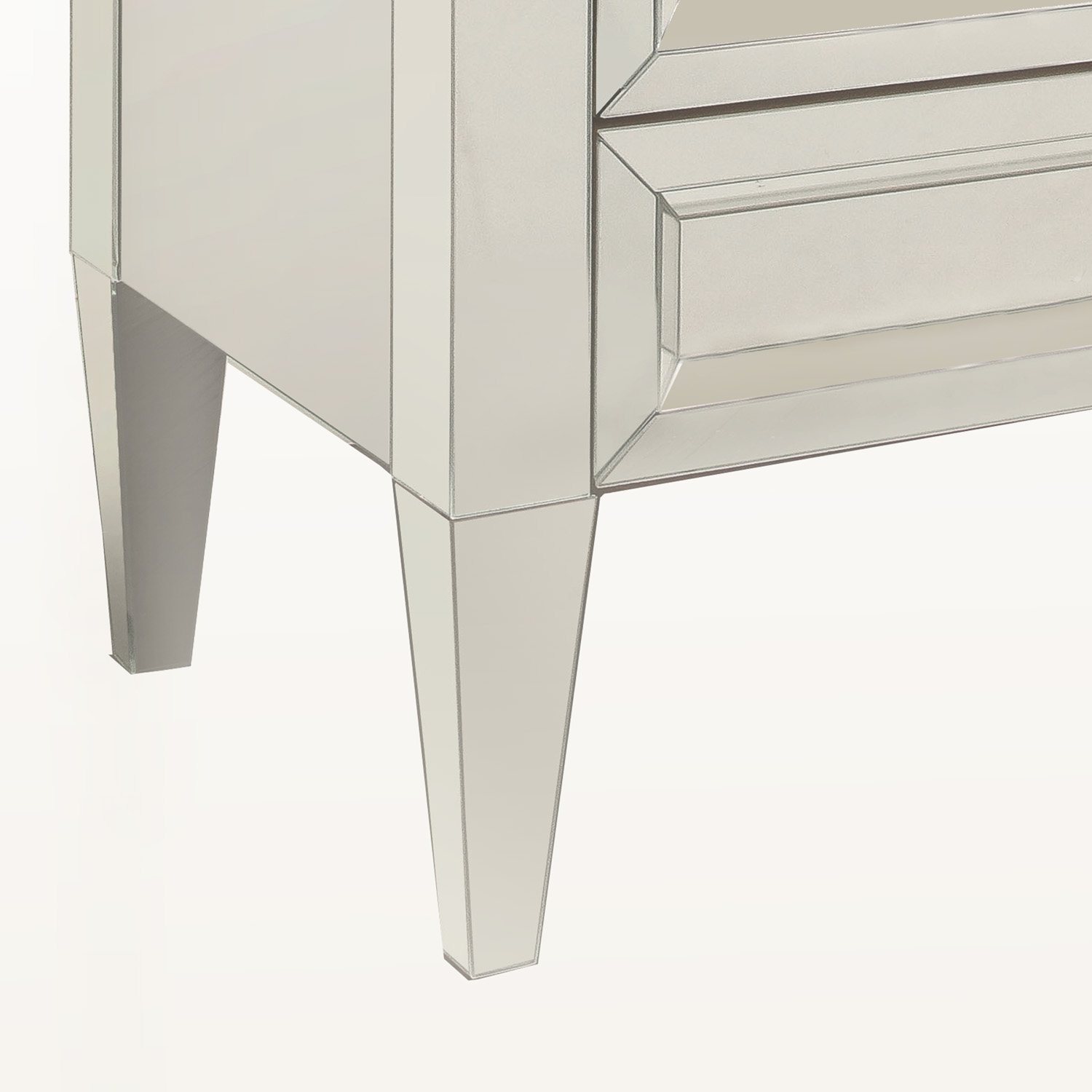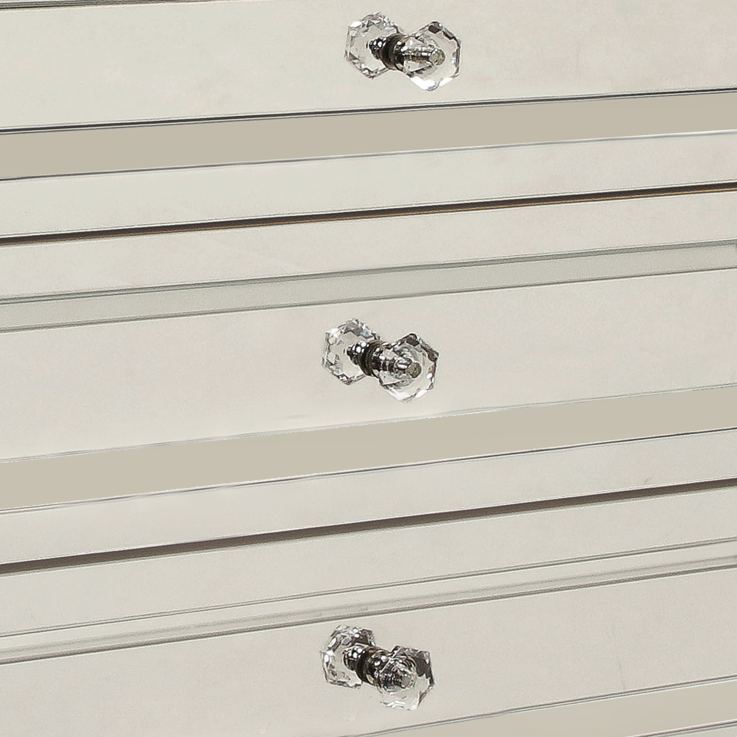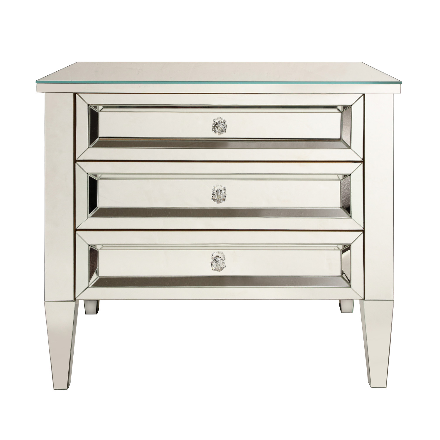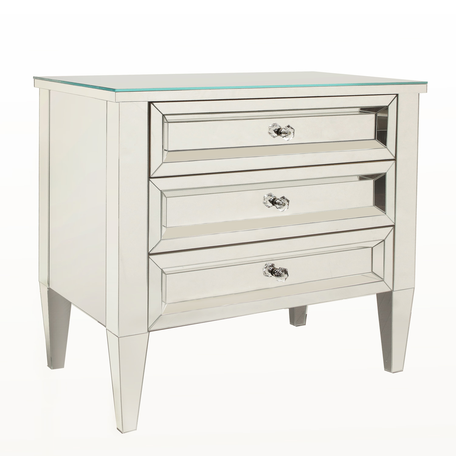 Made to order, custom mirrored three drawer chest with faceted crystal drawer pulls. Designed by Venfield, NYC. Please inquire with Venfield for custom orders. This piece is currently available as pictured in our NYC showroom.
