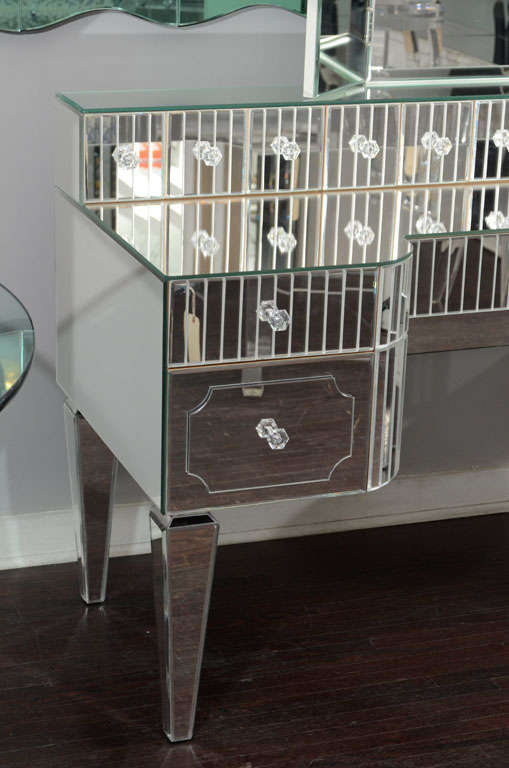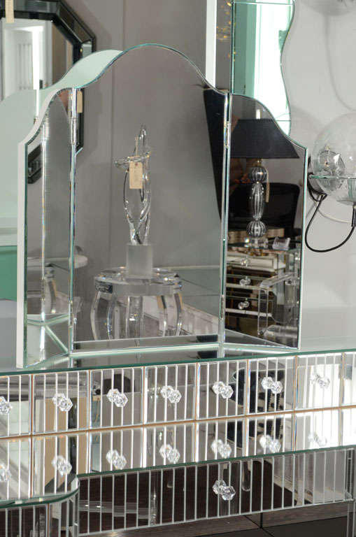 Custom mirrored vanity with triptych mirror and baguette details
