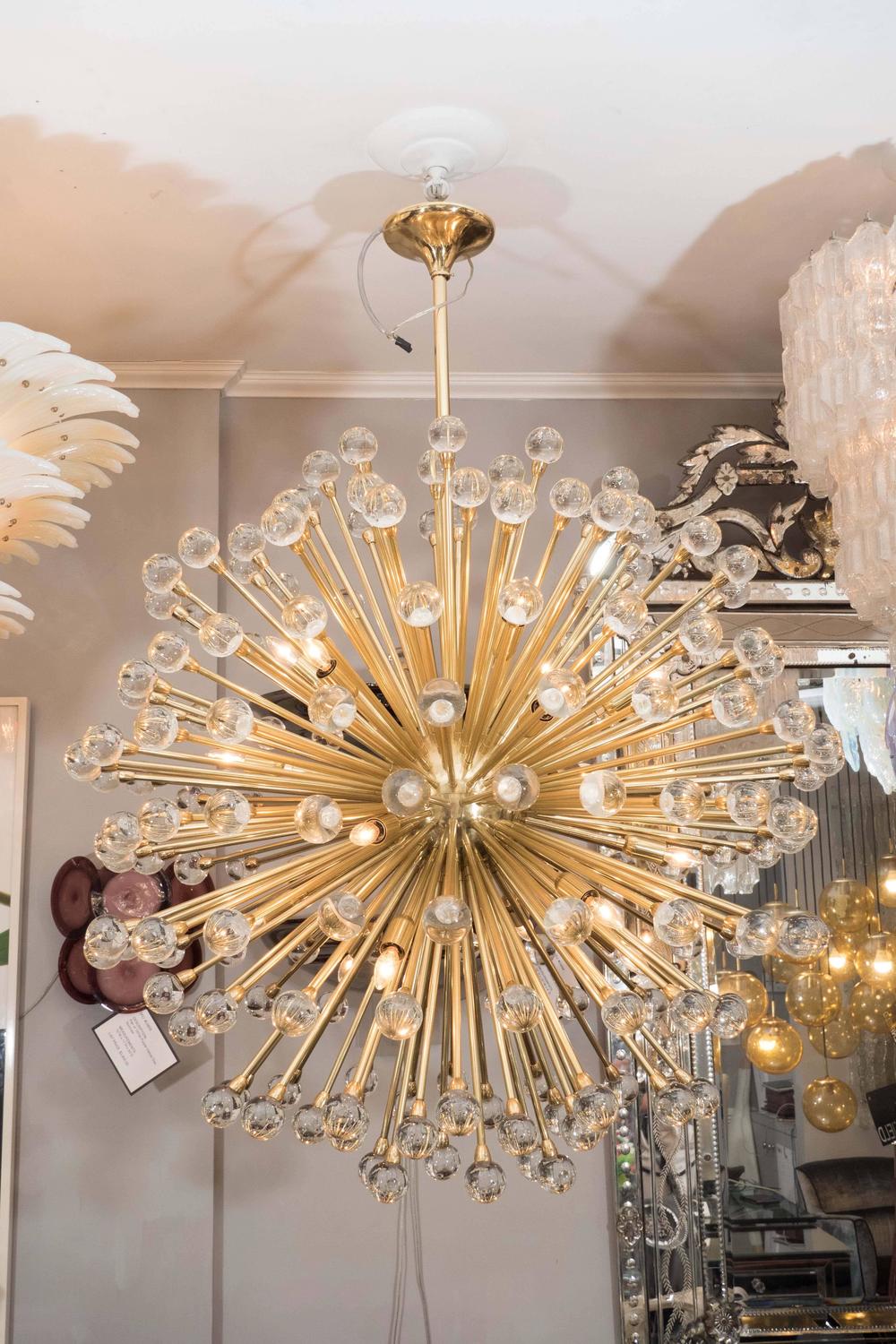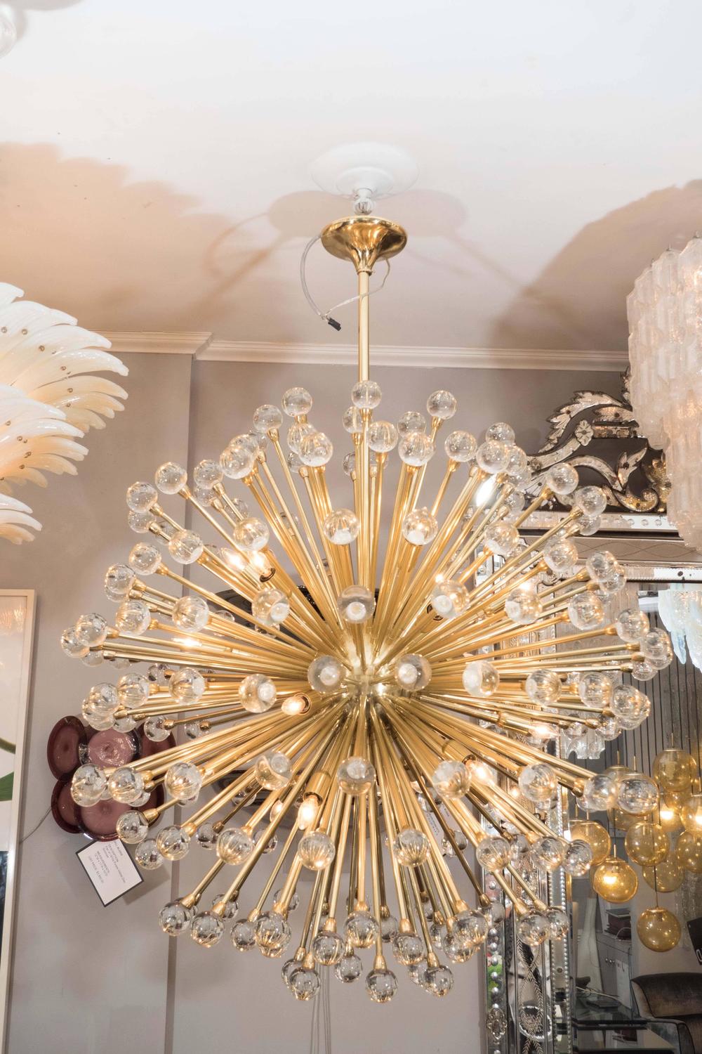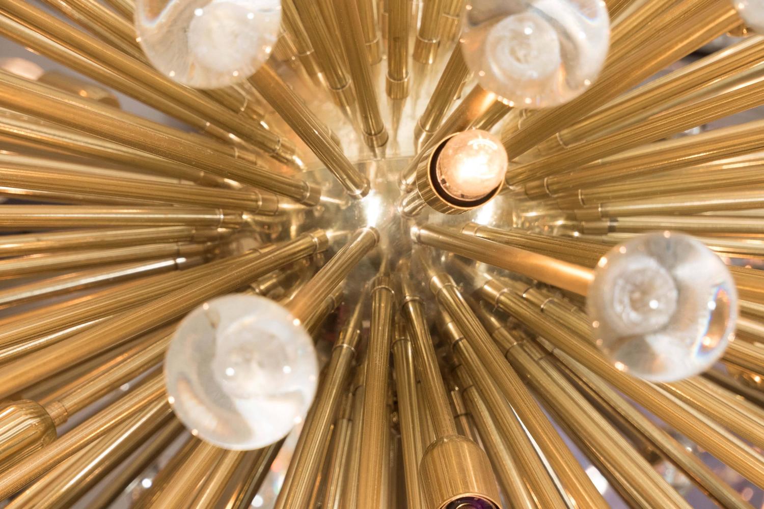 Custom Murano glass ball sputnik chandelier in polished brass finish. There are 15 candelabra light base sockets can take up to 60W/each. Currently out of stock but available for custom order. Customization is available in different sizes and finishes. Please specify the overall Inquire with Venfield about estimated production lead times.