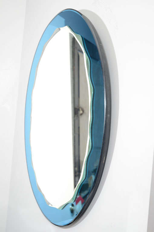 Custom oval wave mirror in cerulean blue mirror frame. Currently out of stock but available for custom order. Customization available in different sizes, shapes, and mirror colors. Inquire with Venfield about estimated production lead times.
