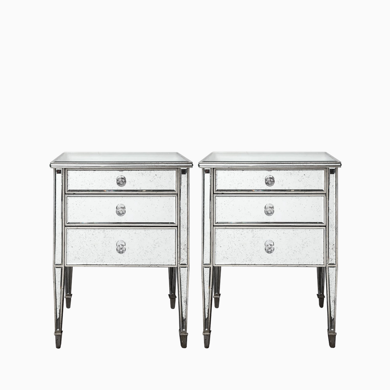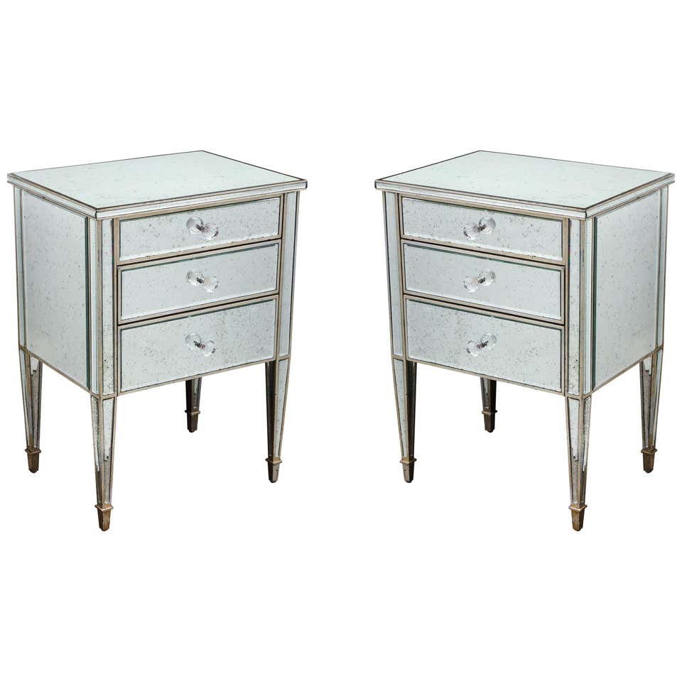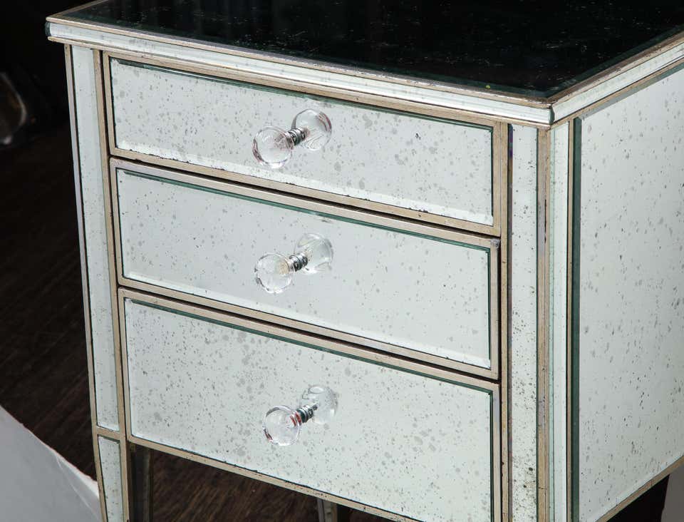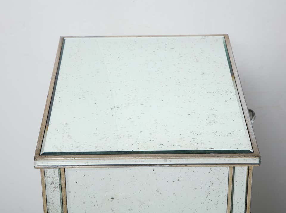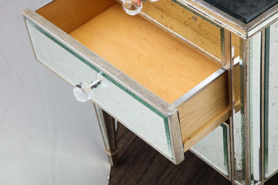 Made-to-order, custom pair of antique mirrored nightstands with silver gilt trim. Currently out of stock but available for custom order. Please inquire with Venfield about customization and estimated production lead times.
