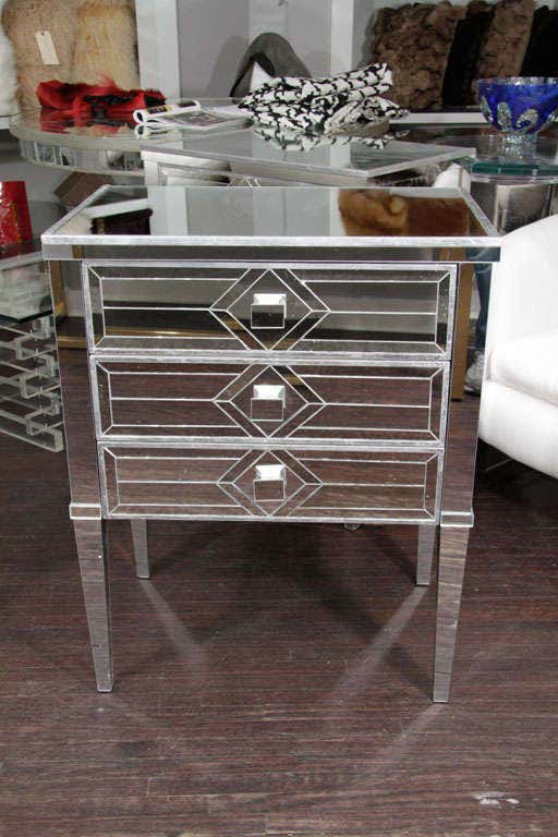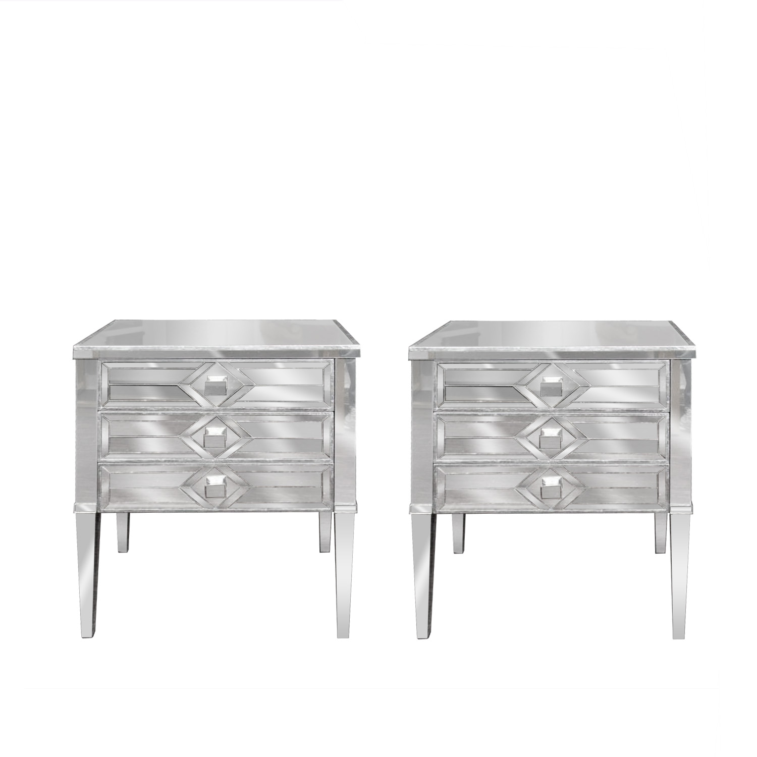 Made to order, custom pair of Neoclassical stye 3-drawer mirrored nightstands with diamond pattern drawer fronts and silver trim detail. Please inquire with Venfield for custom orders.