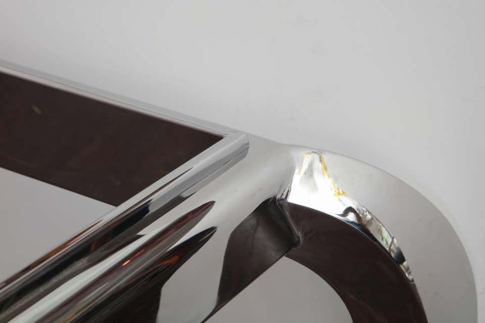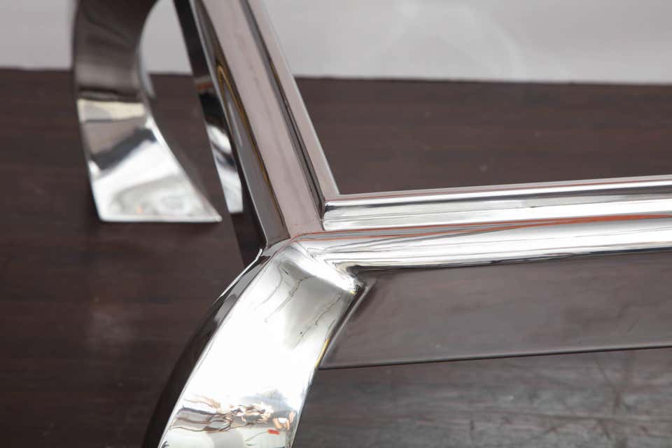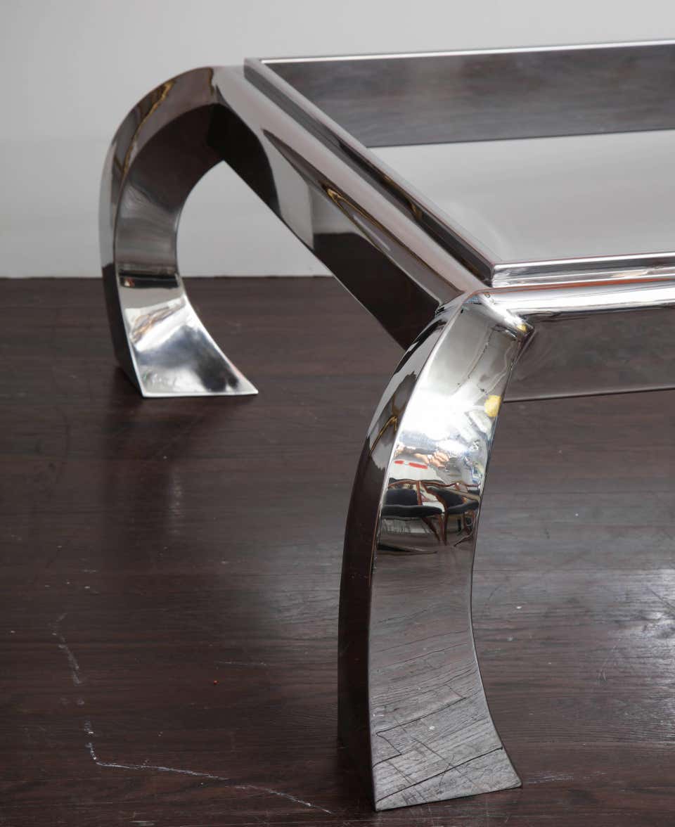 Custom polished nickel cocktail table with glass top. Customization is available in different sizes, finishes and glass color options.