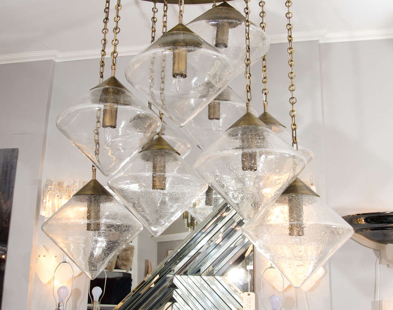 Custom prism globe chandelier in antique brass finish. Currently out of stock but available for custom order. Customization available in different sizes, glass colors, and finishes. Inquire with Venfield about estimated production lead times.